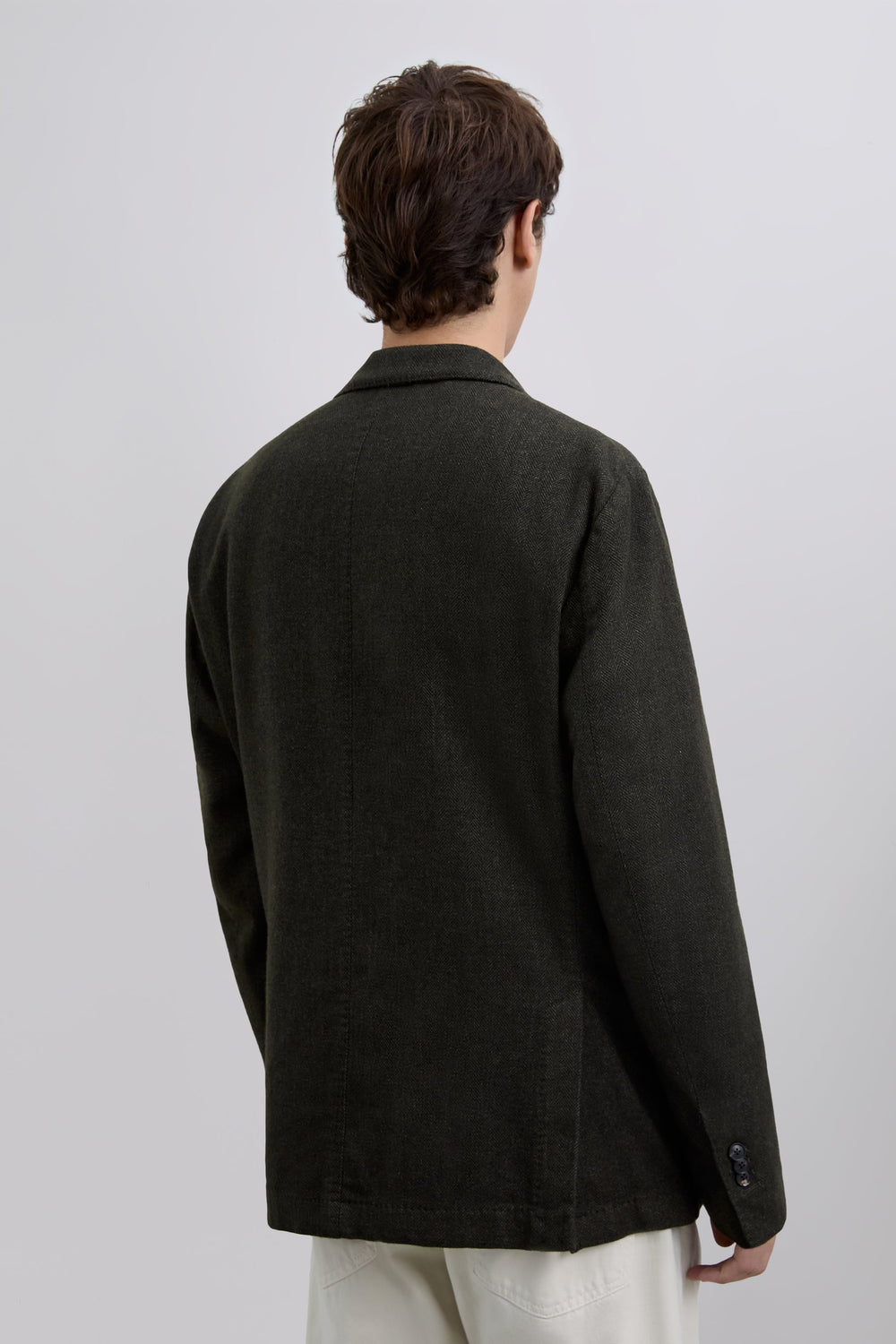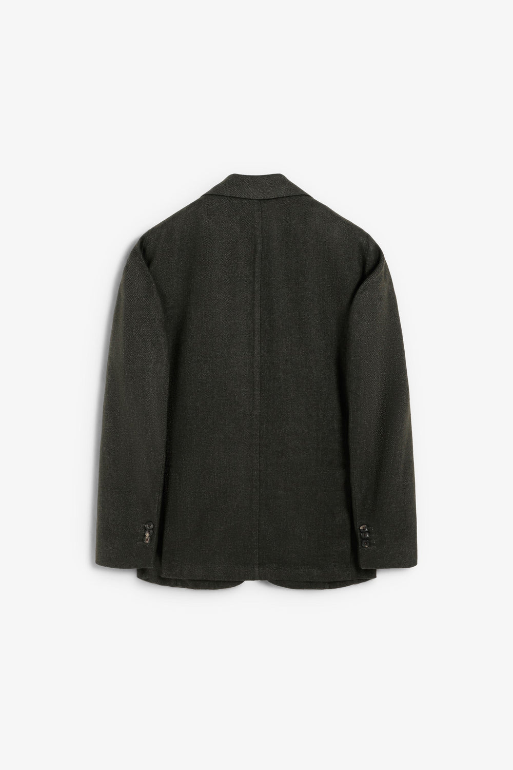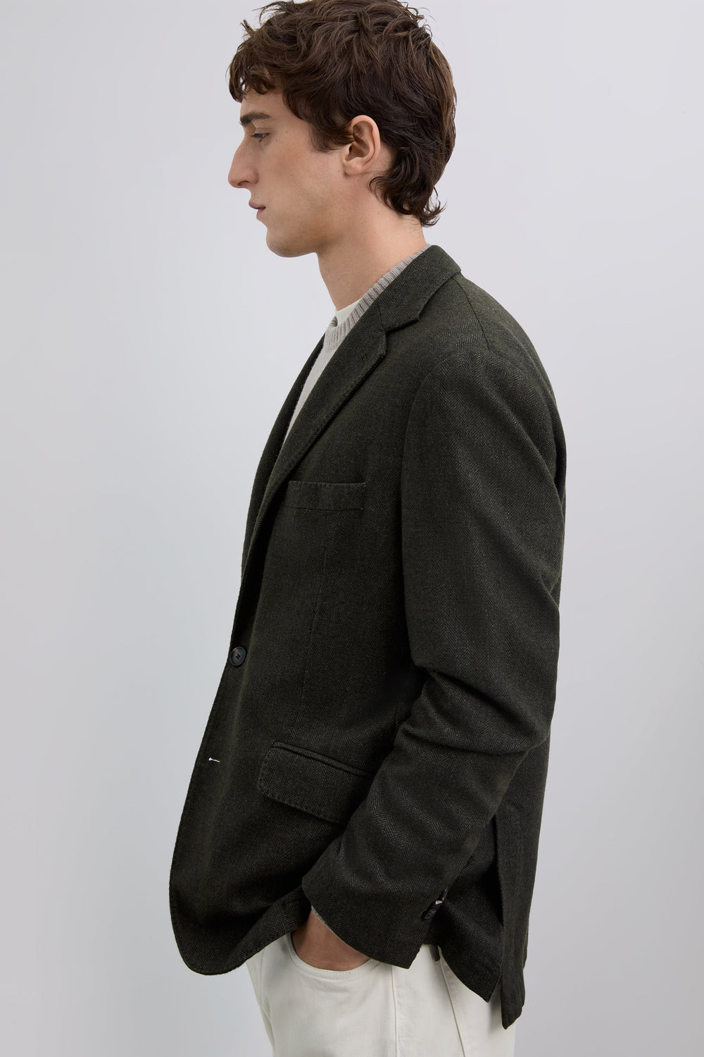 Blazer confecionado em lã. Design em espiga. Três bolsos com aba. Fecho de duplo botão. Bolso no peito com debrum. Manga comprida.