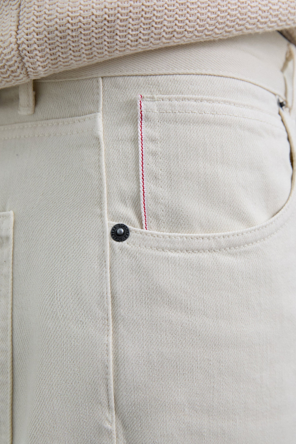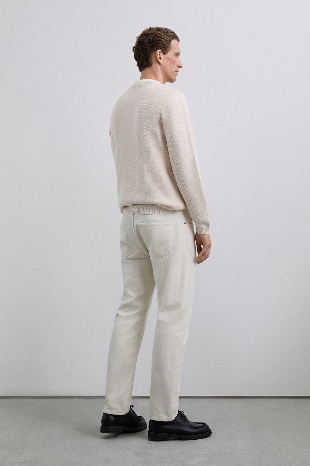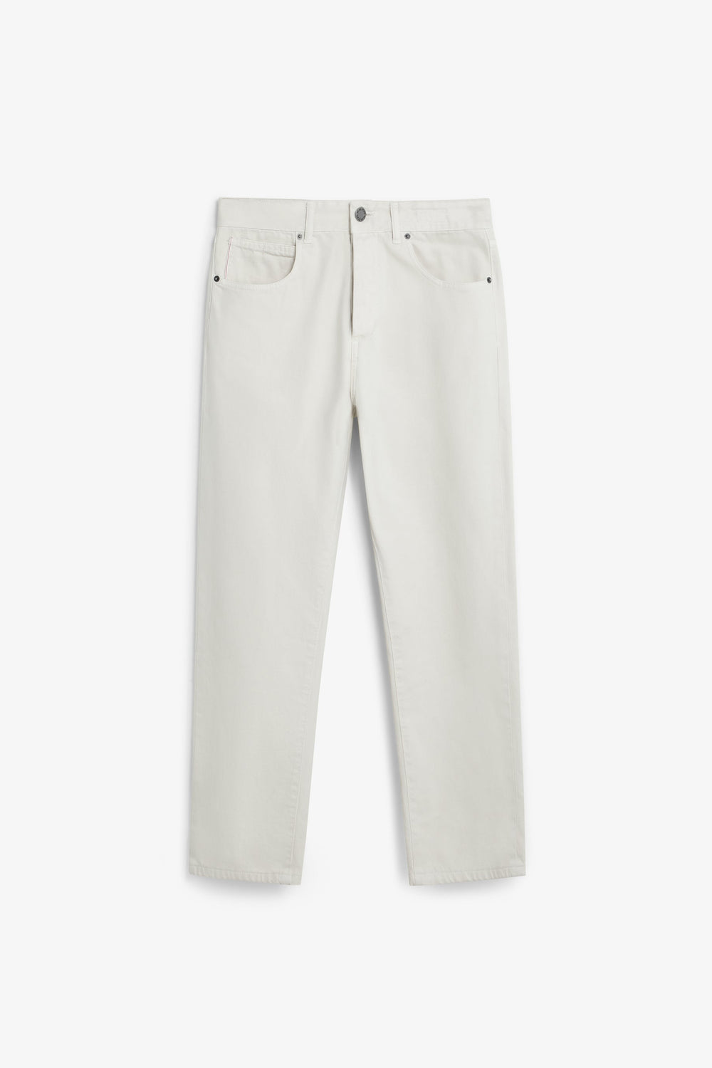 Calças direitas confecionadas em 100% algodão. Bolsos à frente e atrás. Fecho com botão e zip. Presilhas na cintura. Pormenores de etiquetas com logótipo na cintura e no bolso.