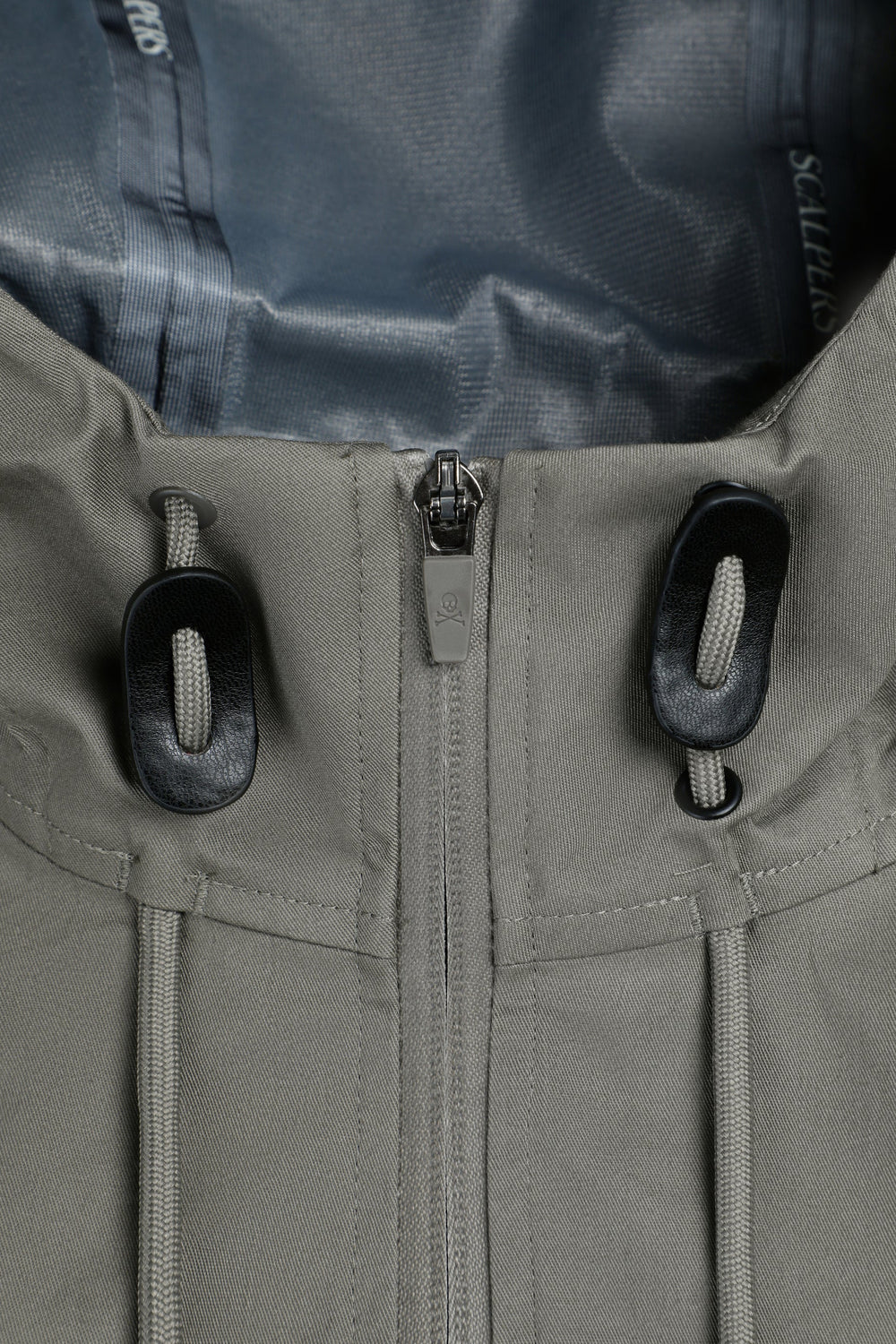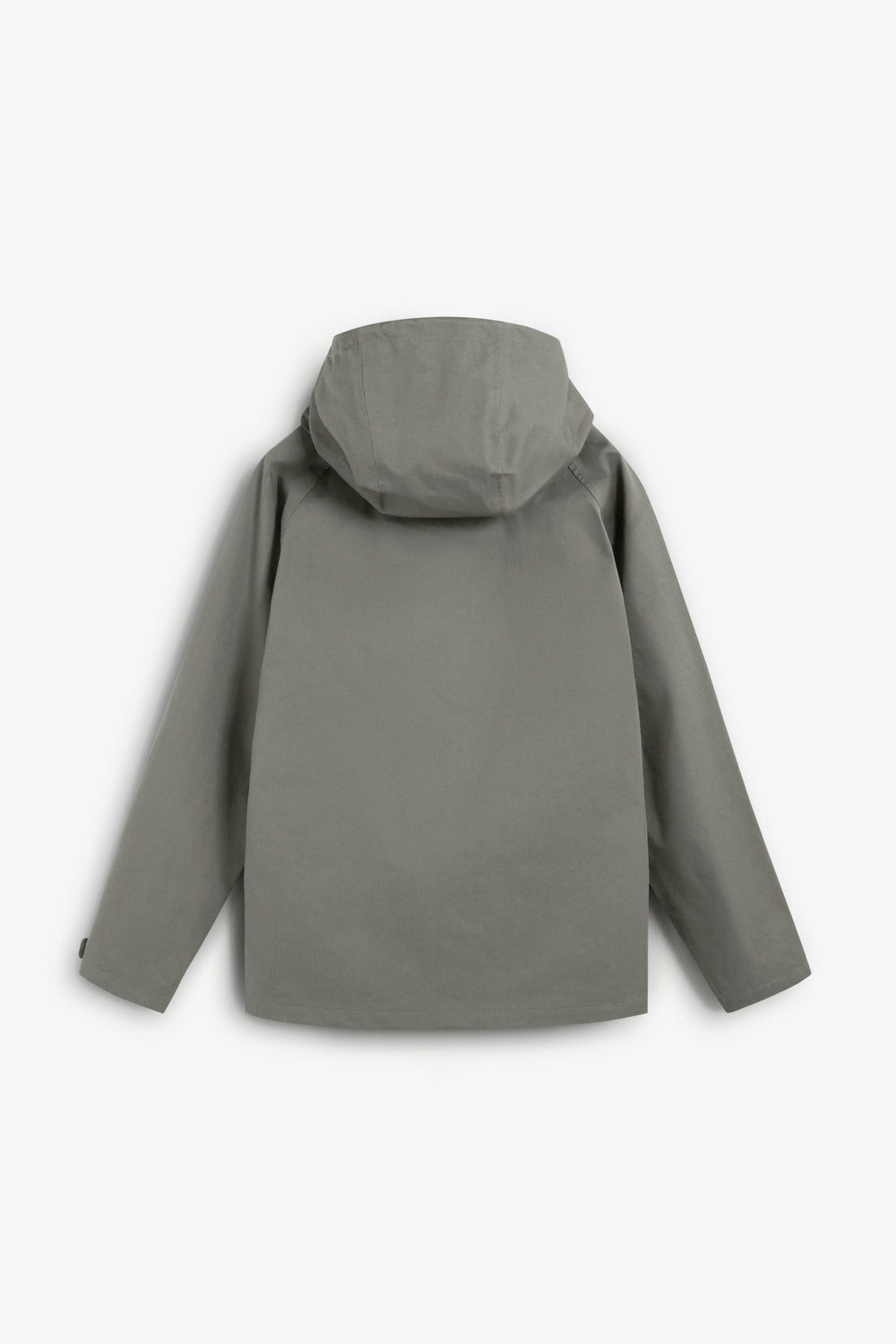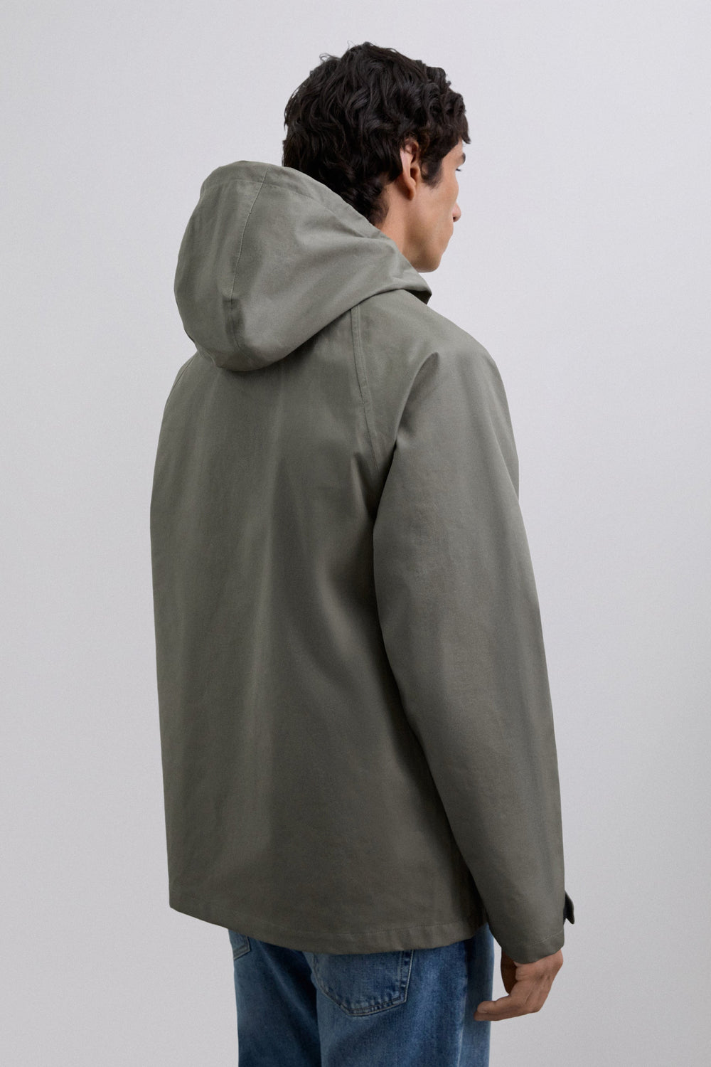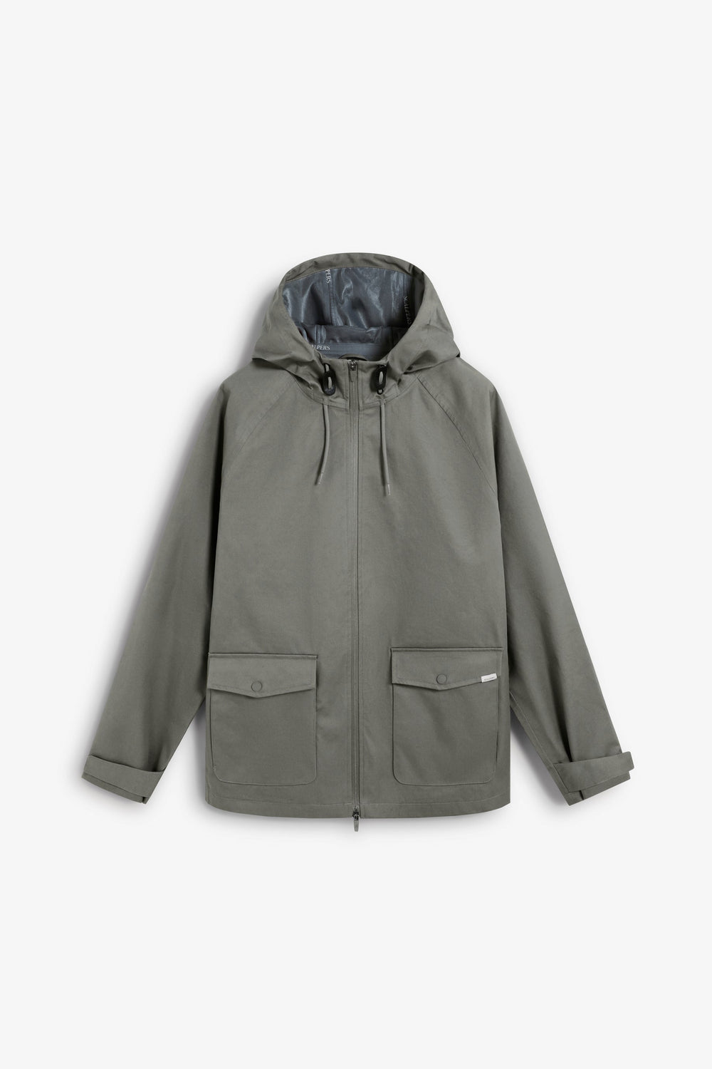 Cardigan técnico impermeável confecionado em 100% algodão. Capuz ajustável com cordão de ajuste e pormenor em pele. Mangas raglã. Ajustadores de punho com velcro. Fecho frontal com fecho de correr termosselado de duplo puxador e alfinetes personalizados. Dois bolsos frontais com aba e dupla entrada, superior e lateral, com fechos de alfinete. Pormenor de etiqueta com logótipo no bolso frontal.