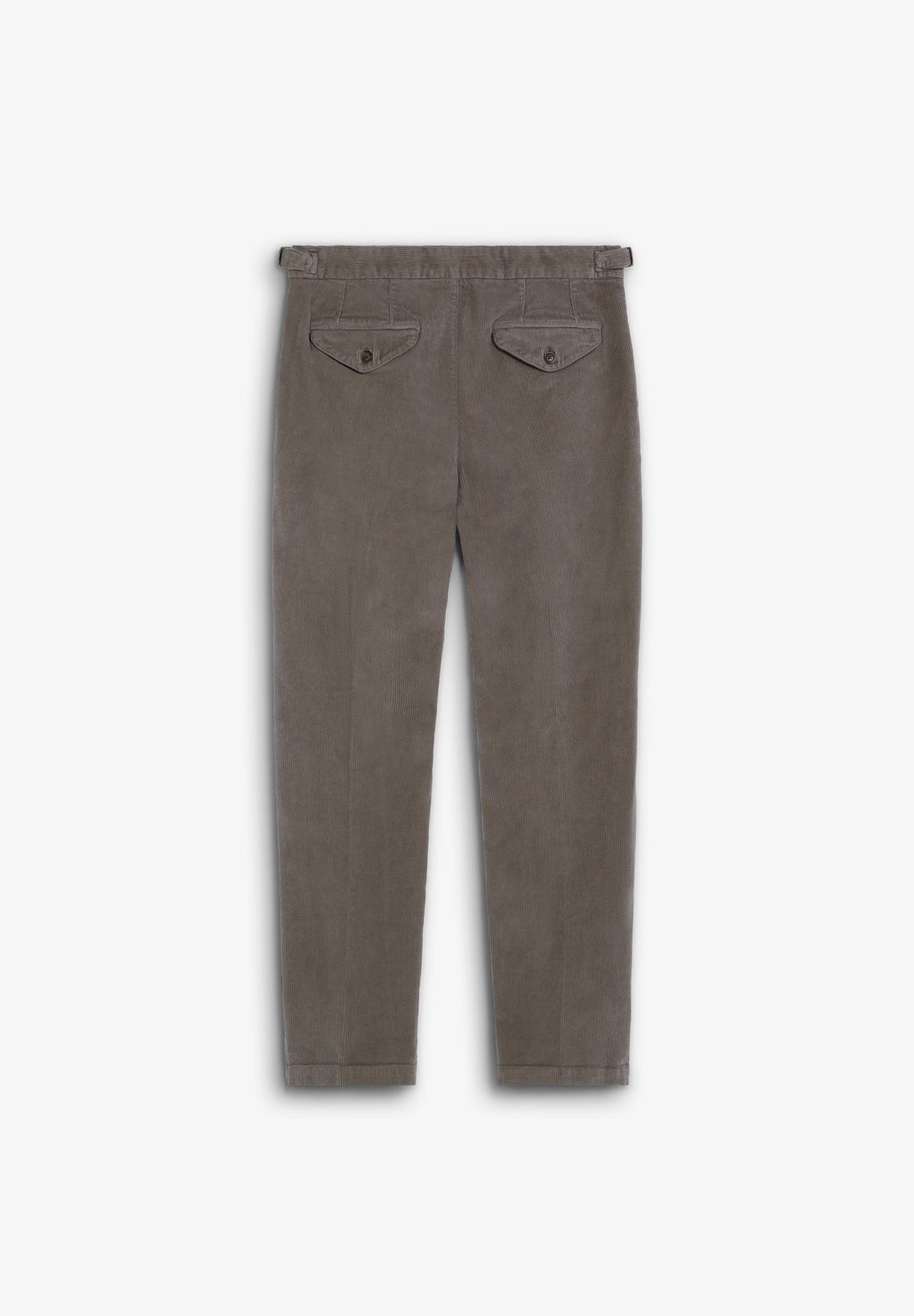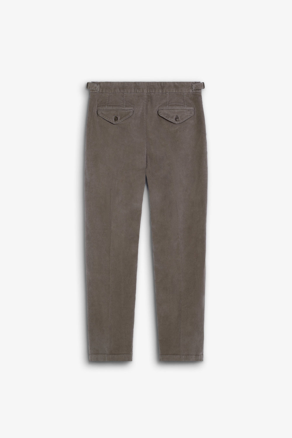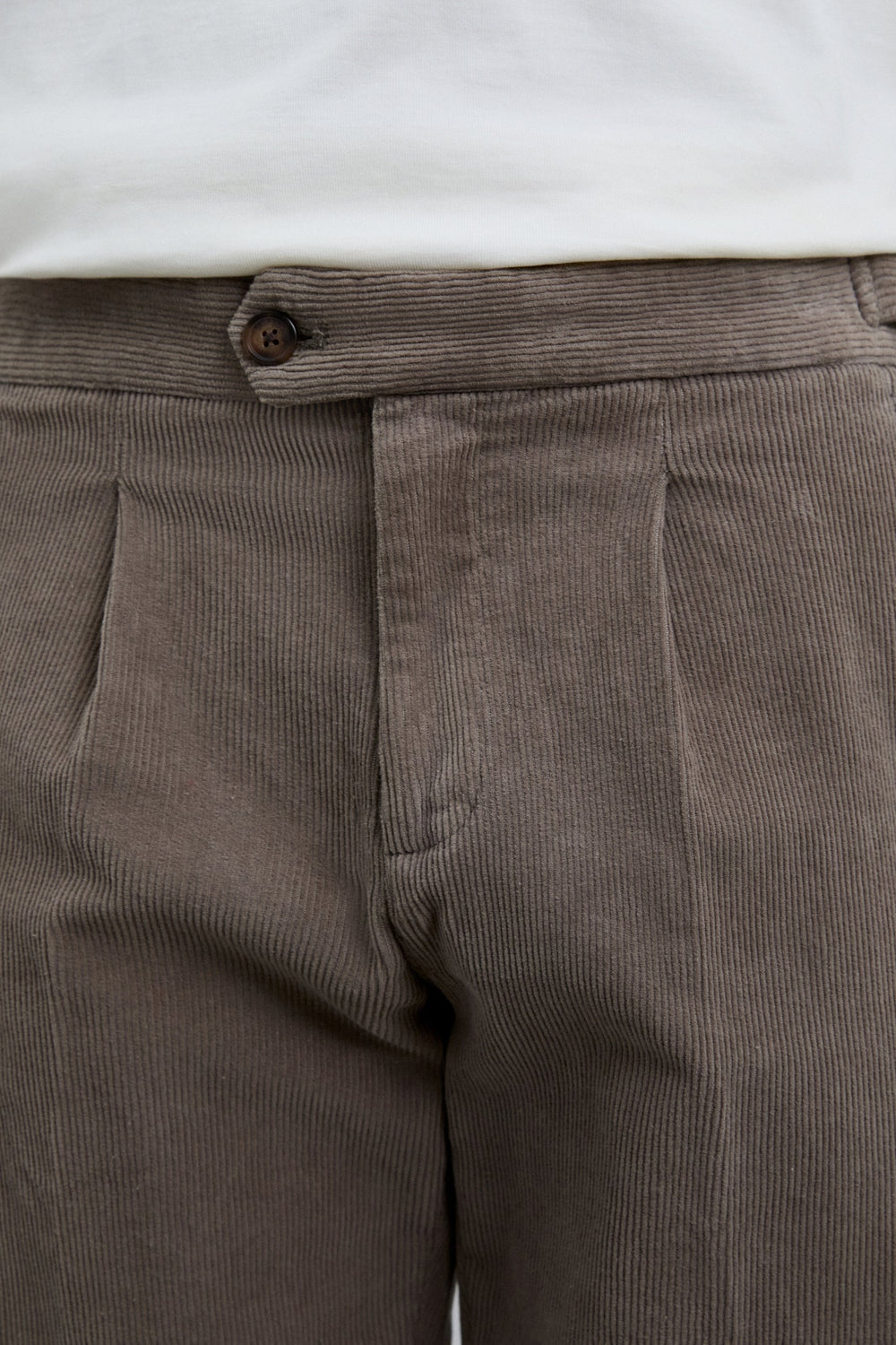 Calças de pinças de bombazina confecionadas em algodão BCI. Slim Fit. Ajustes de metal nos lados da cintura, fecho com botão e fecho de correr. Dois bolsos frontais e dois traseiros com fecho de botão.