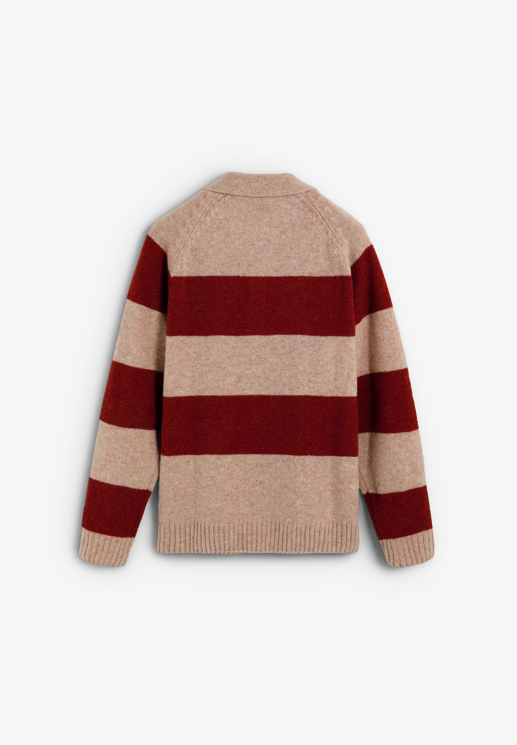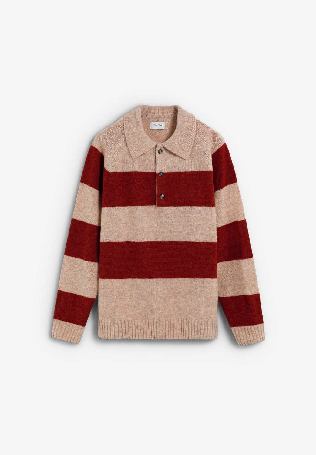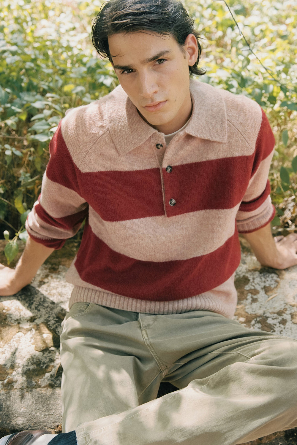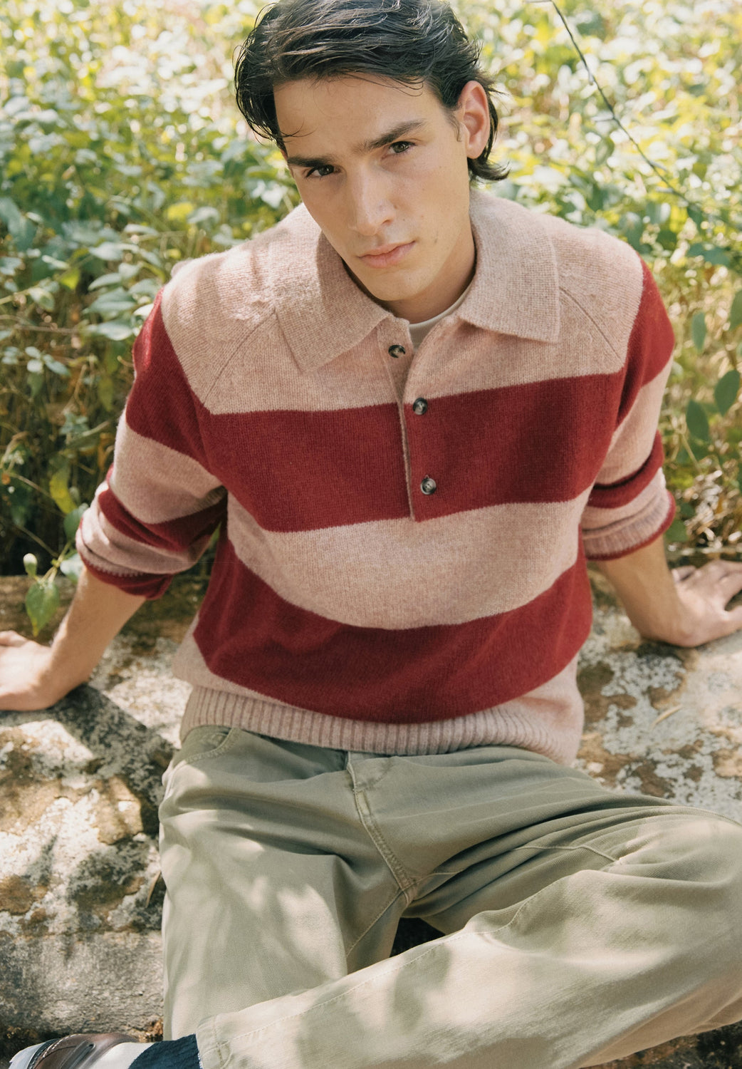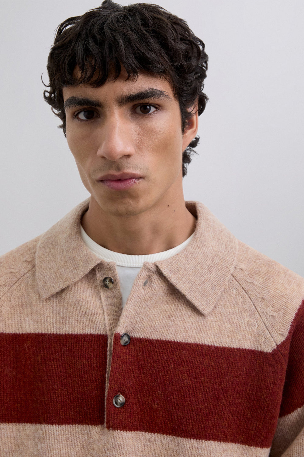 Sweater confecionada em 100% Lã. Gola de camisa polo com fecho de botões. Padrão às riscas. Manga comprida. Regular fit.