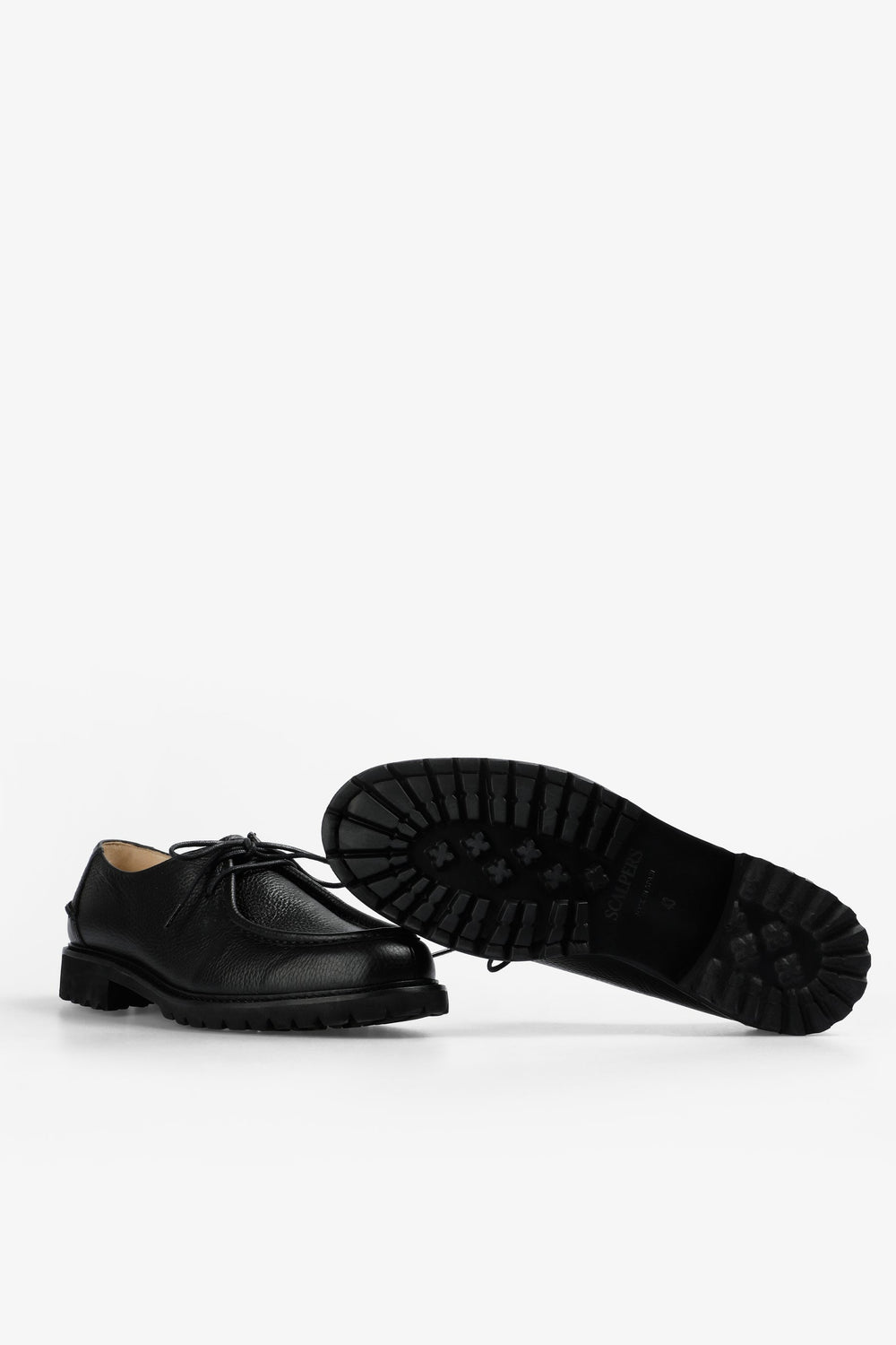 Sapatos confecionados em 100% pele. Pormenor de acabamento de pele em toda a parte superior / na língua. Etiqueta tecida na aba do calcanhar e palmilha de caucho antiderrapante. Fecho com cordões.