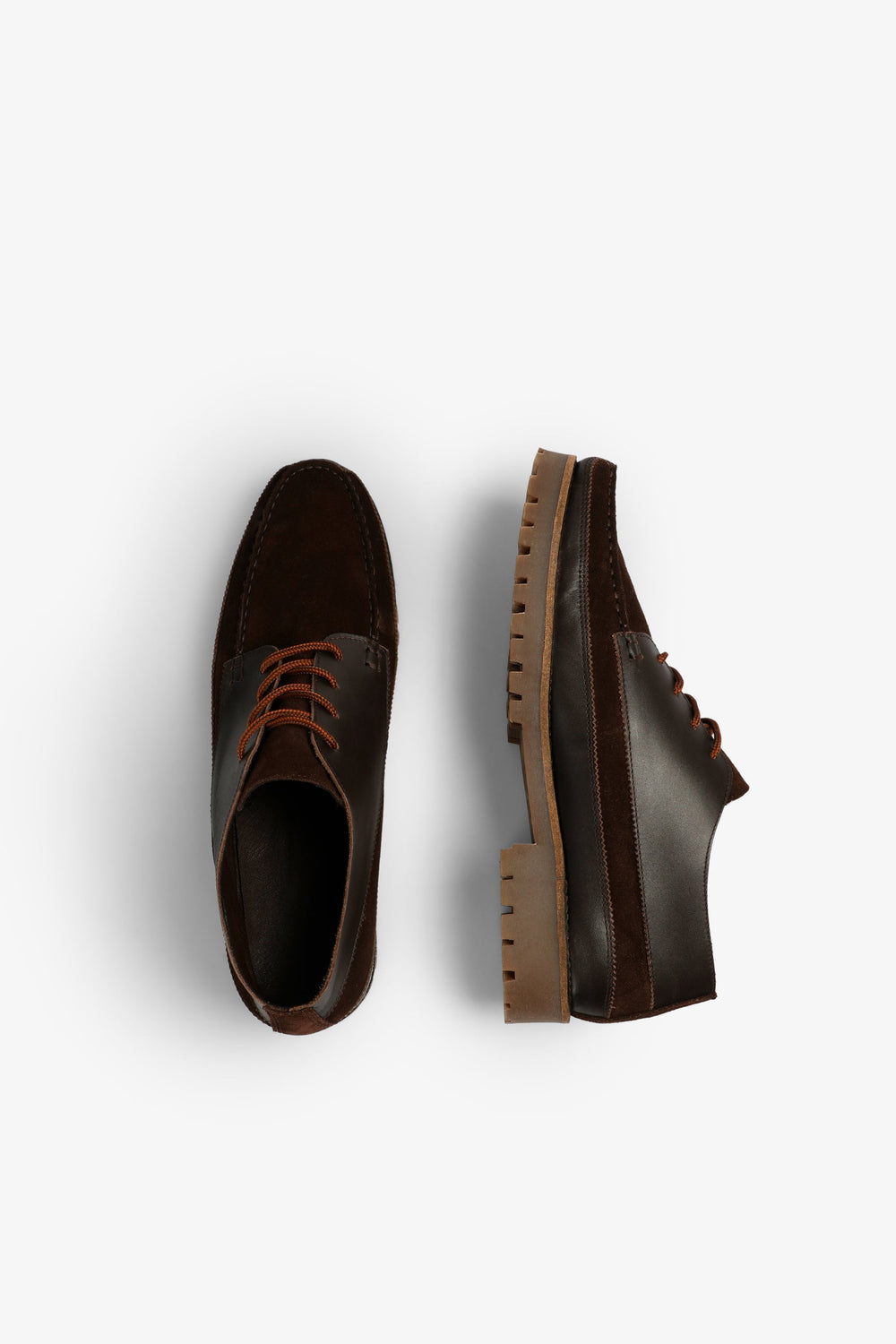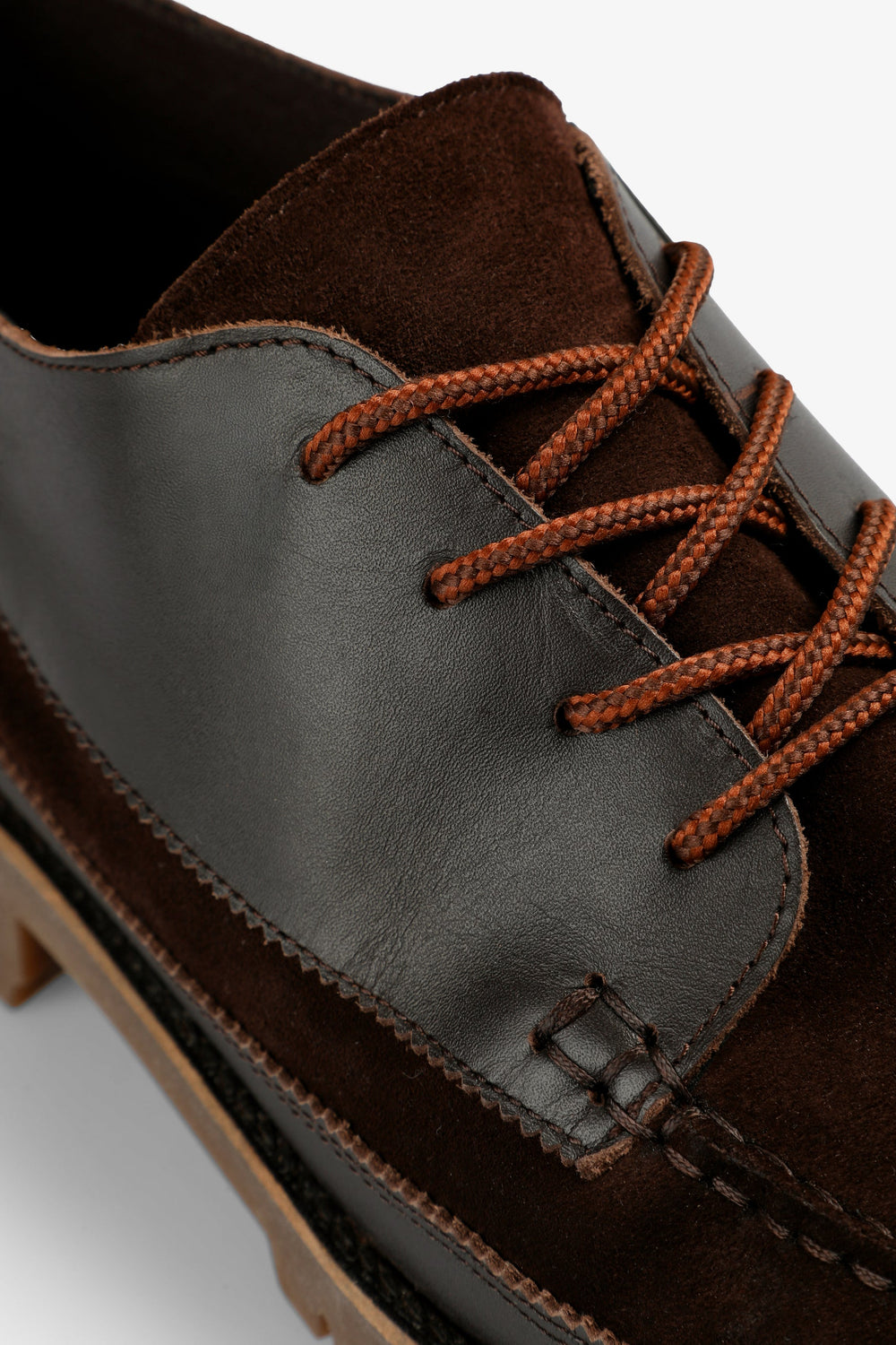 Sapatos confecionados em 100% pele bovina. Fecho com cordões em contraste. Pormenor de etiqueta no calcanhar. Sola dentada.
