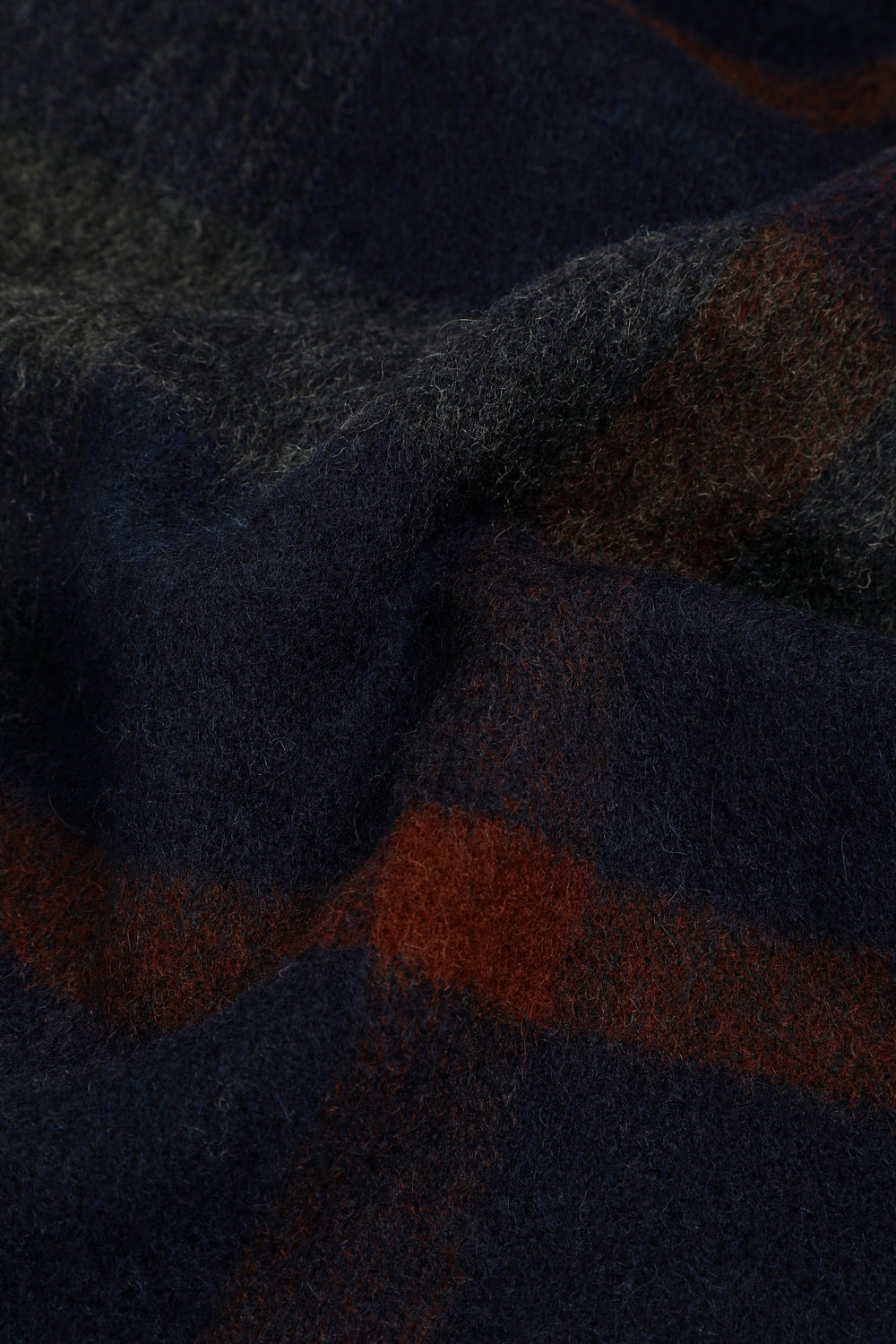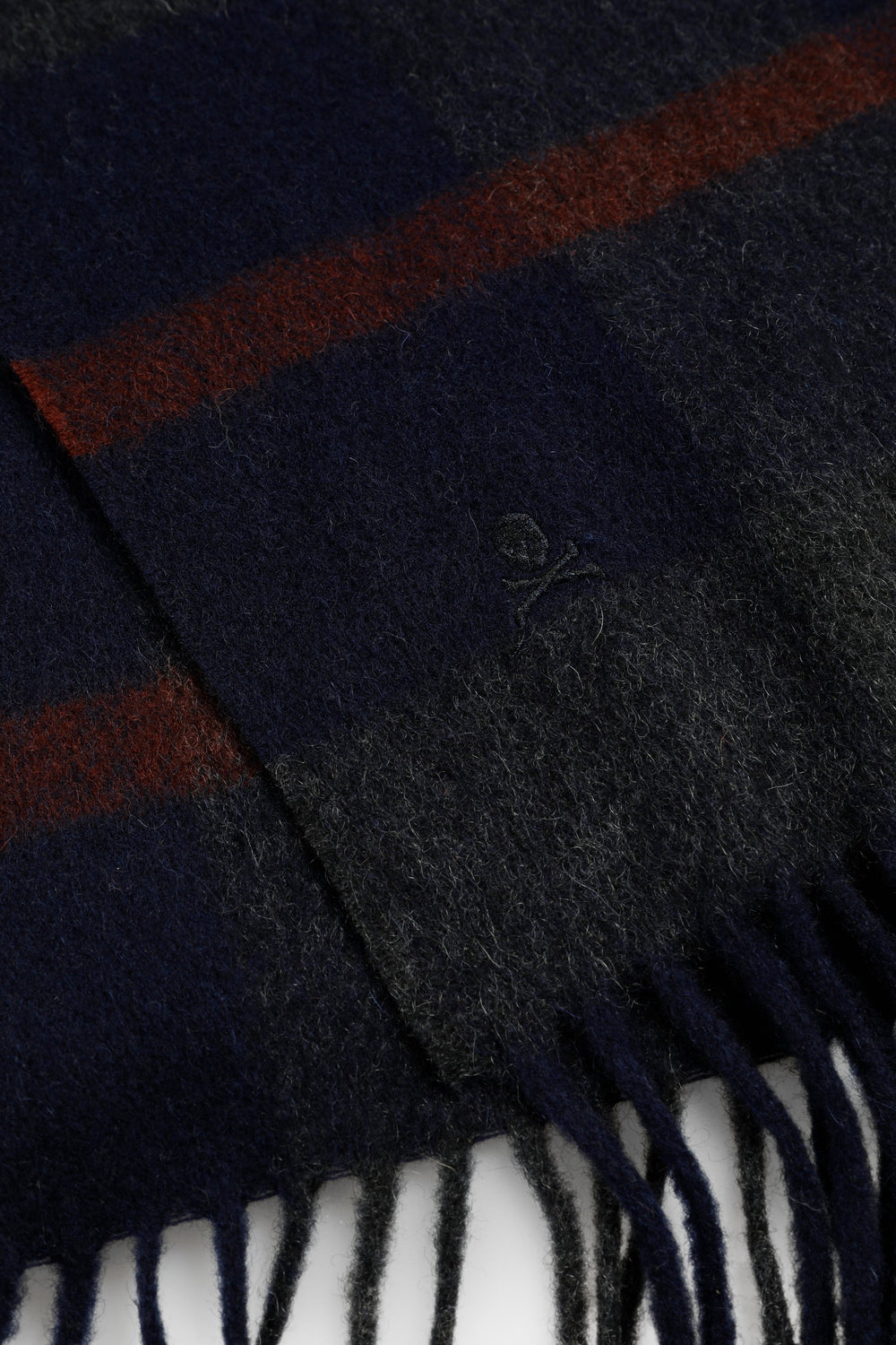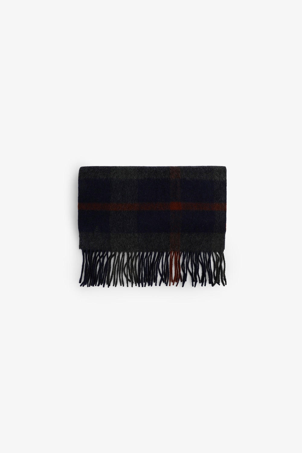 Cachecol confecionado em mistura de lã e caxemira. Padrão de tartã. Franjas. Logótipo bordado. Pormenor de etiqueta.