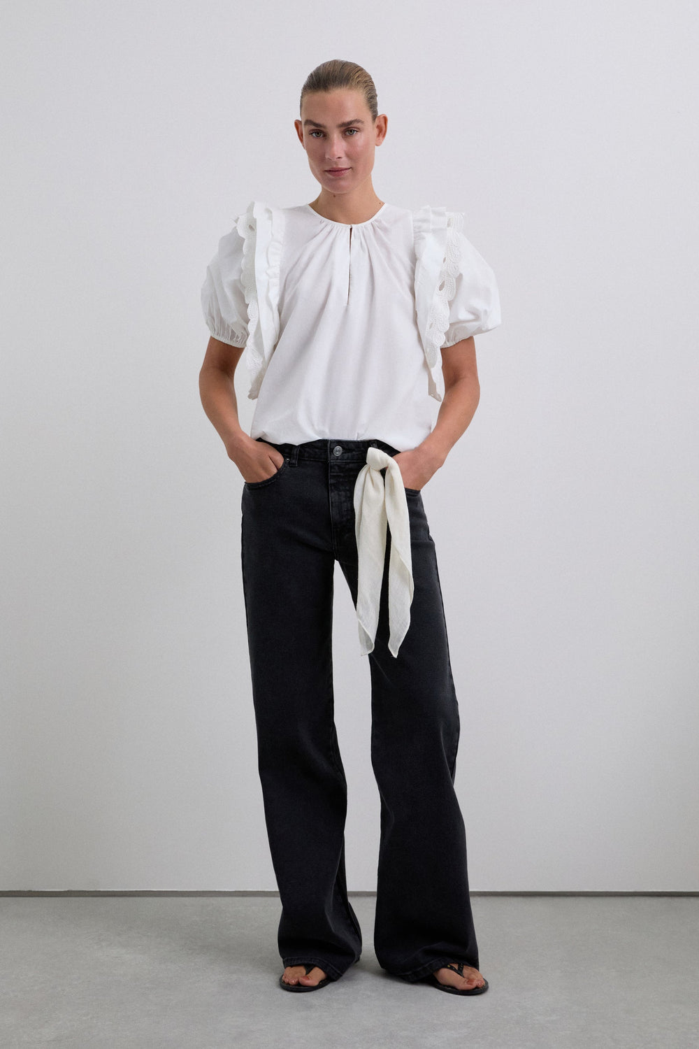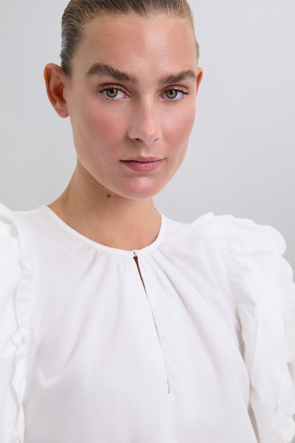 Top branco confecionado em 100% algodão BCI. Corte regular fit, forro interior, decote redondo e manga abalonada.