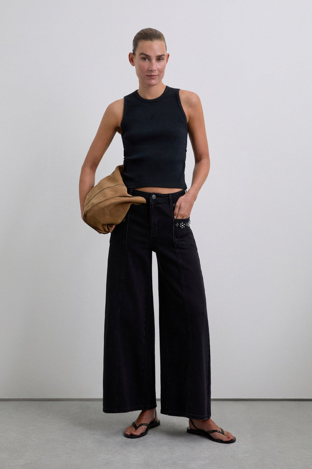 Calças jeans confecionadas em 99% algodão. Fecho com botão e zip à frente. Detalhe de tachas na zona da cintura à frente e atrás.