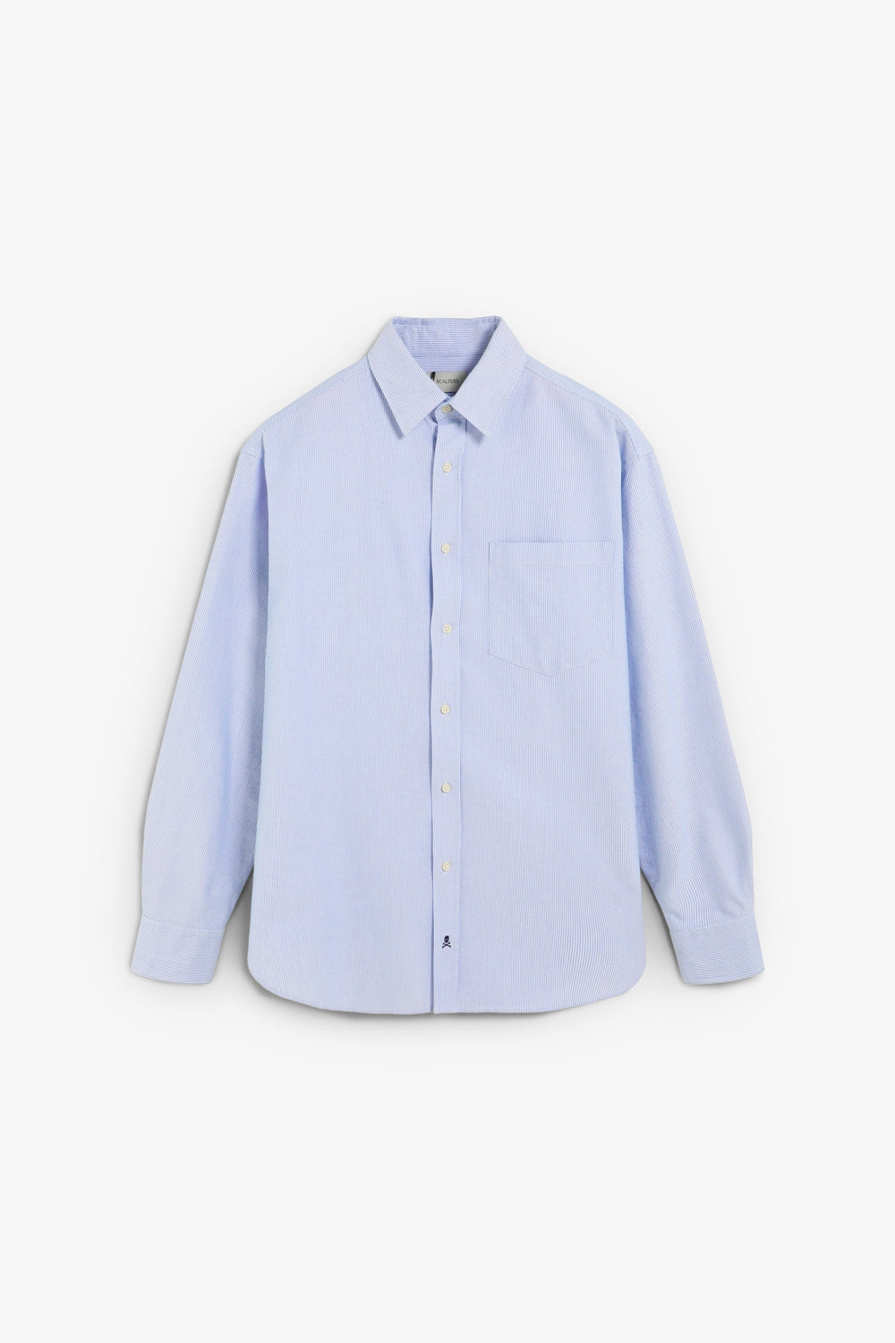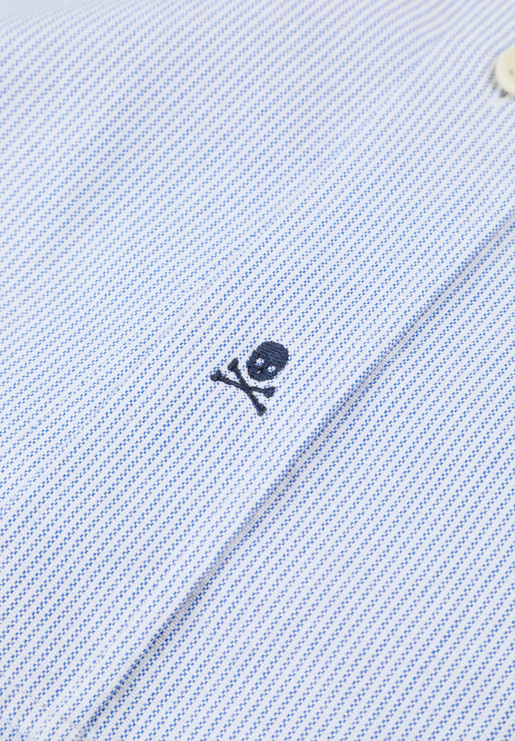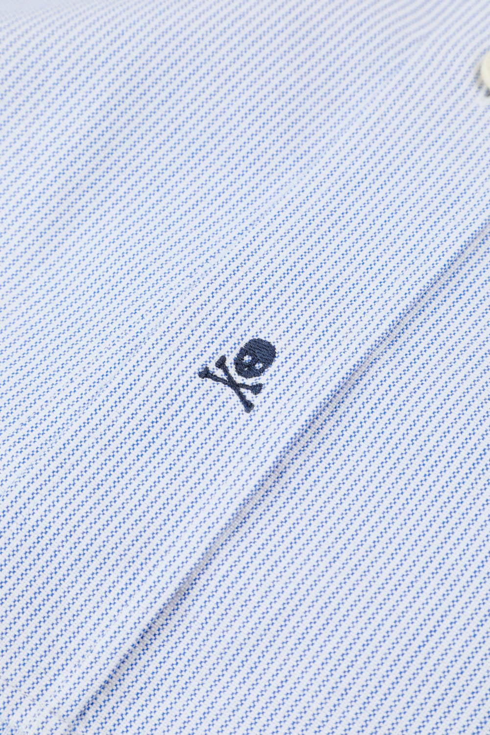 Camisa confecionada em tecido 100% algodão BCI. Padrão às riscas. Pormenor de bolso no peito. Manga comprida. Fecho frontal e nos punhos com abotoadura. Pormenor de skull bordada em contraste na parte inferior frontal.