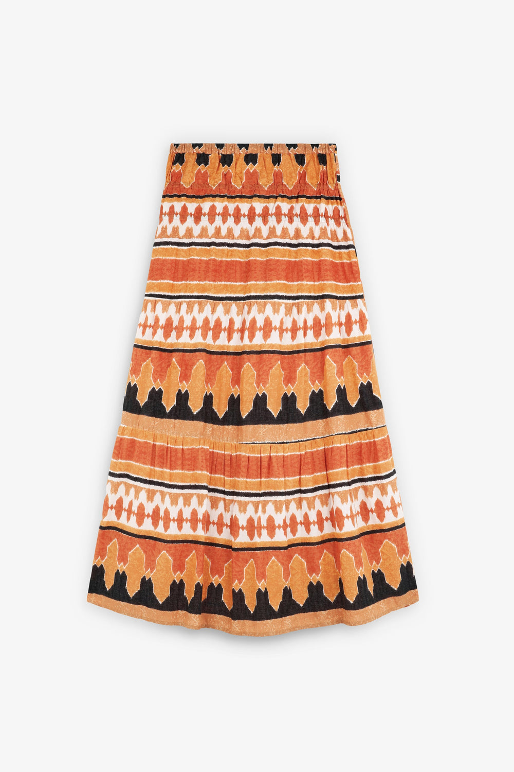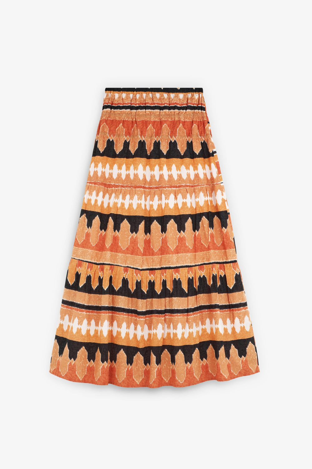 Saia estampada confecionada em tecido 100% algodão BCI. Cintura levemente elástica. Corte evasé.
