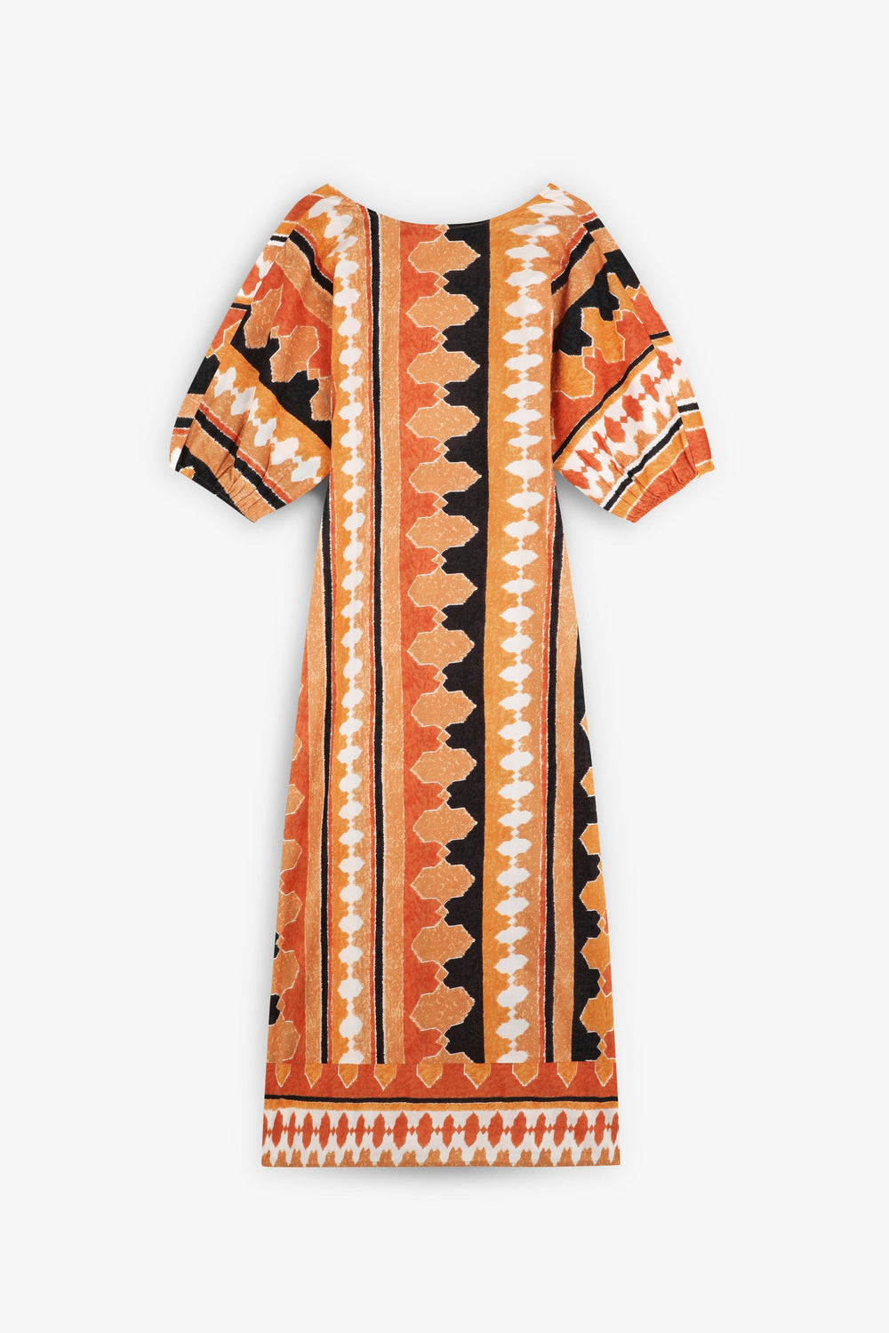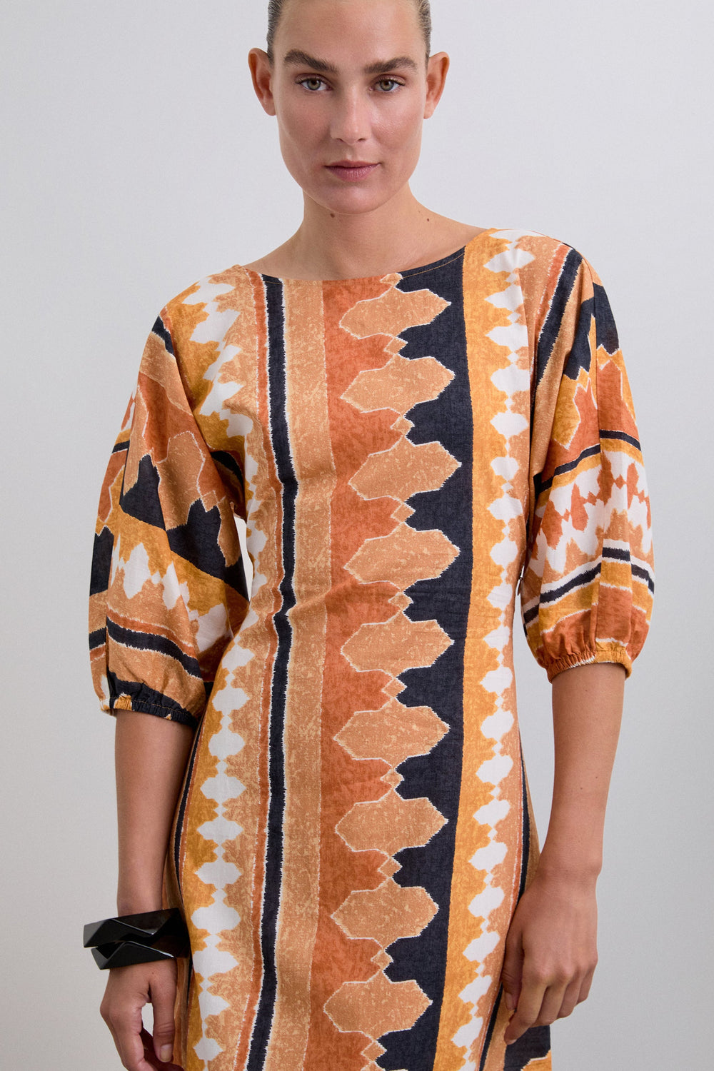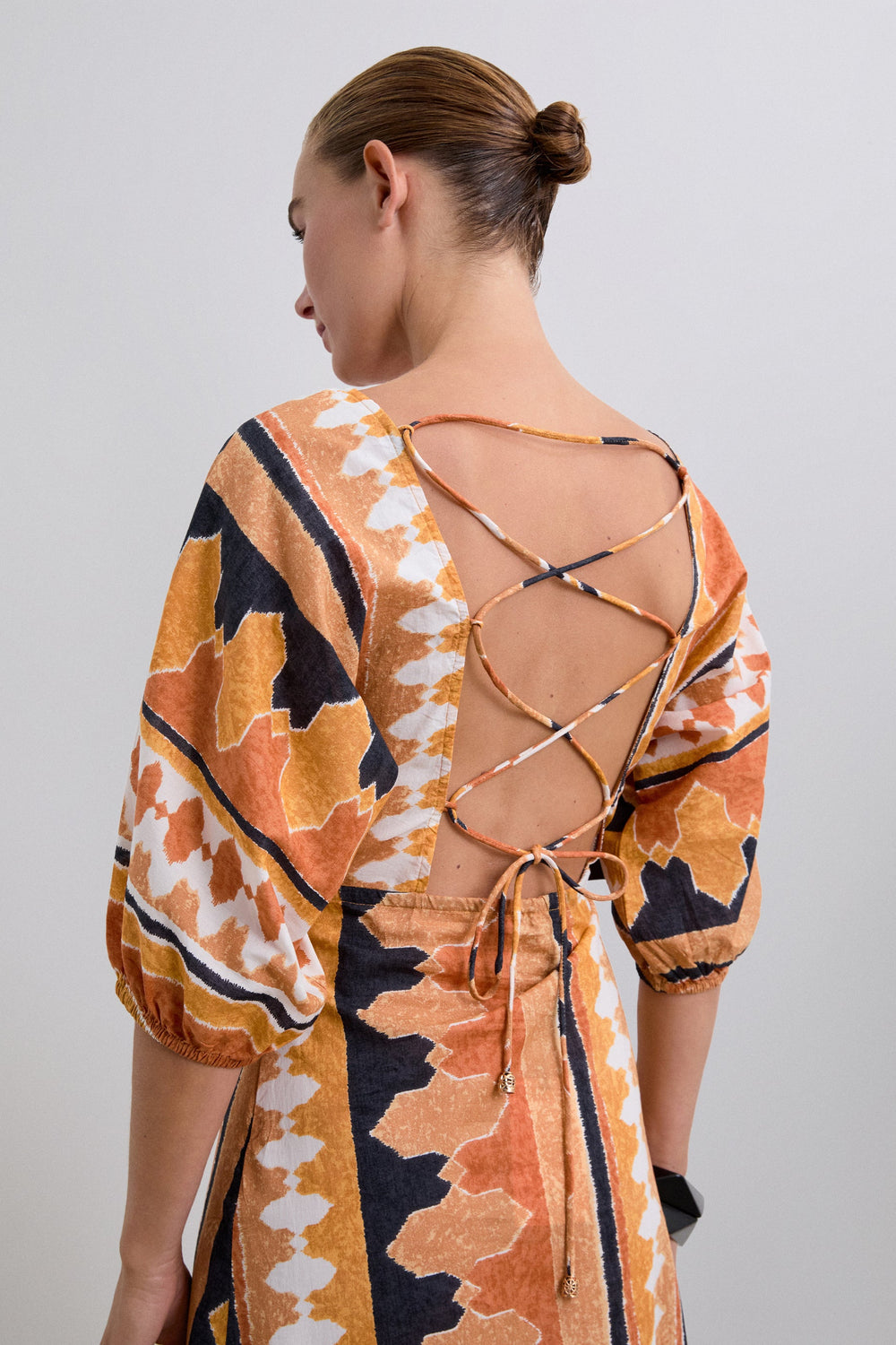 Vestido midi com padrão confecionado em 100% algodão orgânico BCI. Decote redondo. Abertura nas costas com fecho ajustável com laço. Manga curta abalonada. Pormenores franzidos no acabamento.