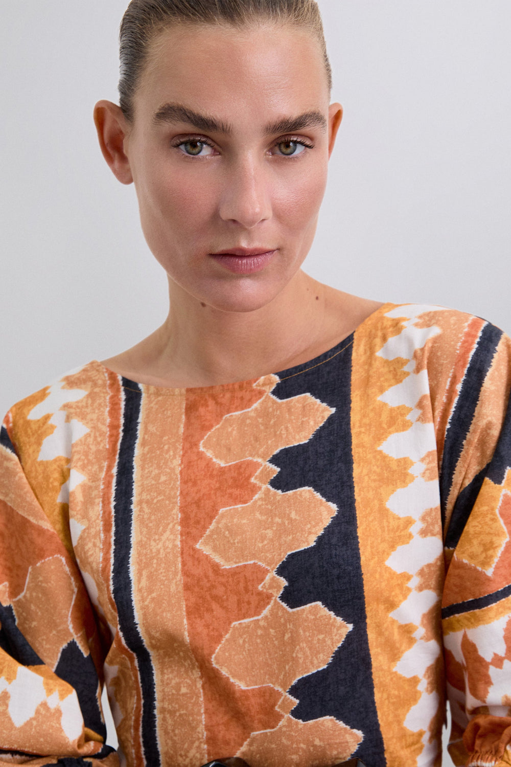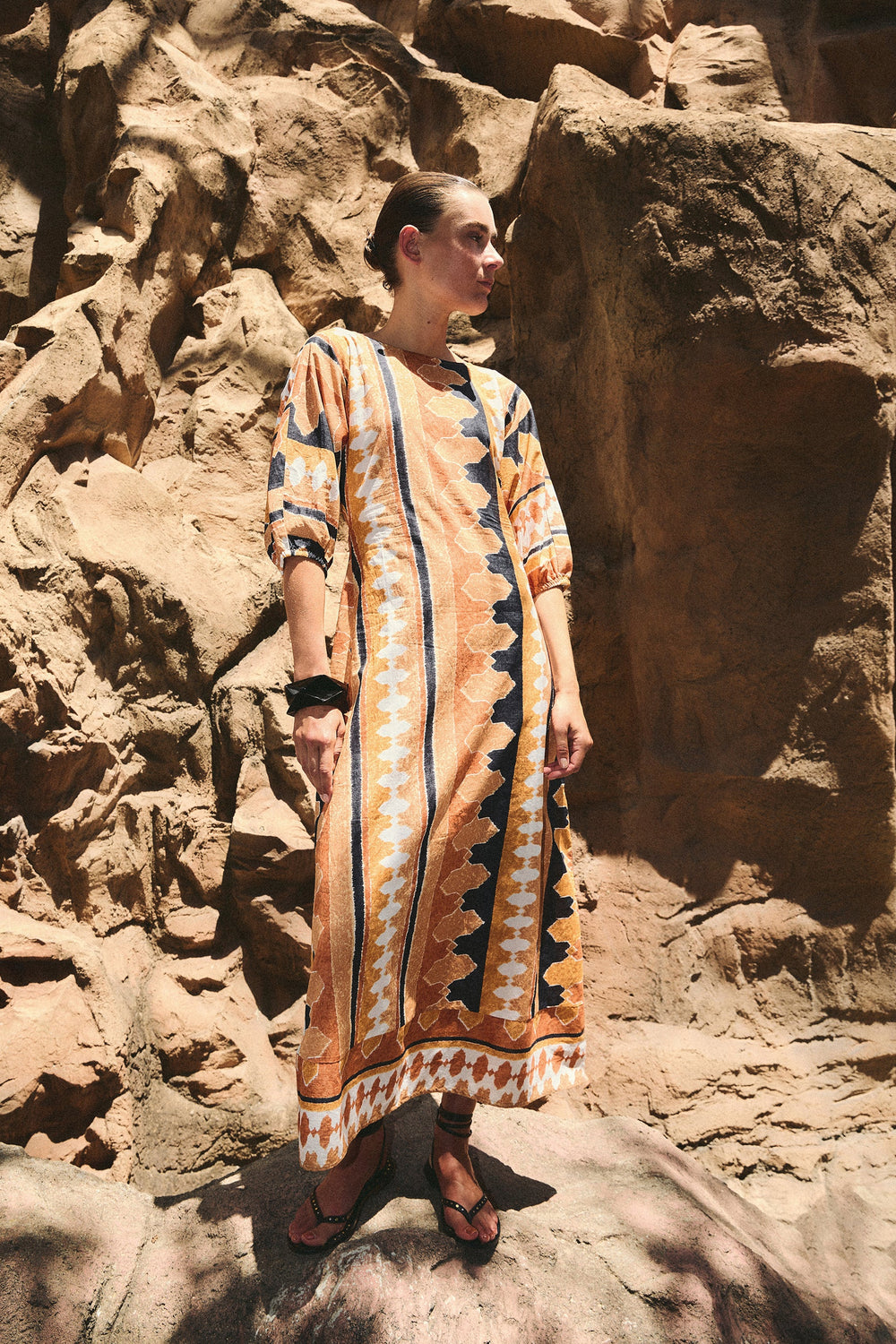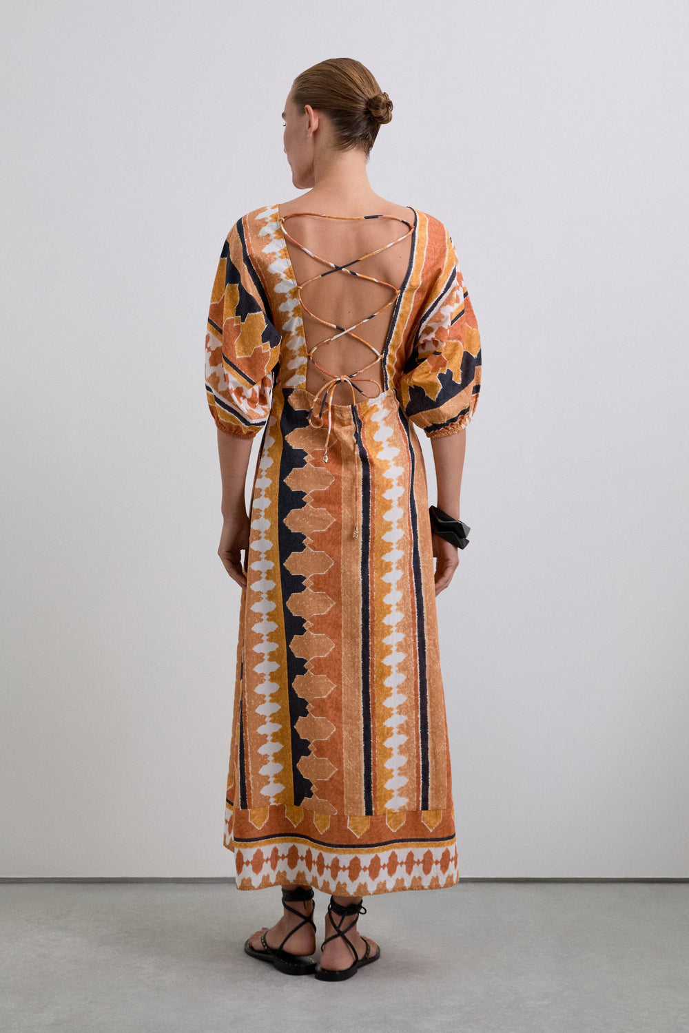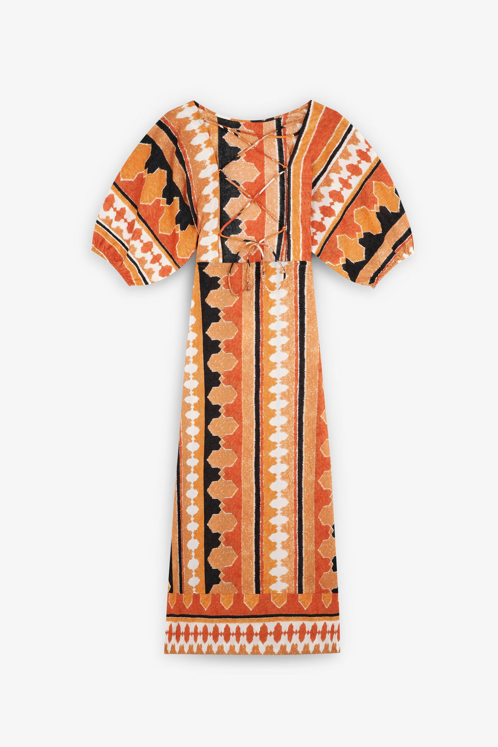 Vestido midi com padrão confecionado em 100% algodão orgânico BCI. Decote redondo. Abertura nas costas com fecho ajustável com laço. Manga curta abalonada. Pormenores franzidos no acabamento.