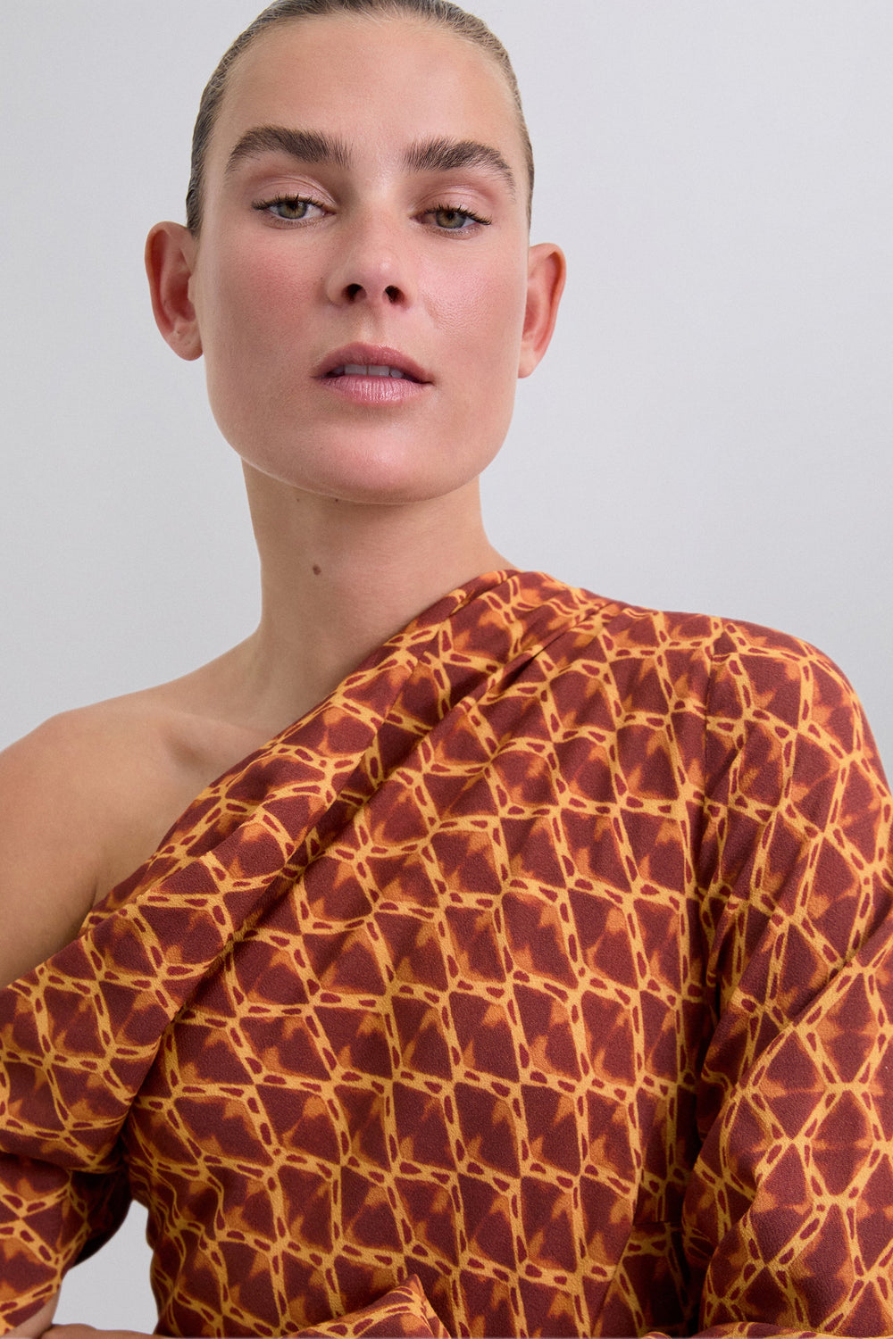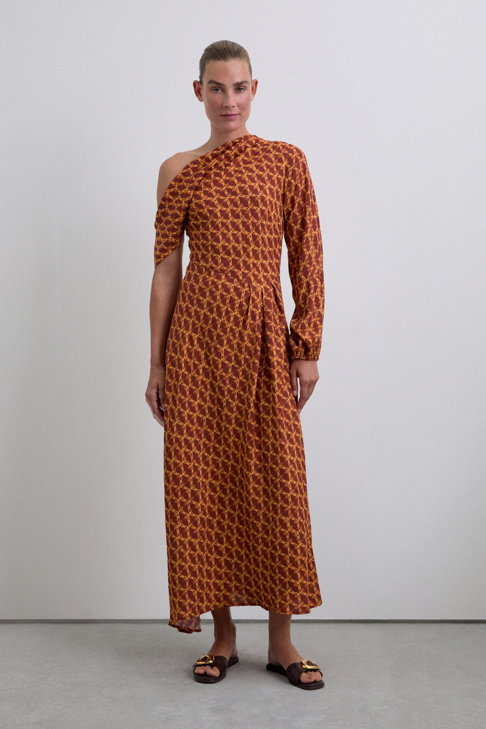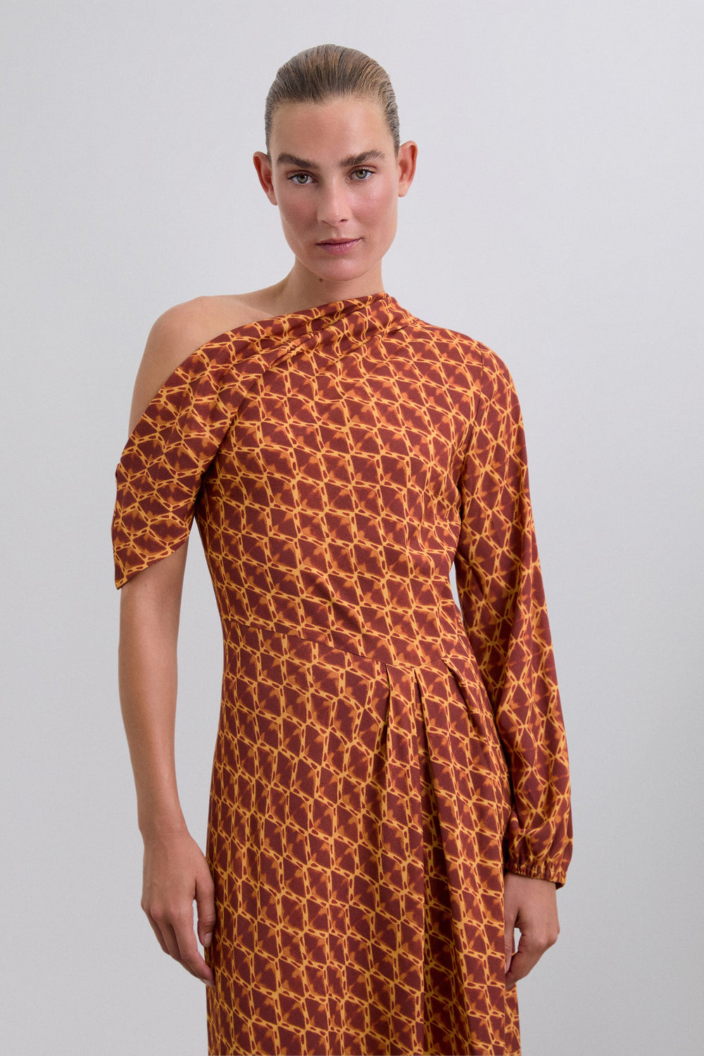 Vestido de padrão com mangas compridas e curtas bufantes com punho elástico. Decote assimétrico. Um ombro descoberto. Slim fit.