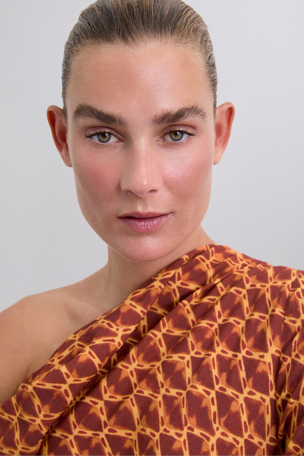 VESTIDO COM PADRÃO E DECOTE ASSIMÉTRICO