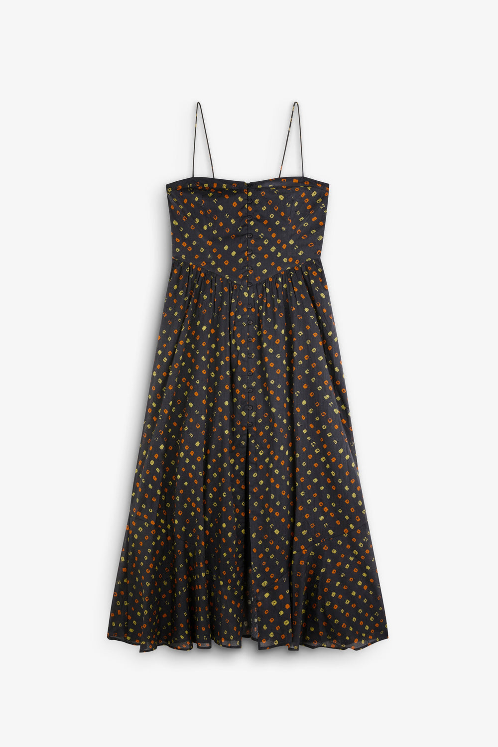 Vestido com padrão confecionado em tecido 100% algodão BCI com estampado. Corte regular fit e alças finas.