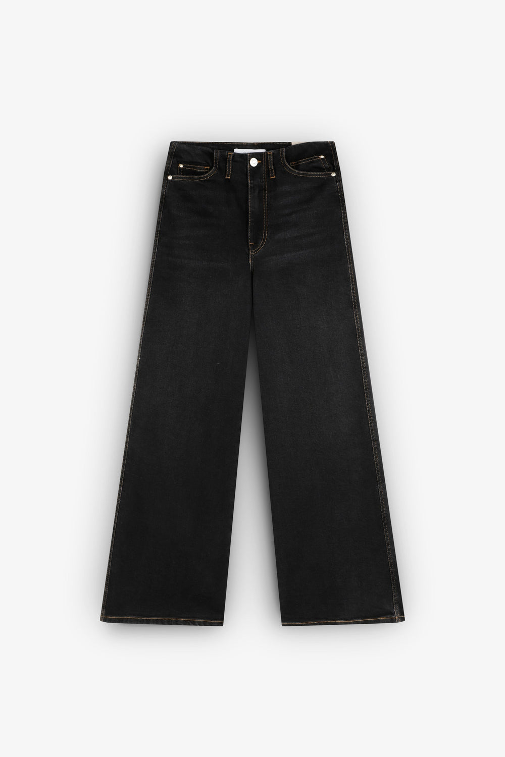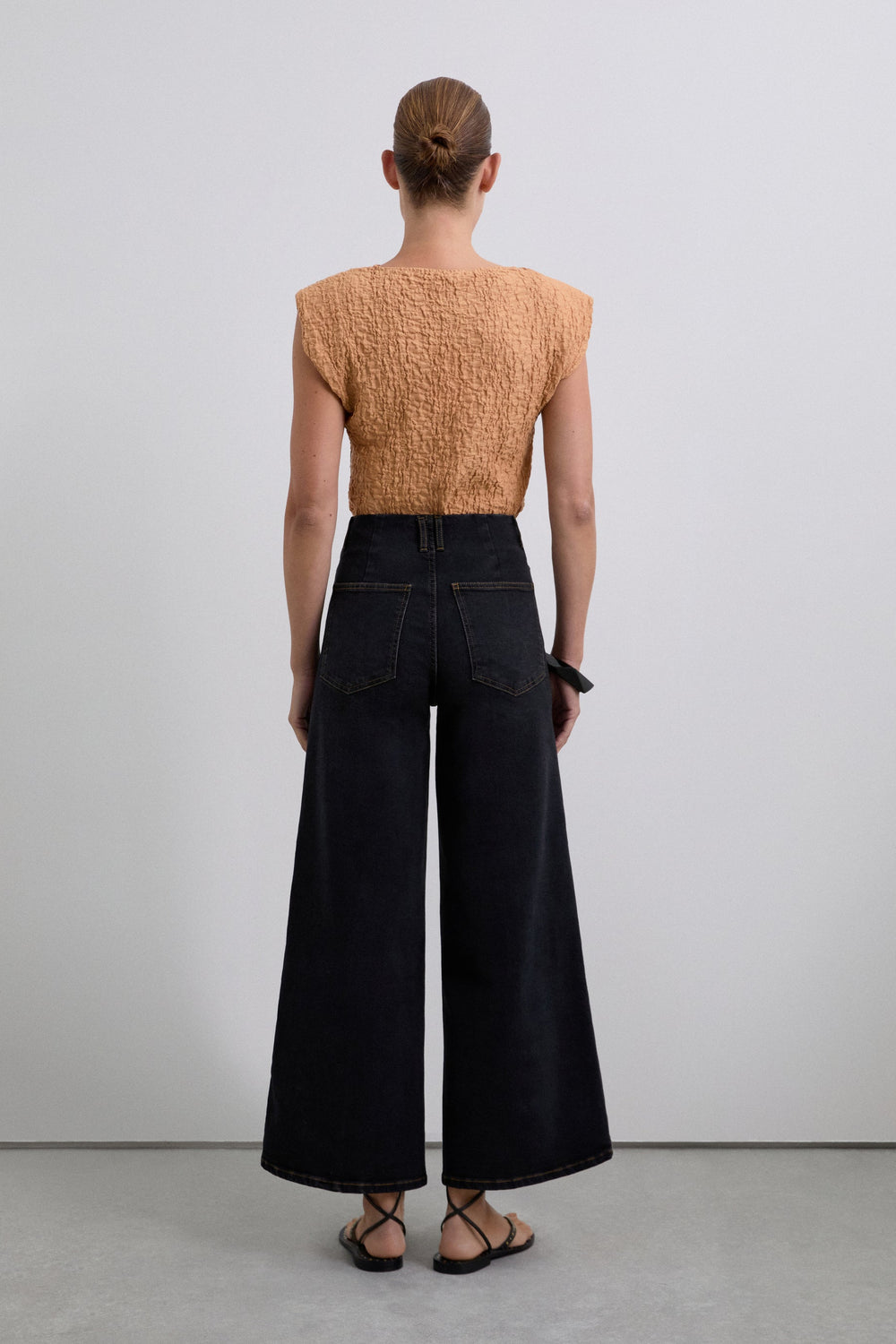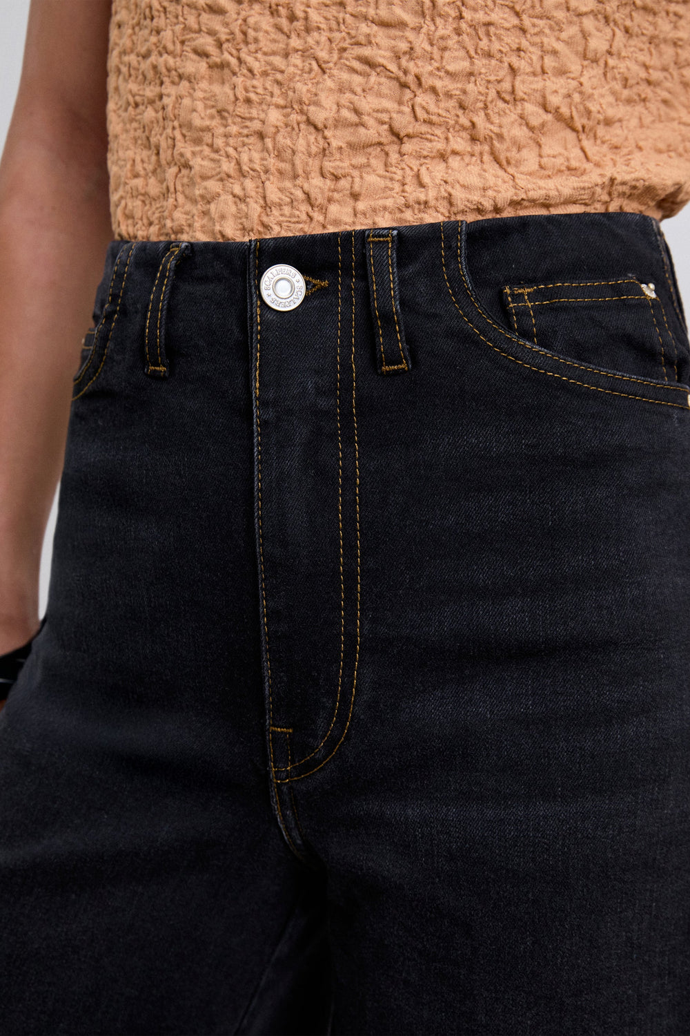 Calças denim confecionadas em algodão com ligeiro elastano. Corte culottes, cintura alta e fecho com zip e botão. Bolsos à frente e atrás.