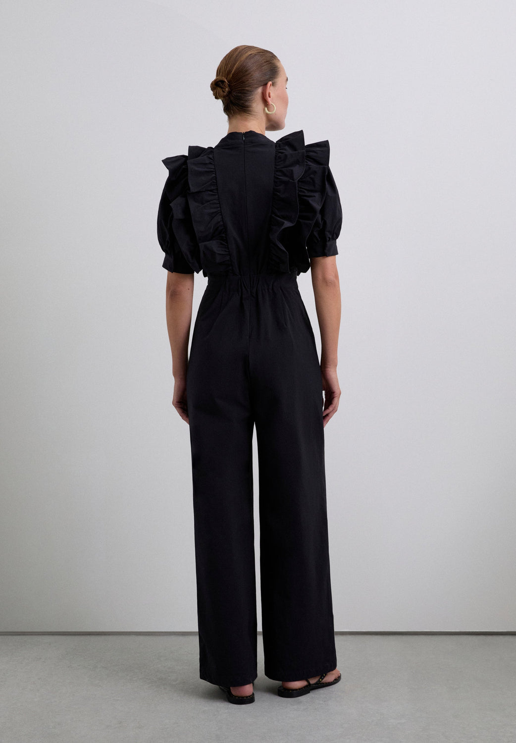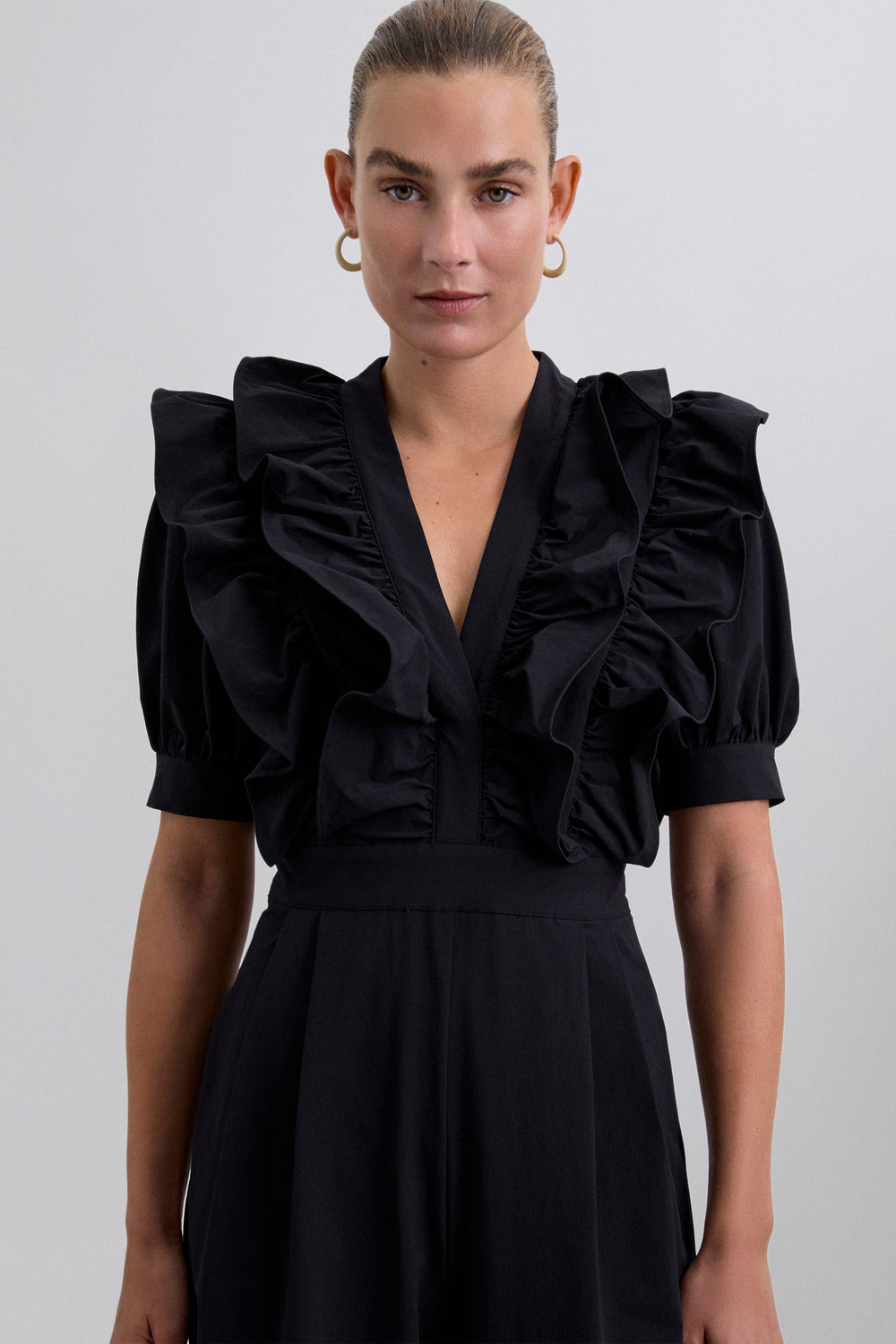 Macacão preto. Corte regular fit, decote em V com pormenor de folhos, manga abalonada com acabamento, cintura justa e corte de calças full length. Fecho com zip atrás.
