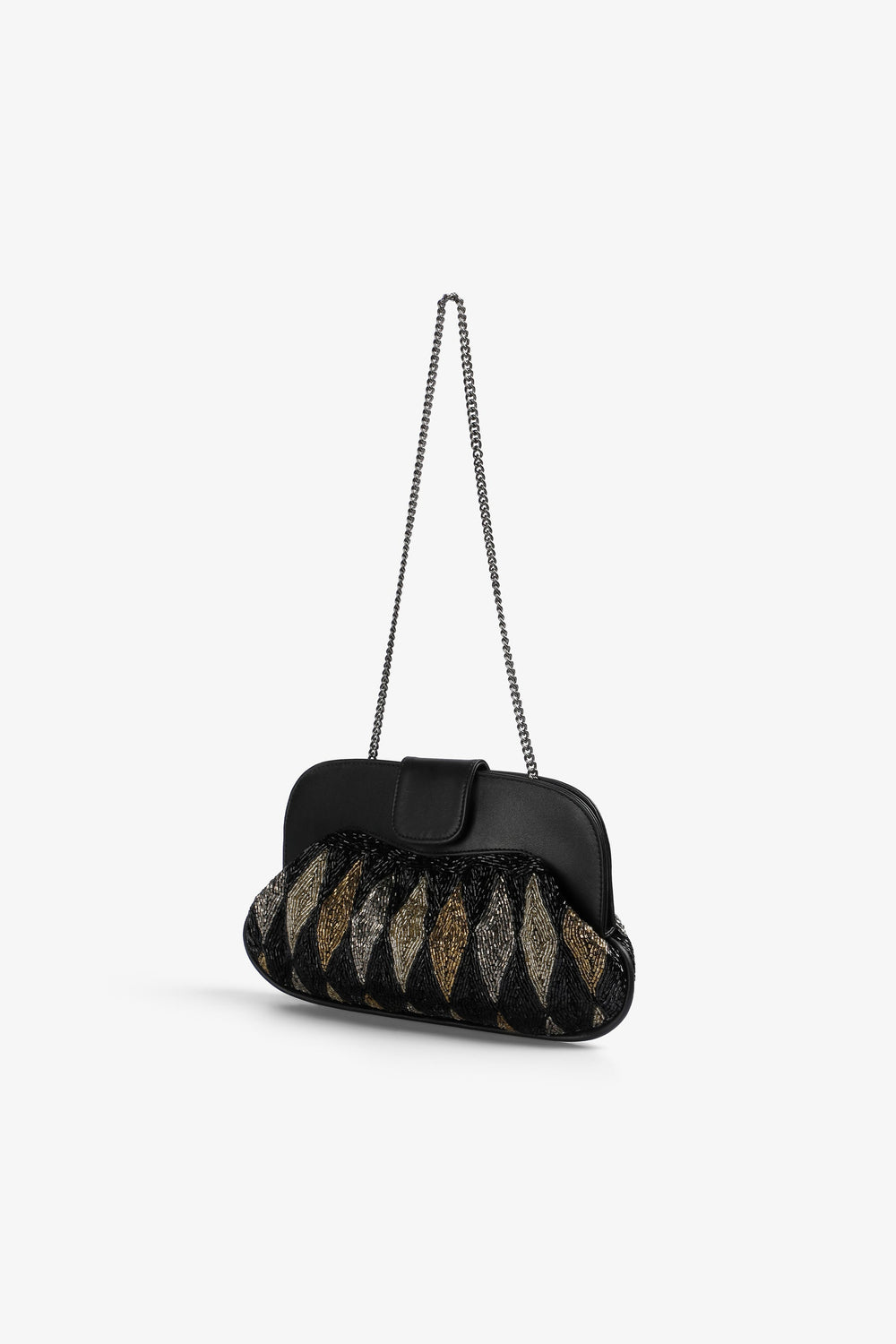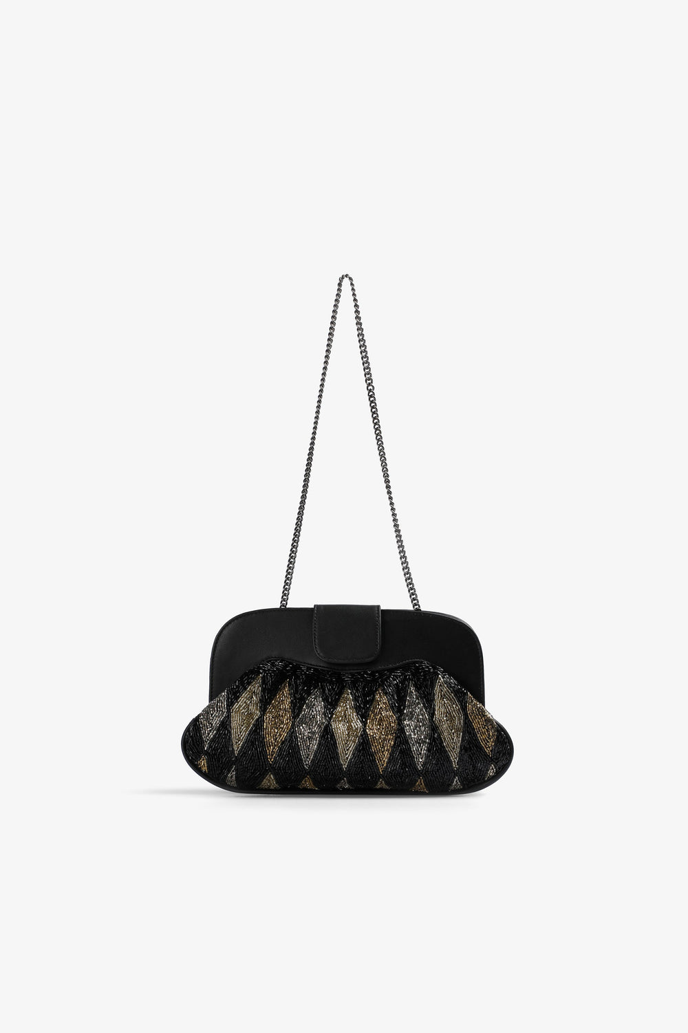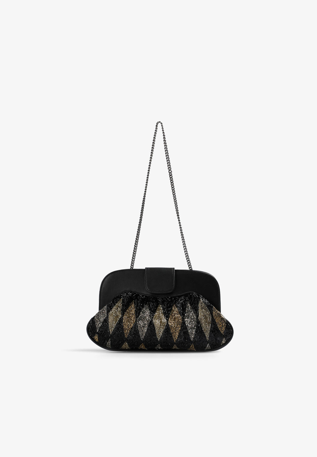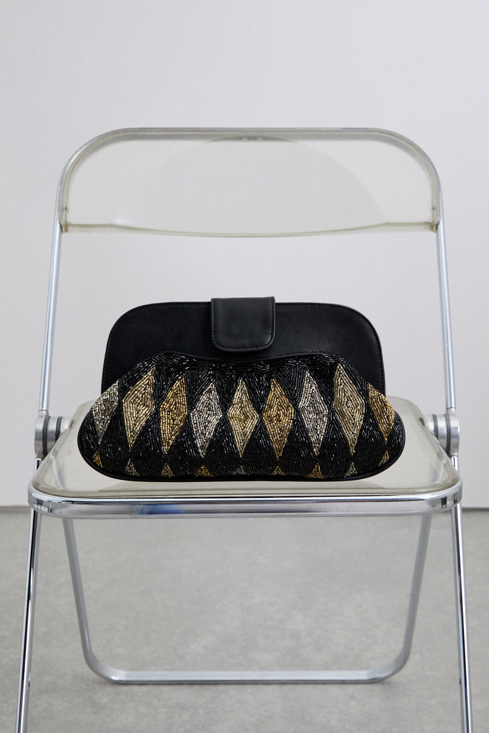 Bolsa de mão. Pormenor de contas. Correia metálica amovível em posição de alça de ombro. Fecho com íman. Pormenor de logótipo bordado no interior.