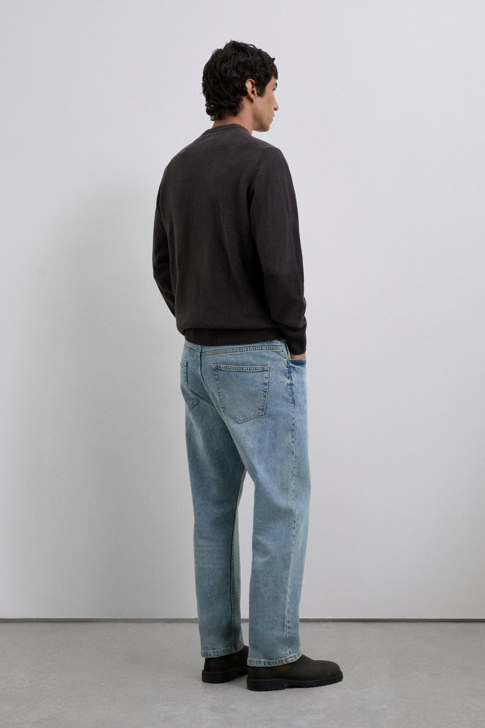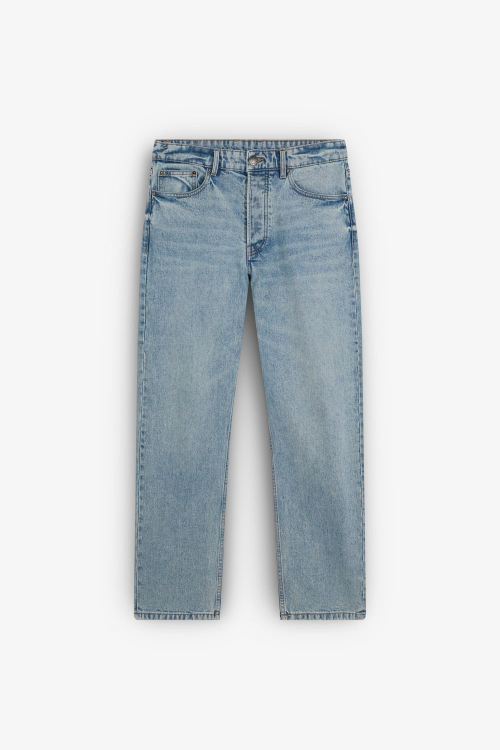 Calças jeans confecionadas em algodão BCI. Fecho com botão e zip. Dois bolsos laterais e traseiros. Presilhas na cintura.