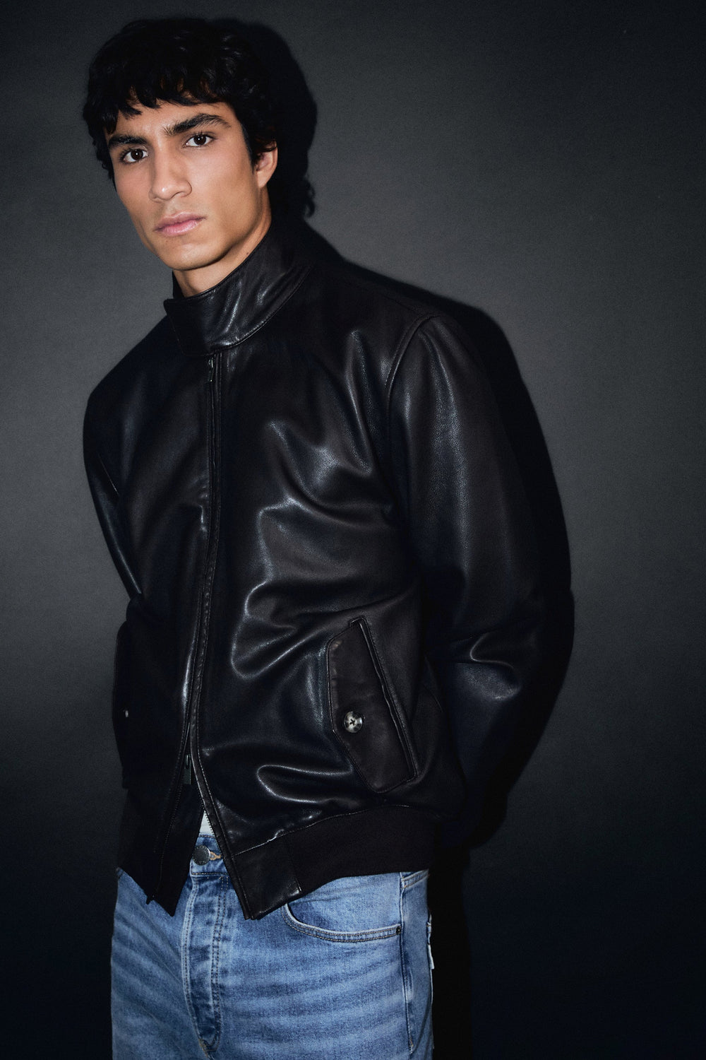Casaco confecionado em 100% pele. Manga comprida. Fecho frontal com fecho zip duplo. Gola alta com fecho de duplo alfinete. Dois bolsos frontais com aba e botão. Punhos e bainha canelados.