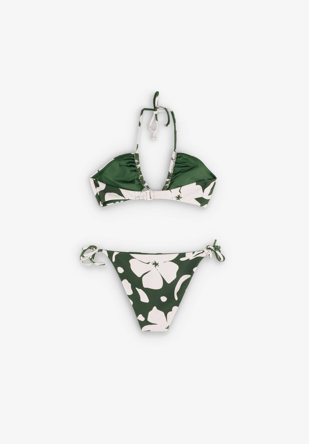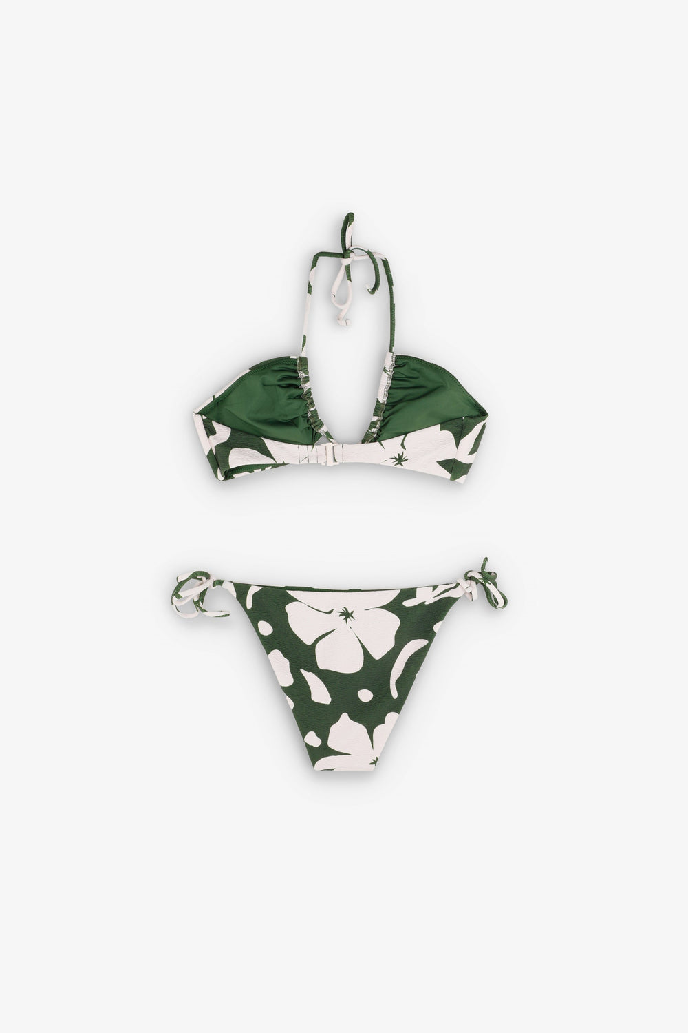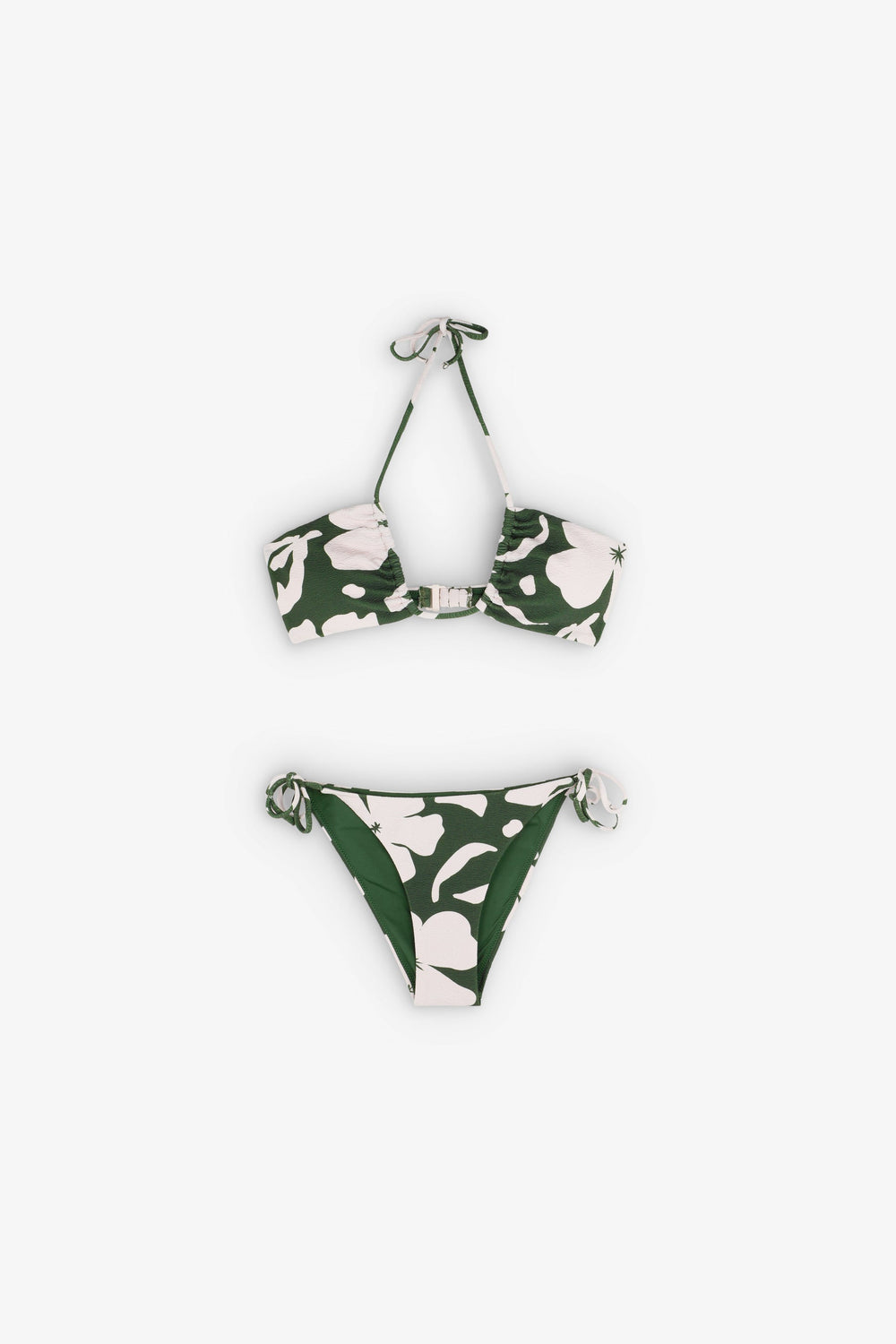 Este biquíni foi desenhado em colaboração com a Scalpers e pertence à coleção ROBIN x SCALPERS. É um Biquíni estilo Bandeau decotado com padrão floral sobre estrutura, nas cores verde e cru. Tem enchimentos removíveis, alças multiposições e um fecho de gancho multiposições nas costas para um melhor ajuste. Cueca de cintura subida, totalmente forrada. Também disponível com cueca de cobertura clássica com laço lateral.