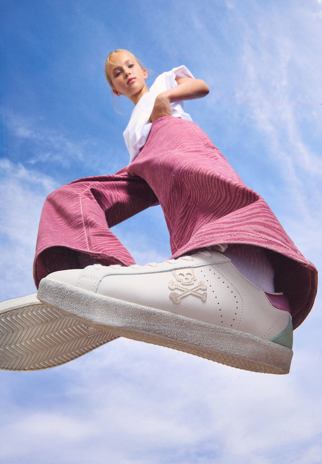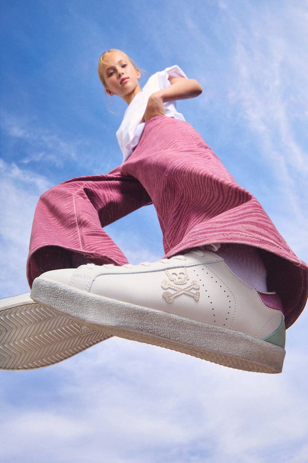 Sapatilhas com skull lateral a contrastar. Sola com efeito desgastado de caucho. Calcanhar em contraste com logótipo no tom. Fecho com cordões.