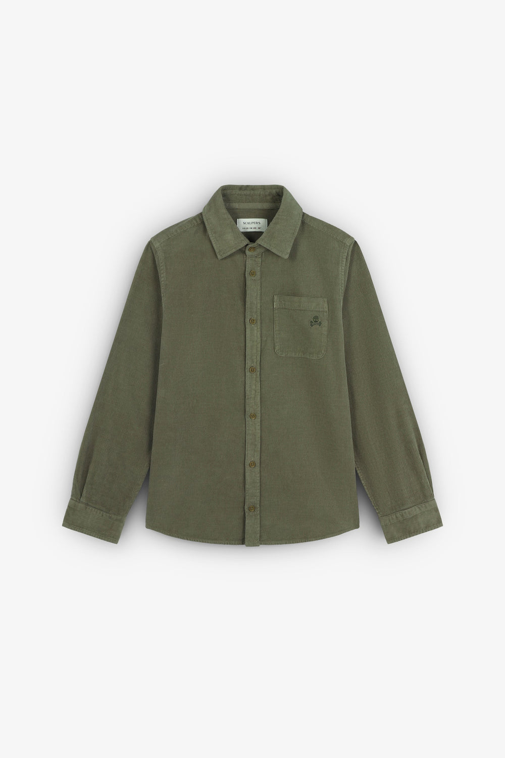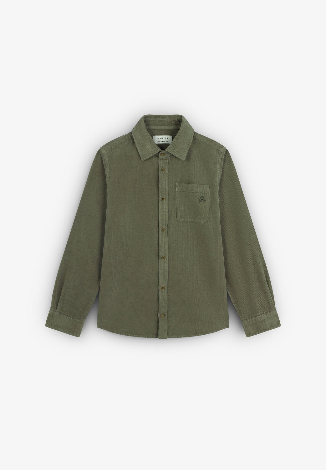 Camisa de bombazina confecionada em 100% algodão BCI. Regular fit. Fecho com botões. Manga comprida com punhos terminados com botão. Skull bordada no peito no tom.