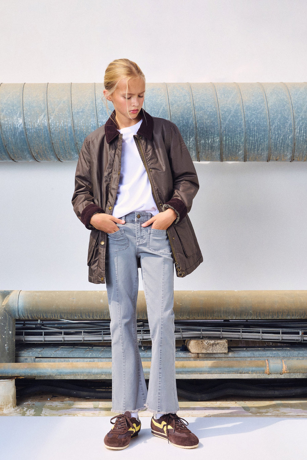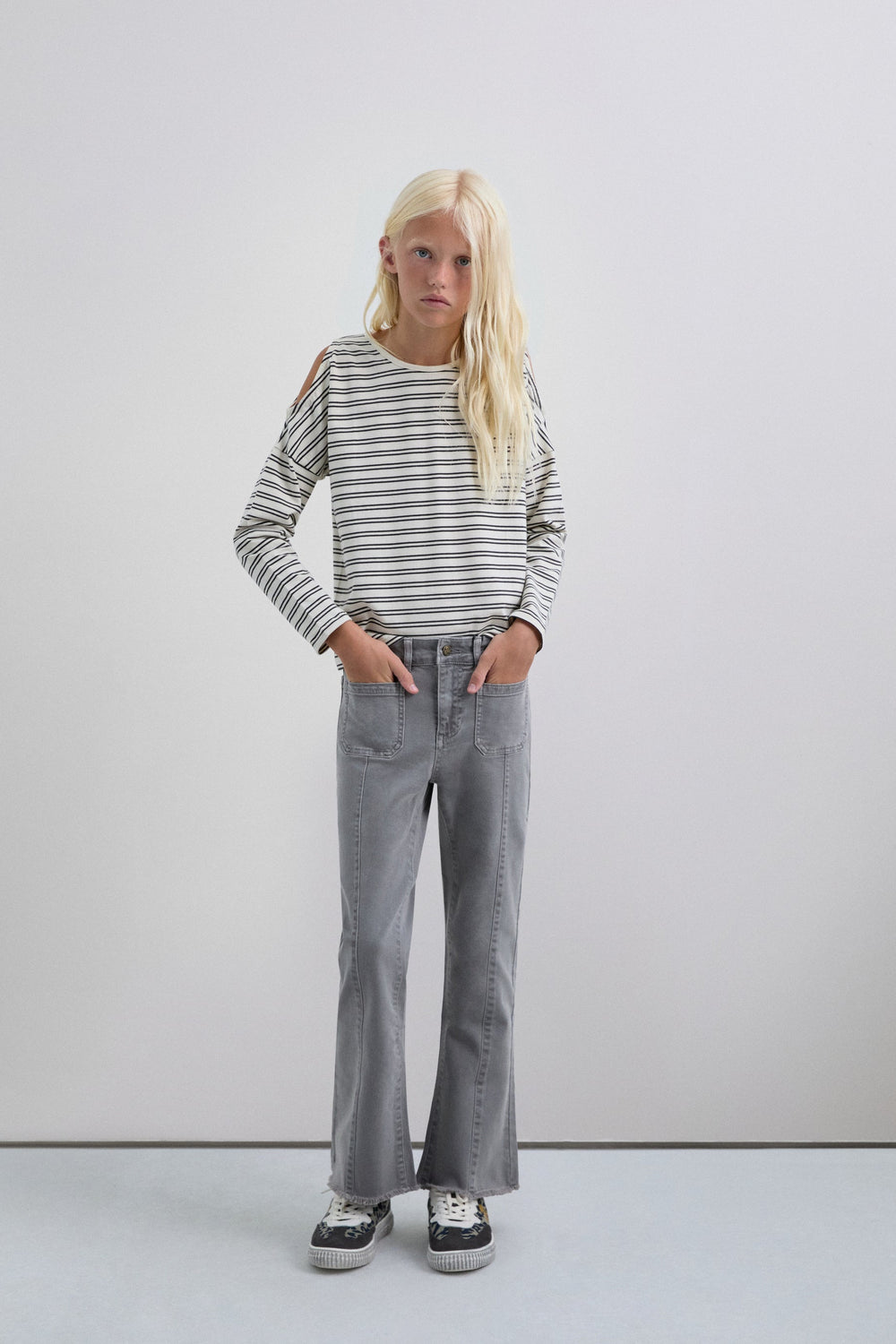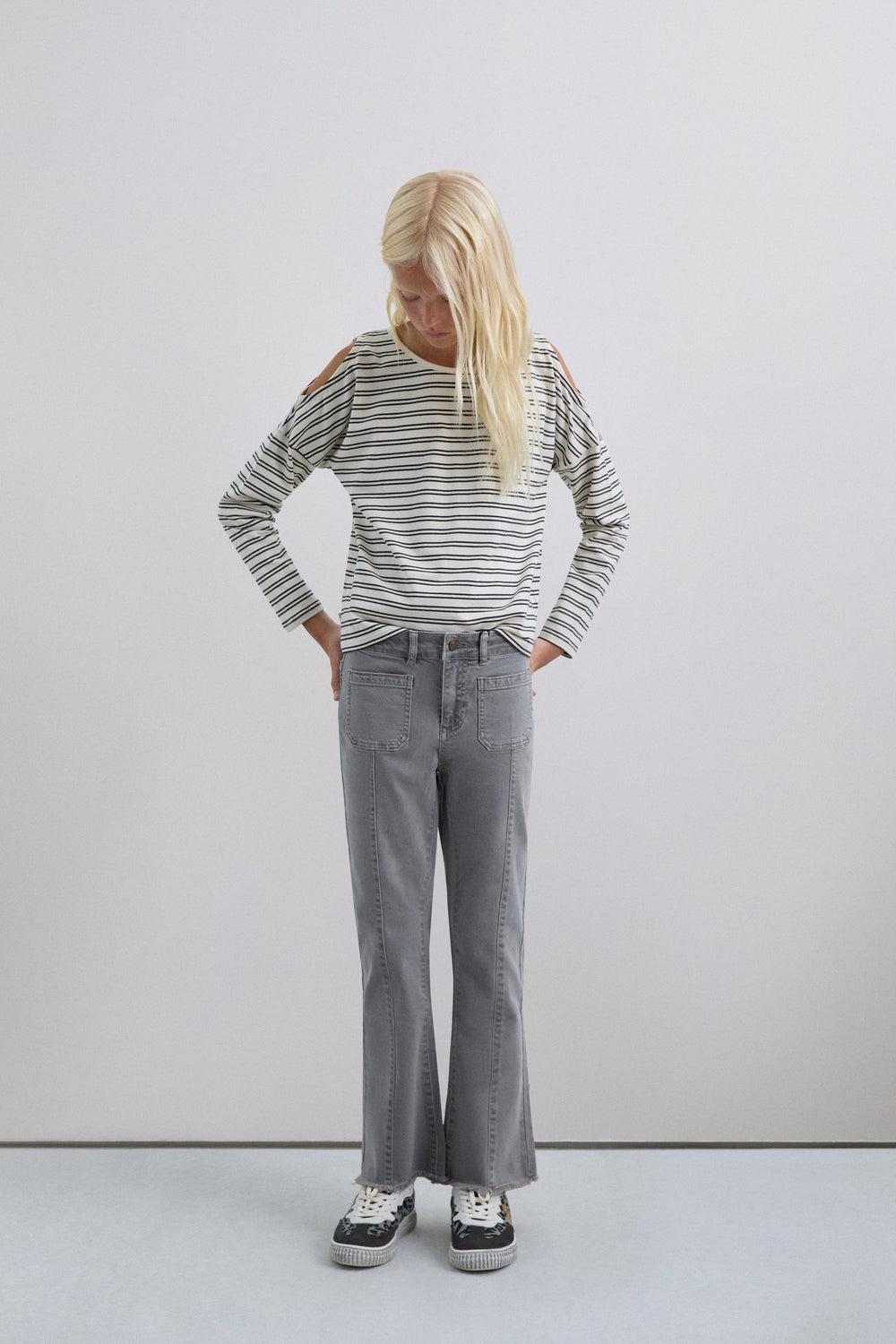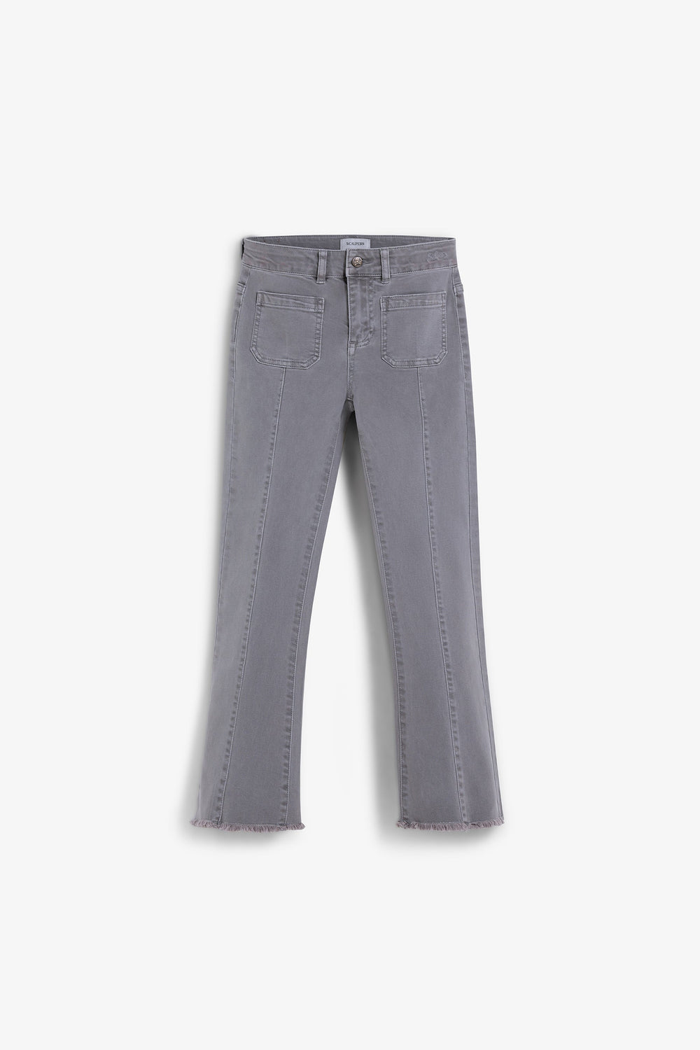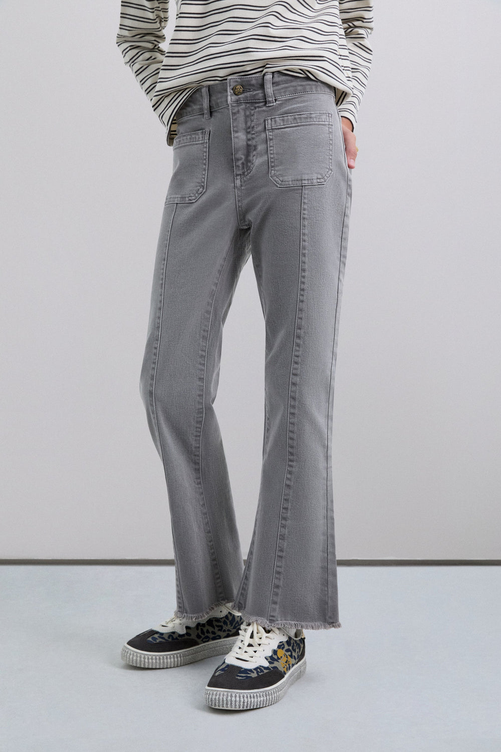 Calças boca de sino confecionadas em algodão BCI. Fecho com botão e zip. Presilhas na cintura. Bolsos à frente e atrás. Pormenor de costura na parte frontal. Abertura lateral e bainhas desfiadas.