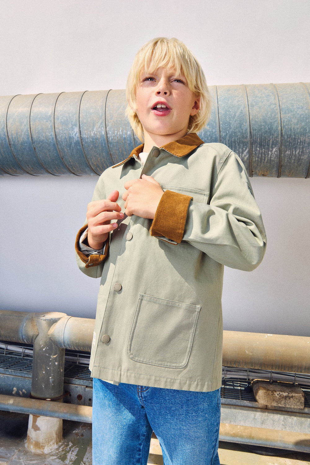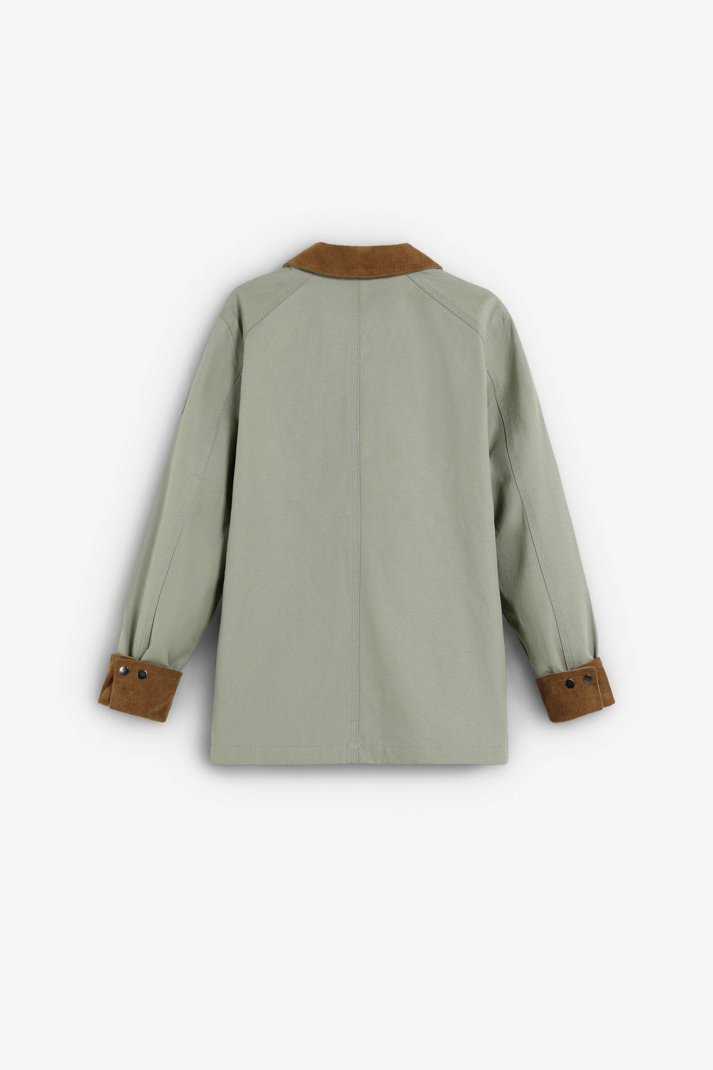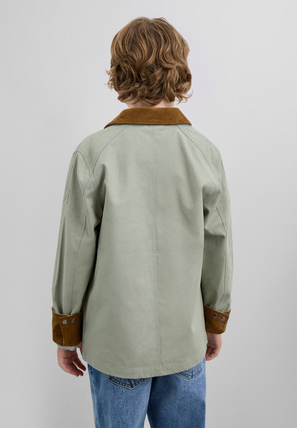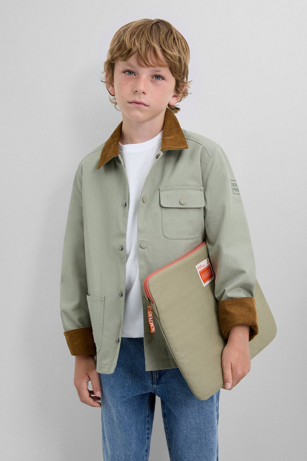 Casaco confecionado em 100% algodão BCI. Gola camiseiro em contraste. Manga comprida. Fecho com botão e zip. Bolsos frontais e no peito com fecho com botão. Pormenor de etiqueta com logótipo no bolso frontal.