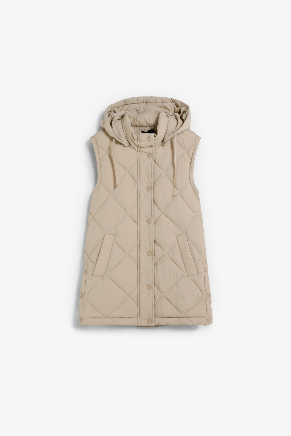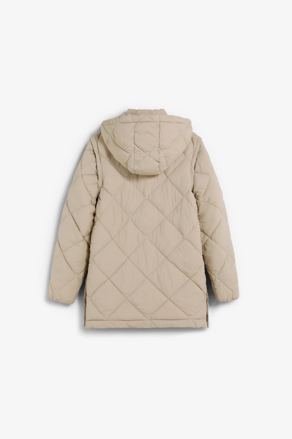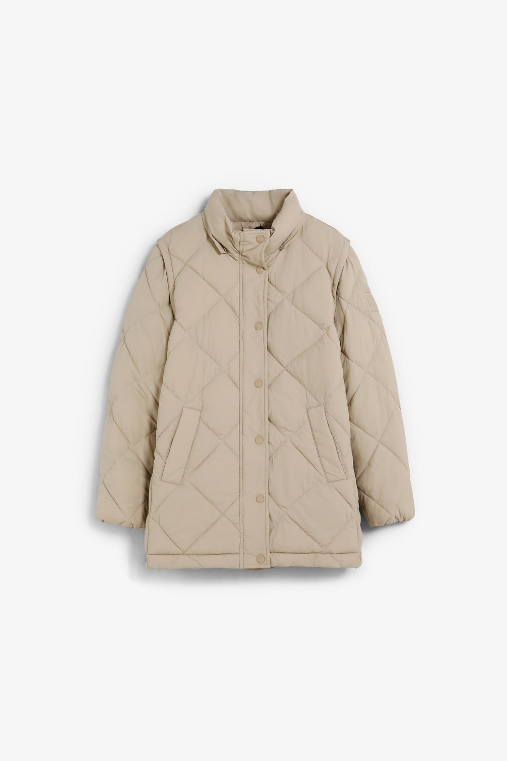Casaco acolchoado. Capuz e Mangas amovíveis. Fecho de correr à frente oculto por uma aba com fecho de botões de pressão. Bolsos laterais. Forro recycled. Pormenor de logótipo nas costas.