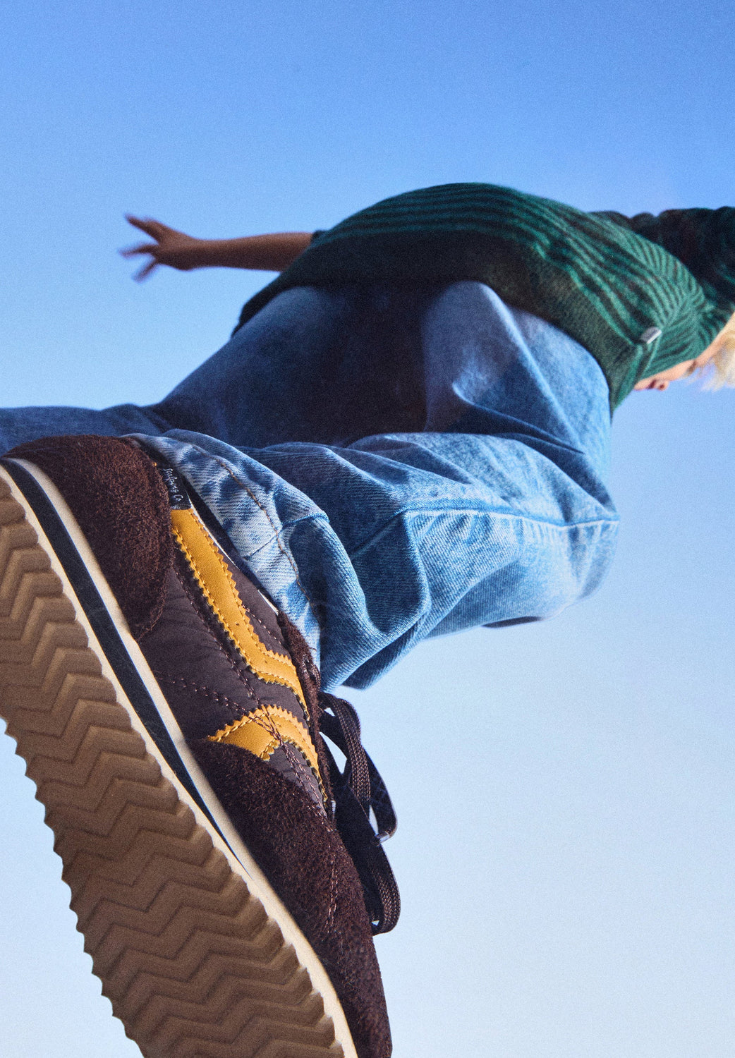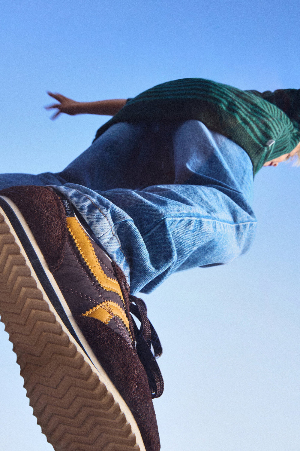 Sapatilhas confecionadas em pele de camurça. Fecho com cordões ajustáveis no tom. Logótipo em contraste. Sola TPR.