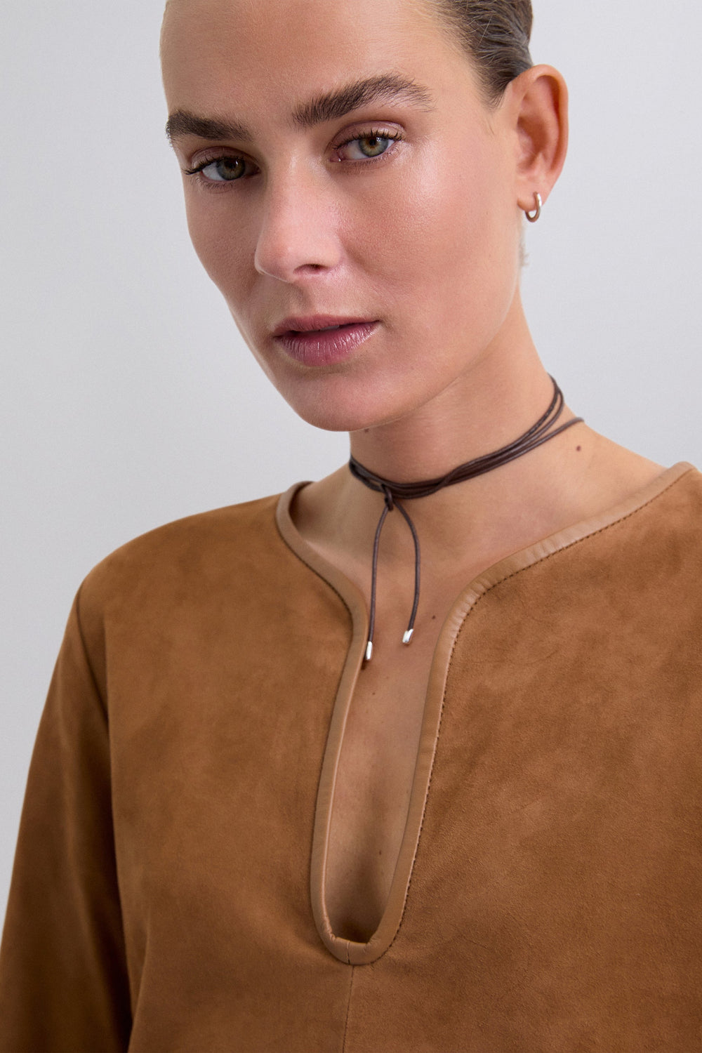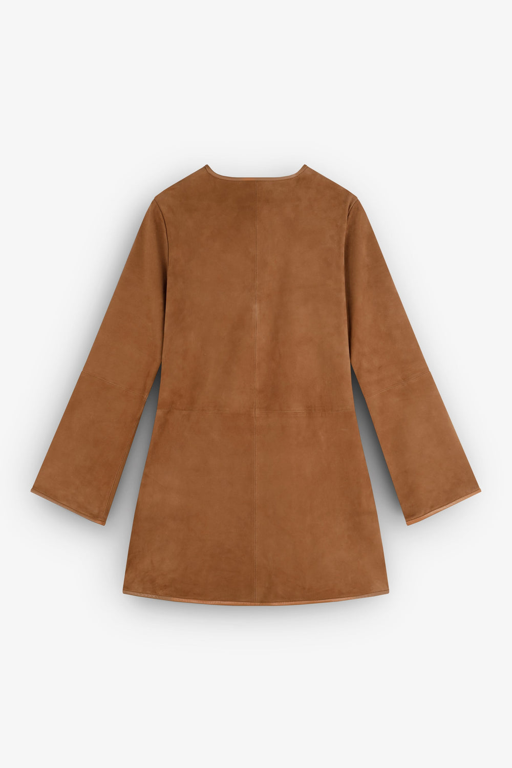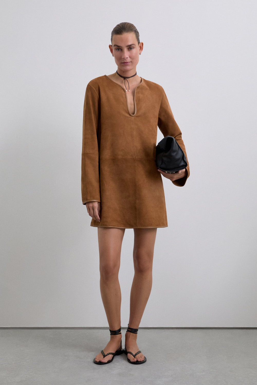Mini vestido confecionado em pele de caprino com acabamento em camurça. Decote caixa. Manga comprida ligeiramente à boca de sino. Pormenores de costuras e Pipin à volta do decote, das mangas e da bainha.