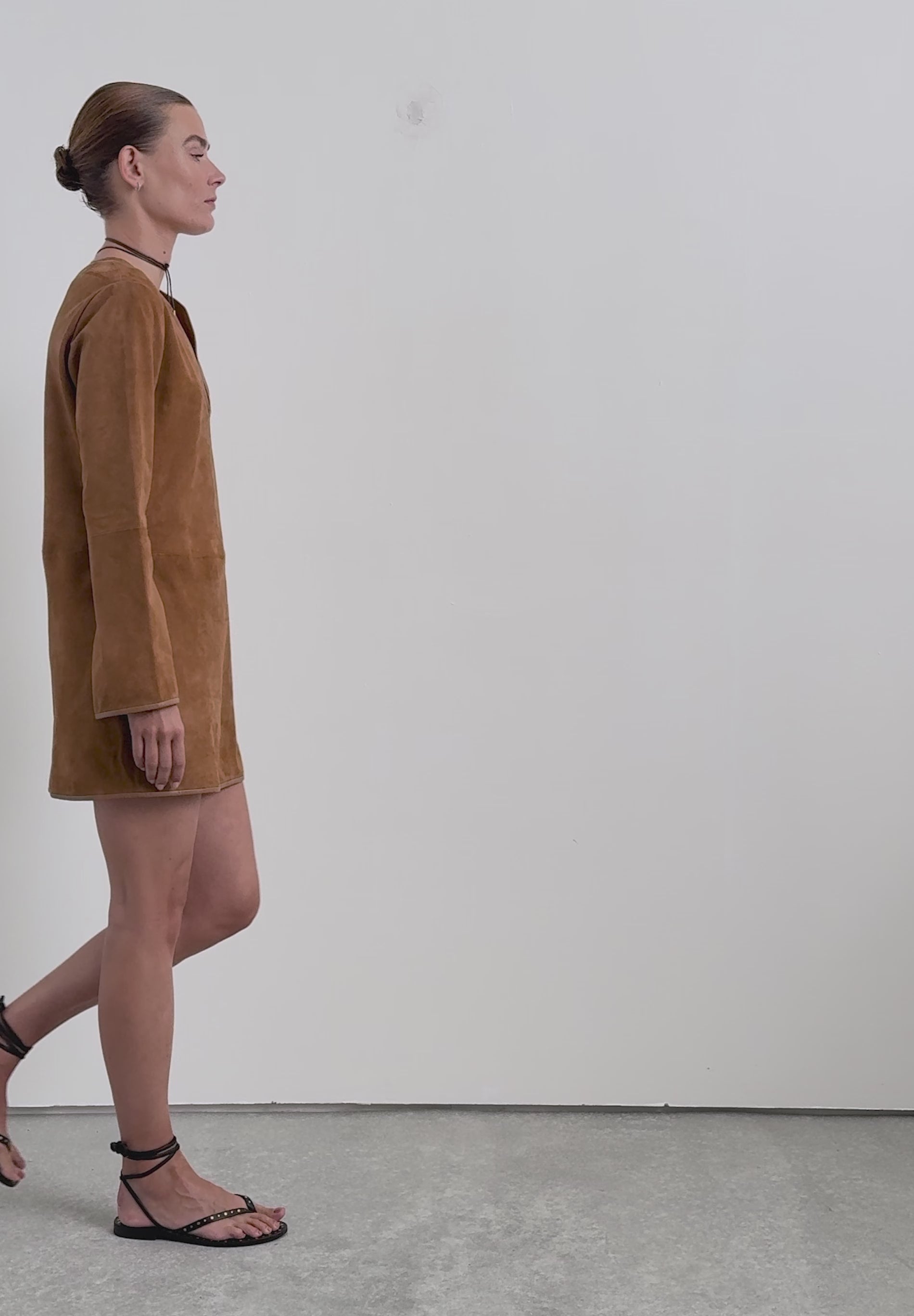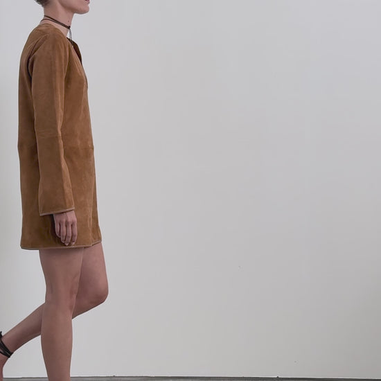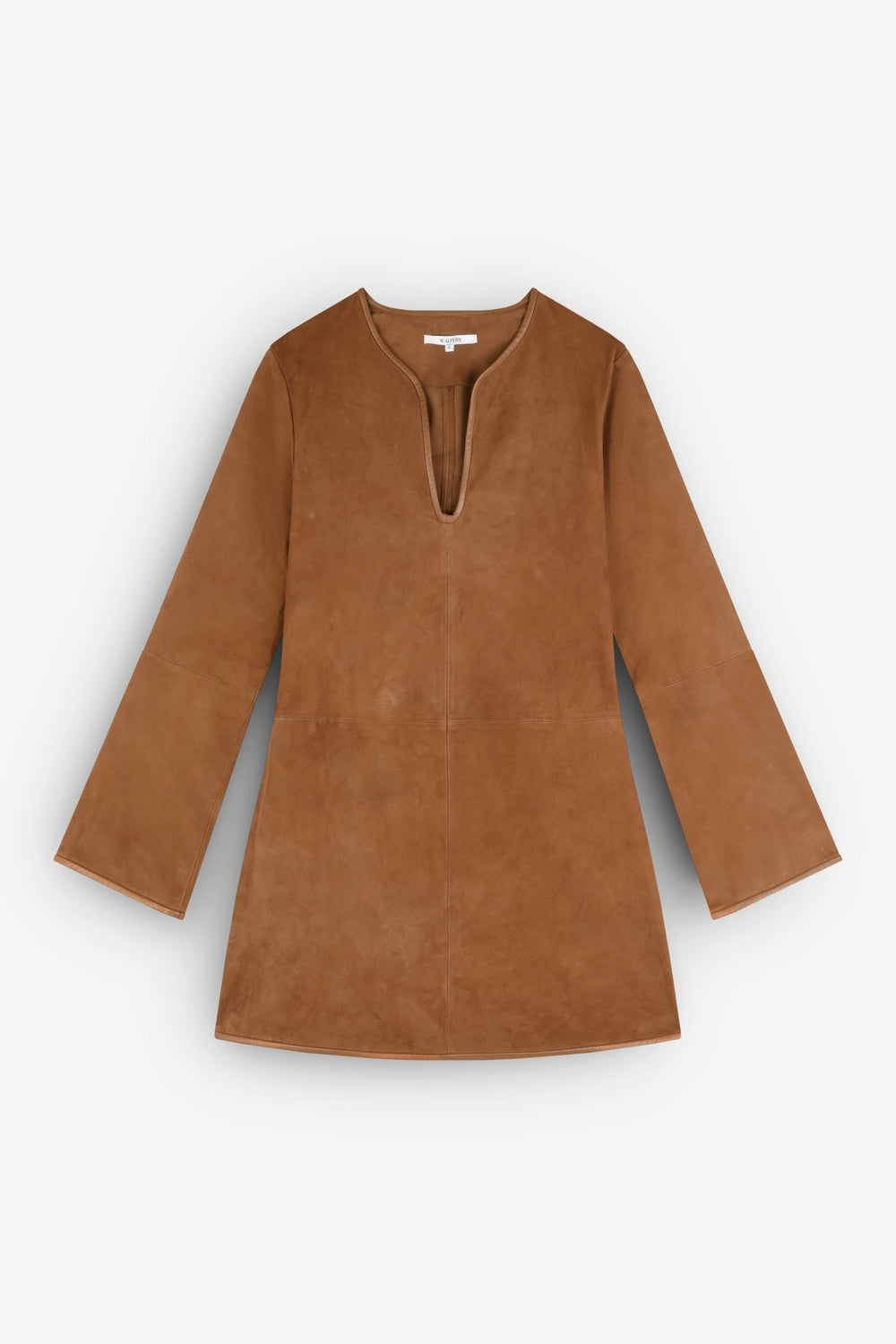 Mini vestido confecionado em pele de caprino com acabamento em camurça. Decote caixa. Manga comprida ligeiramente à boca de sino. Pormenores de costuras e Pipin à volta do decote, das mangas e da bainha.
