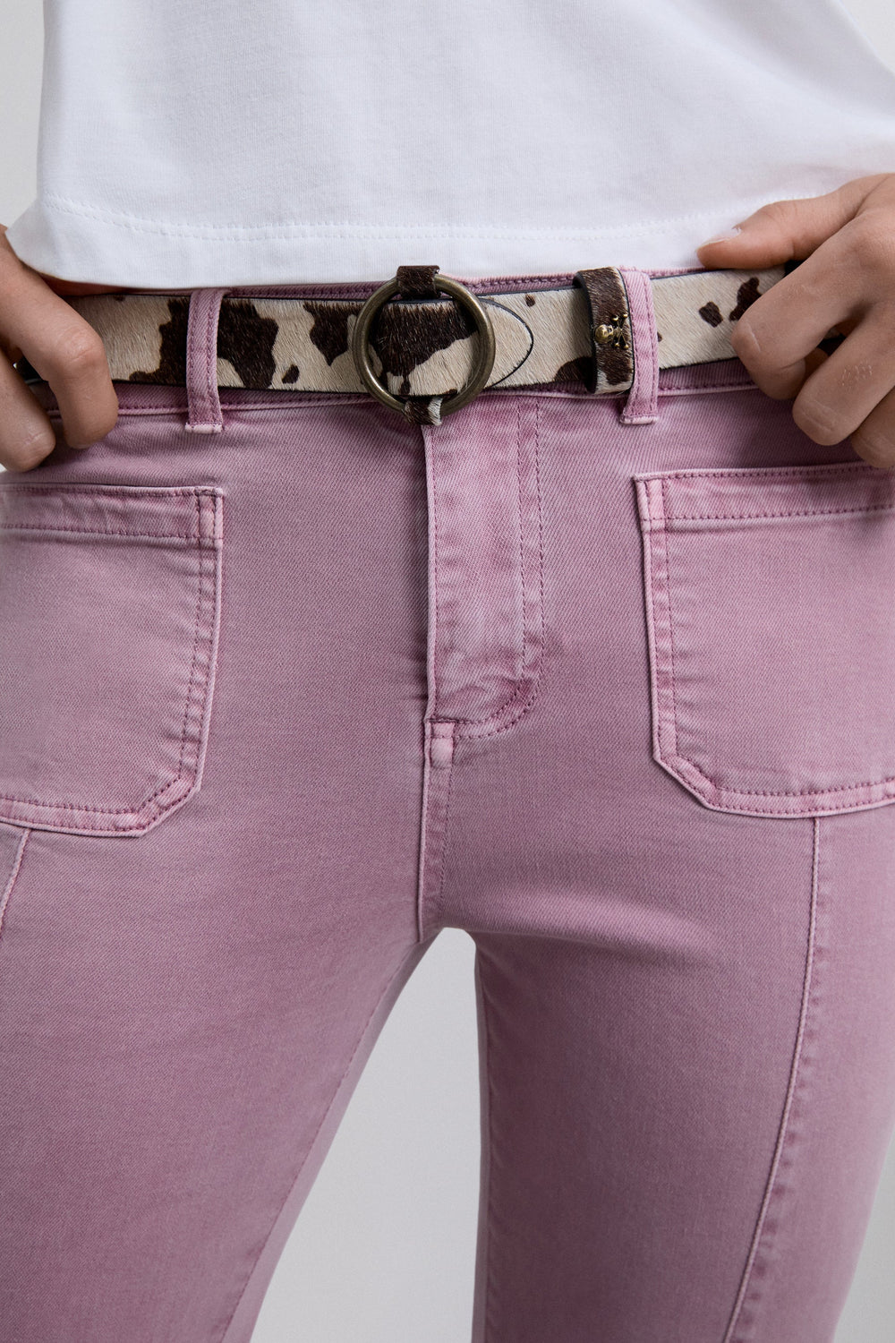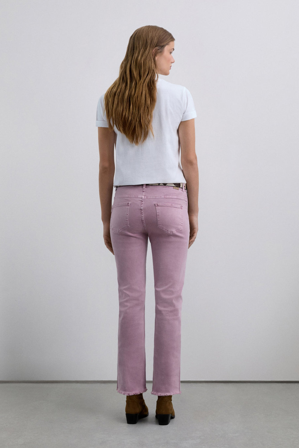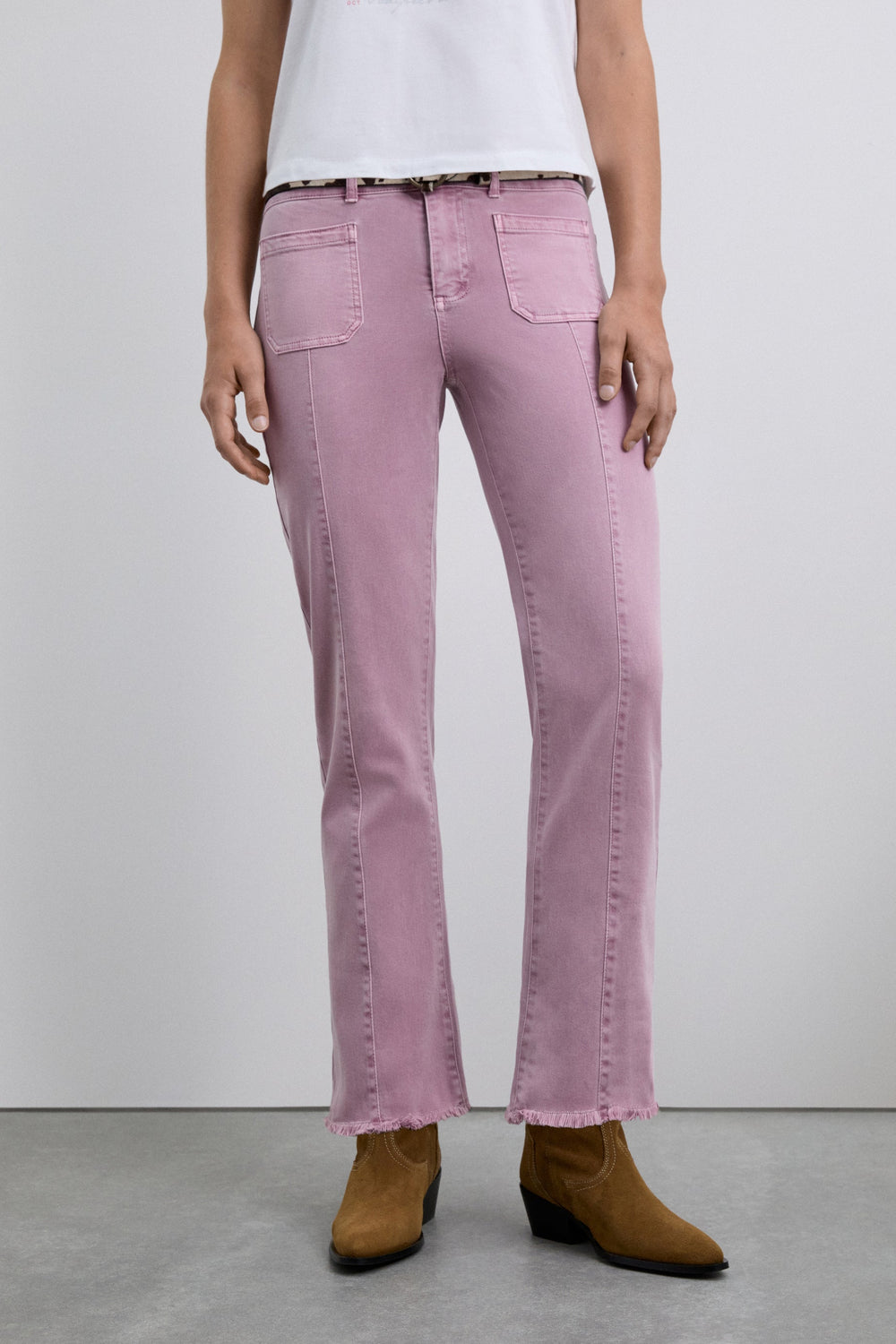 Calças boca de sino confecionadas em algodão BCI. Fecho com botão e zip. Presilhas na cintura. Bolsos à frente e atrás. Pormenor de costura na parte frontal. Abertura lateral e bainhas desfiadas.