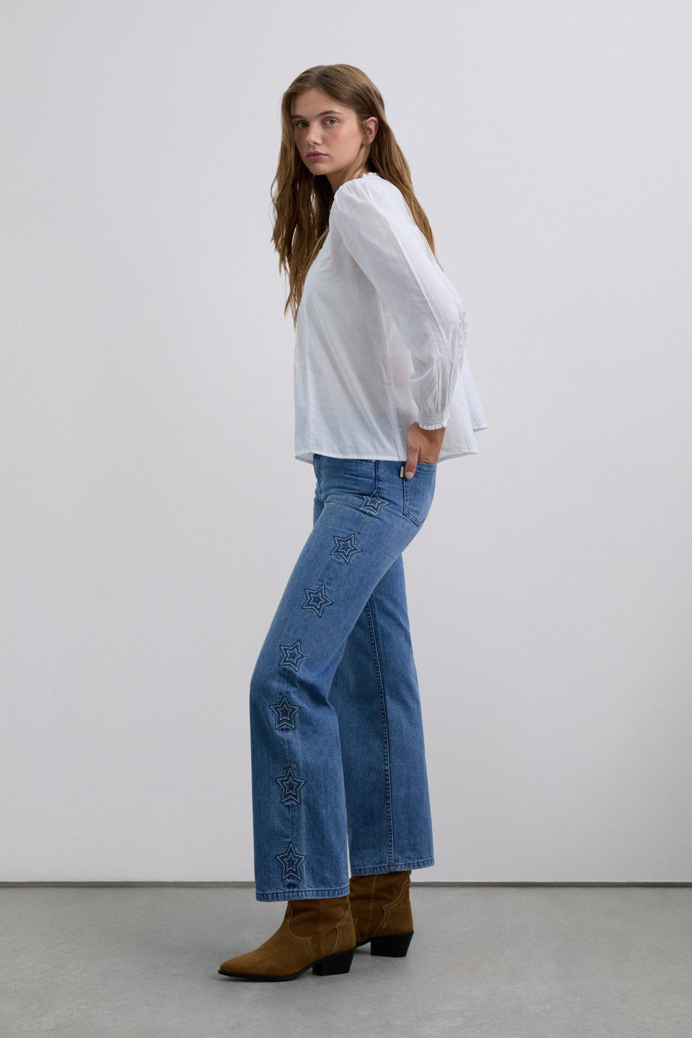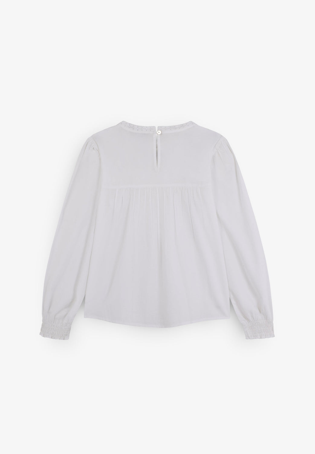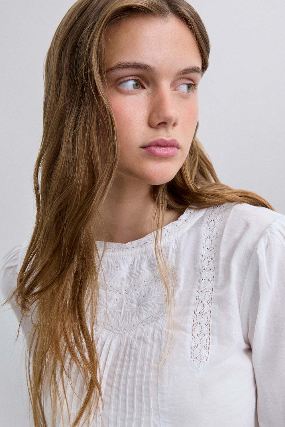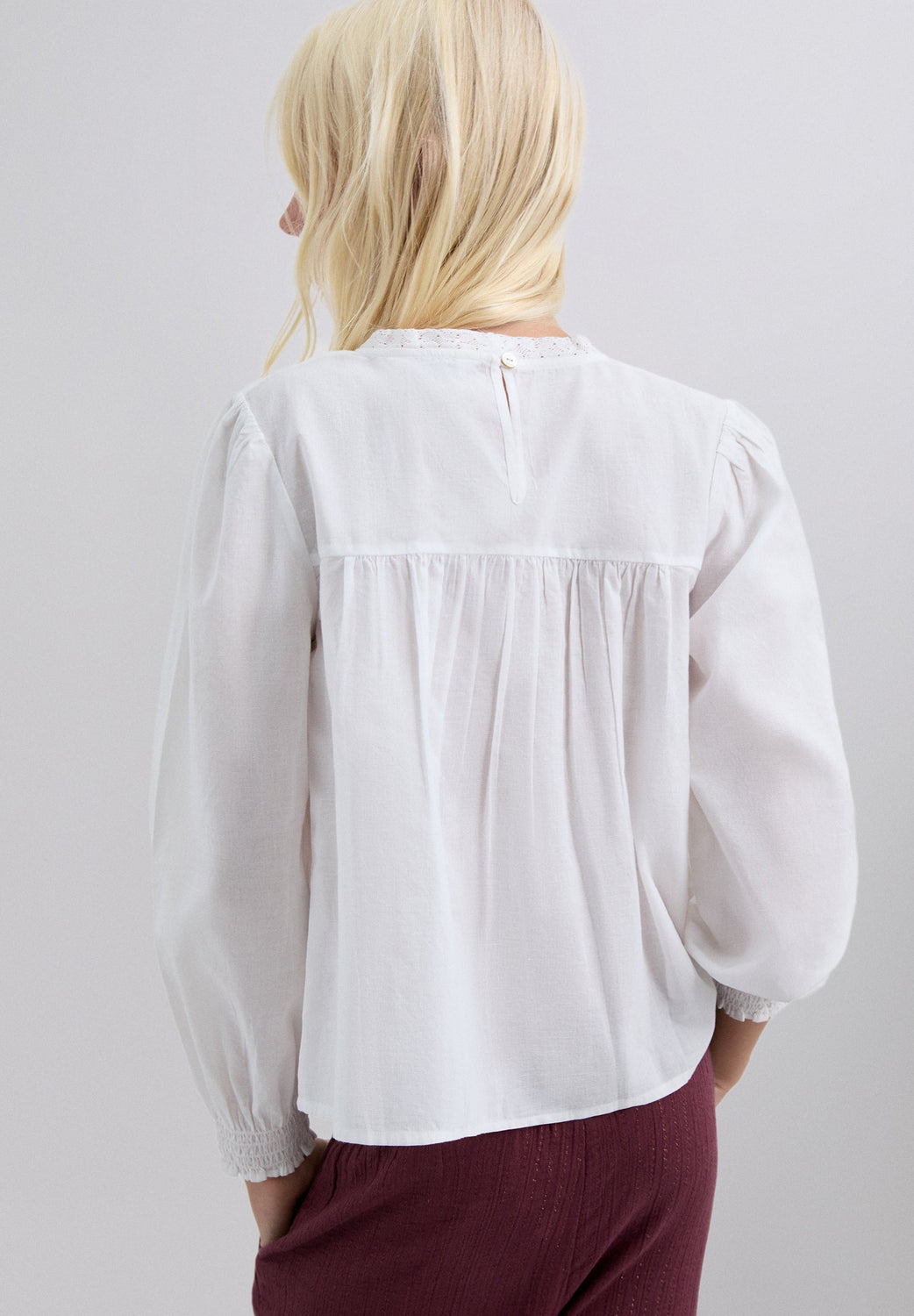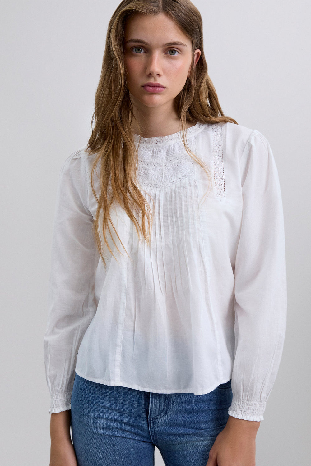 Blusa confecionada em tecido 100% algodão BCI. Regular fit. Decote redondo. Manga comprida abalonada terminada em elástico. Pormenor metálico de skull na cintura. Pormenores de bordados na gola e à frente. Fecho atrás com botão.