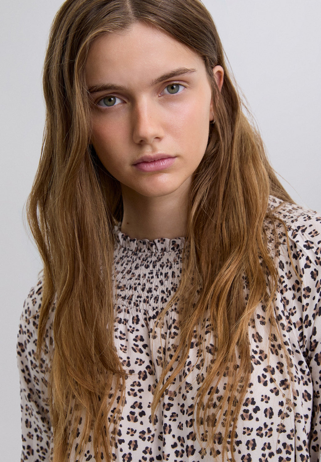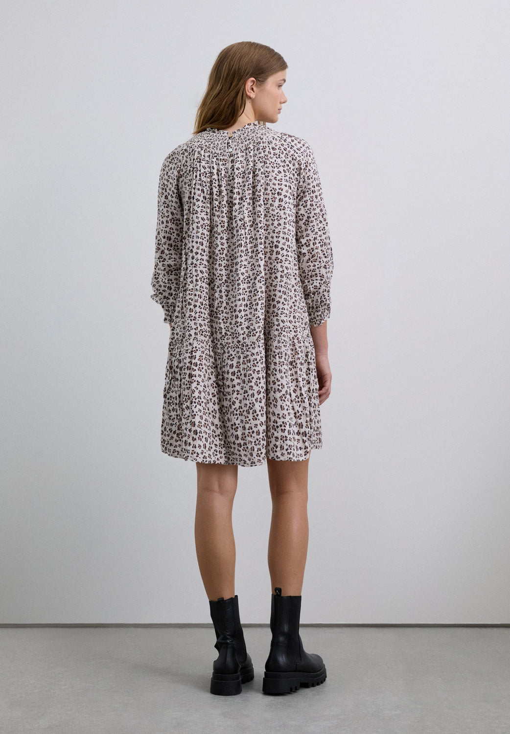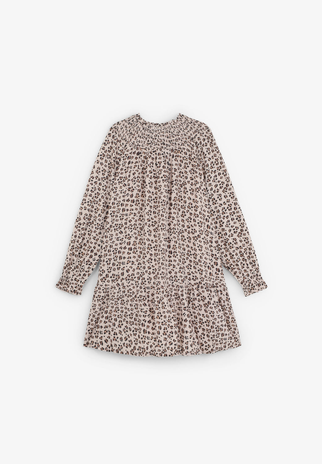 Vestido estampado animal em padrão. Manga comprida ligeiramente abalonada. Gola favos de mel e fecho com botão.