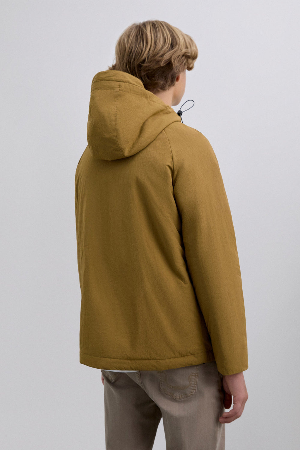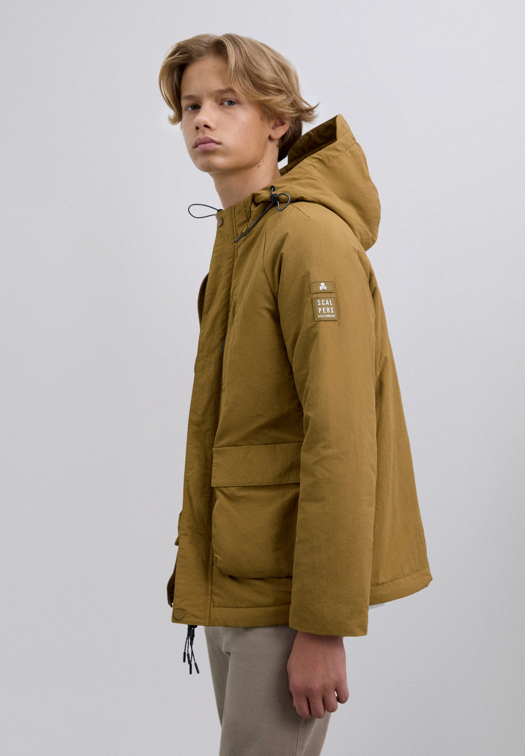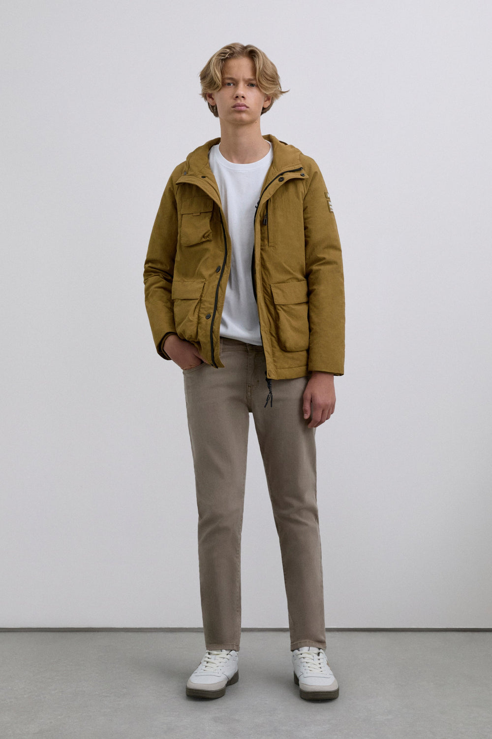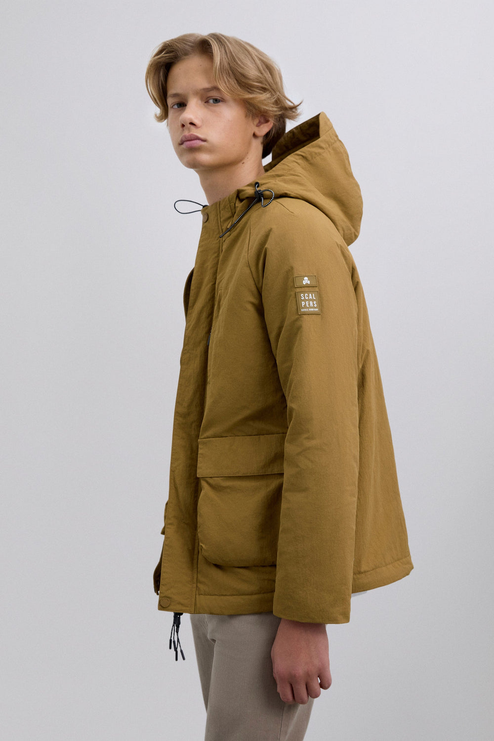 Cardigan de manga comprida com capuz ajustável com cordões. Quatro bolsos frontais, dois no peito e dois inferiores com placket. Fecho à frente com botões e zip. Pormenor de remendo efeito de caucho em contraste com logótipo e skull na manga.