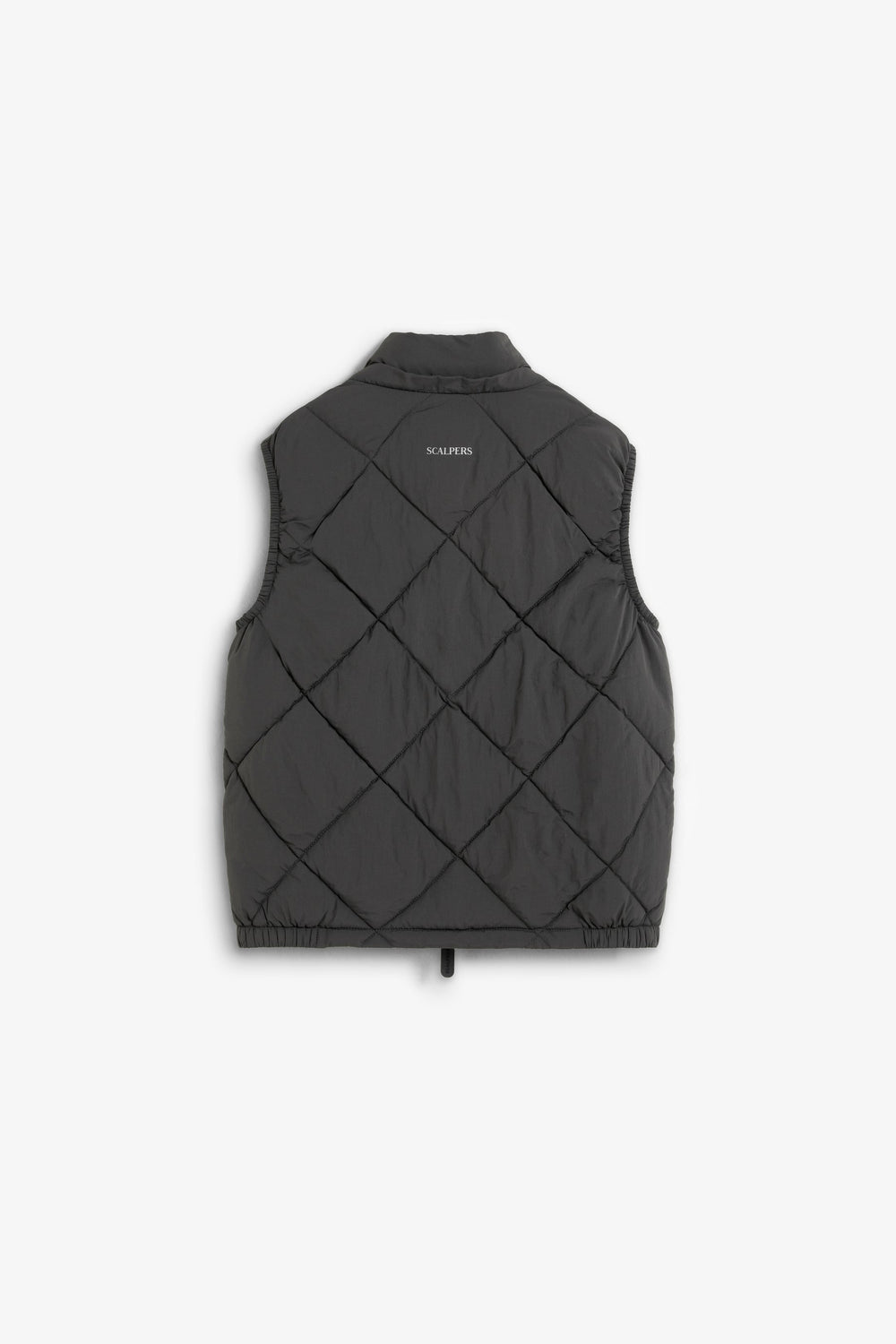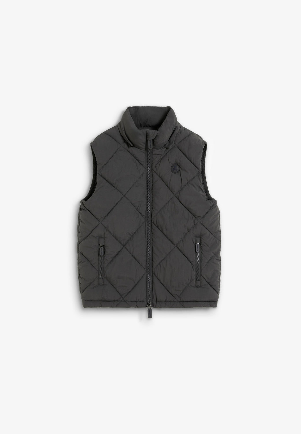 Colete resistente acolchoado com capuz ajustável. Fecho com zip de cursor duplo. Pormenor de skull com efeito de caucho no peito. Bolsos com fecho de correr e bolso interior