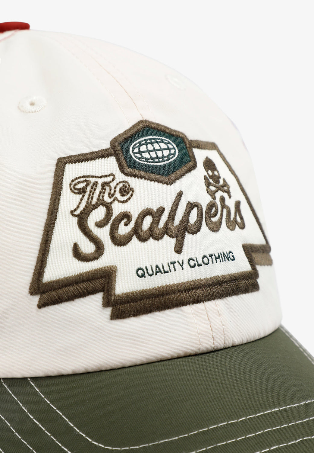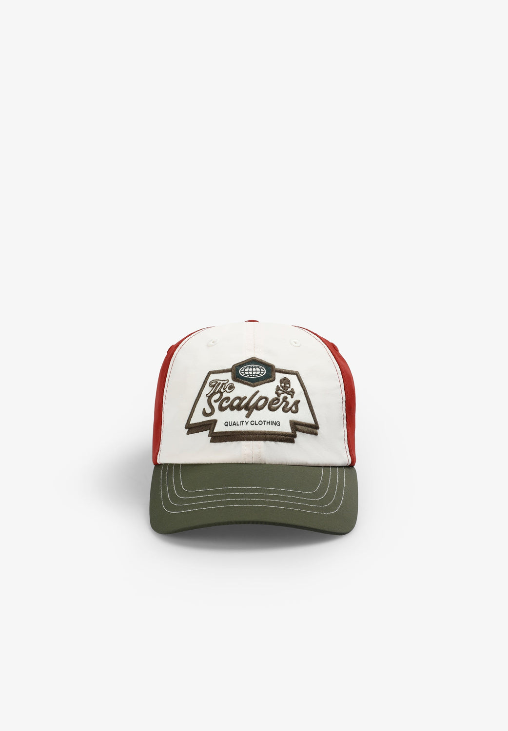 Boné tricolor confecionado em nylon. Fecho ajustável traseiro e bordado à frente com logótipo e skull em contraste. Pormenor de etiqueta com logótipo na parte de atrás.
