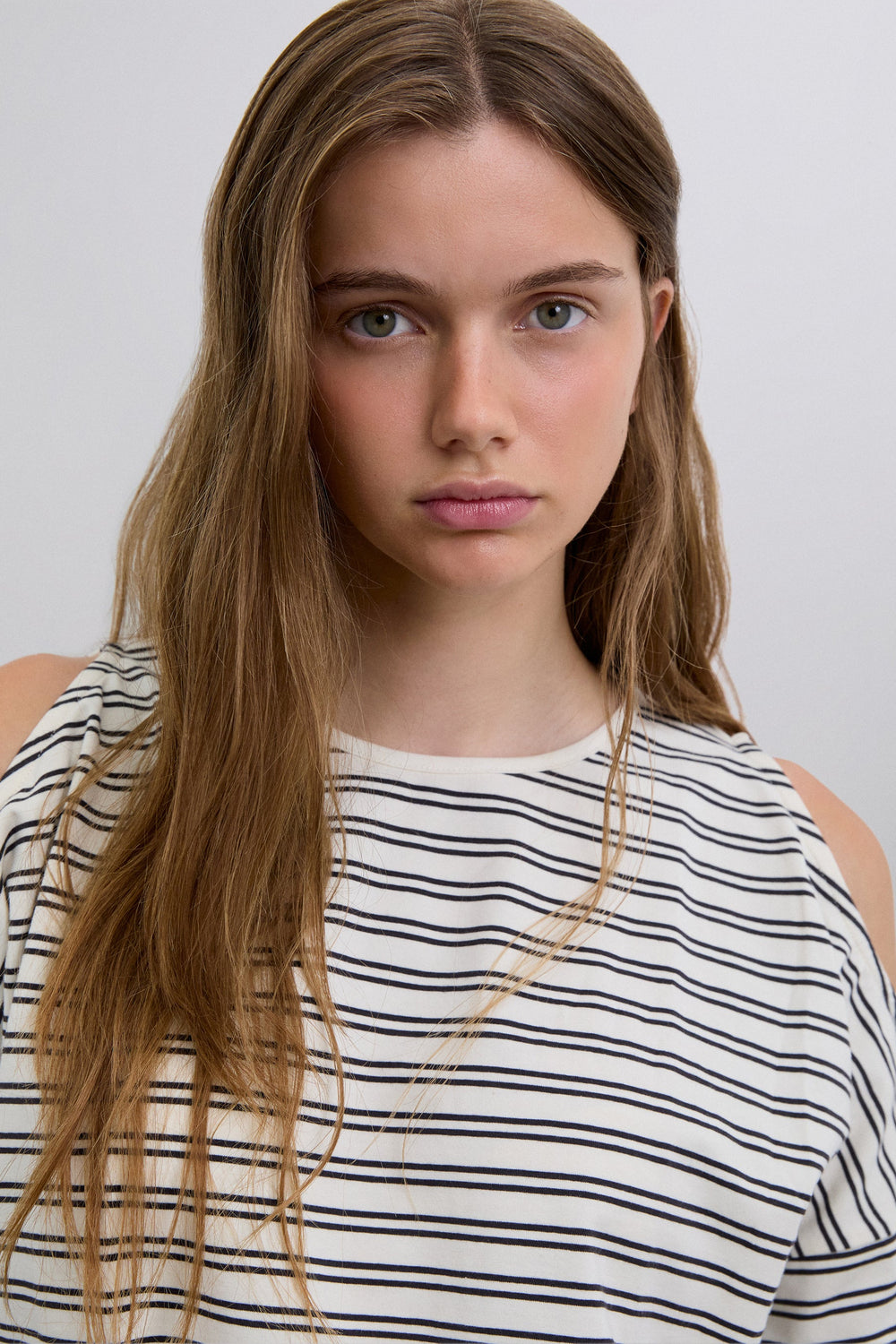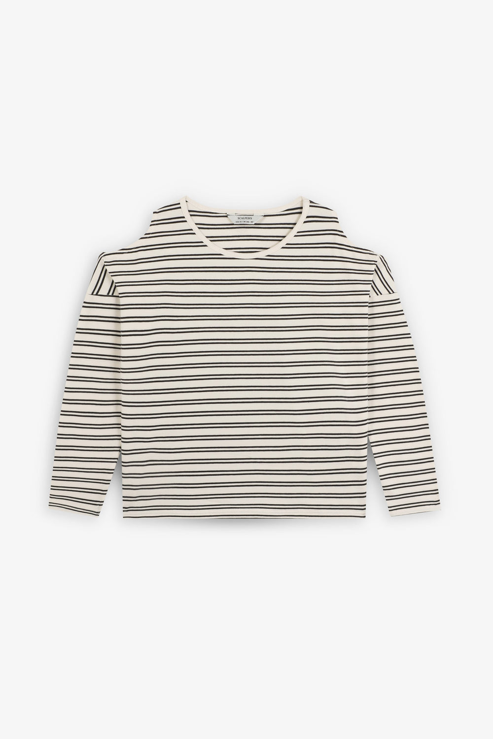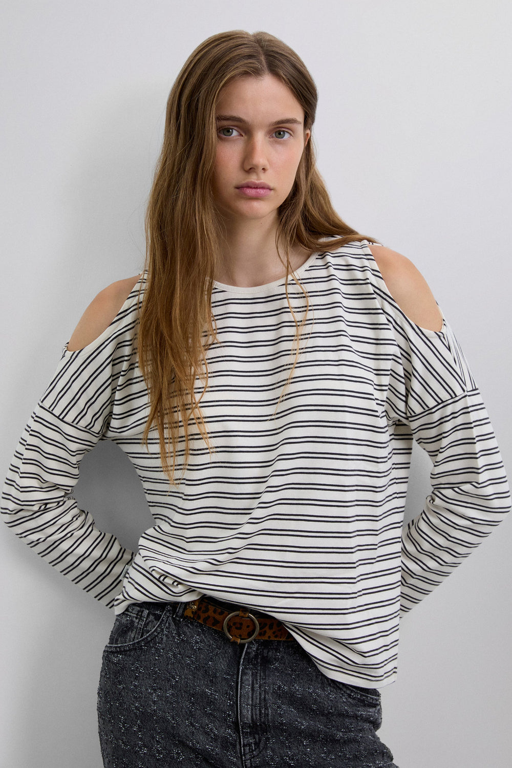 T-shirt confecionada em algodão BCI. Regular fit. Padrão às riscas. Decote redondo. Manga comprida com abertura nos ombros. Pormenor de skull com tachas atrás.
