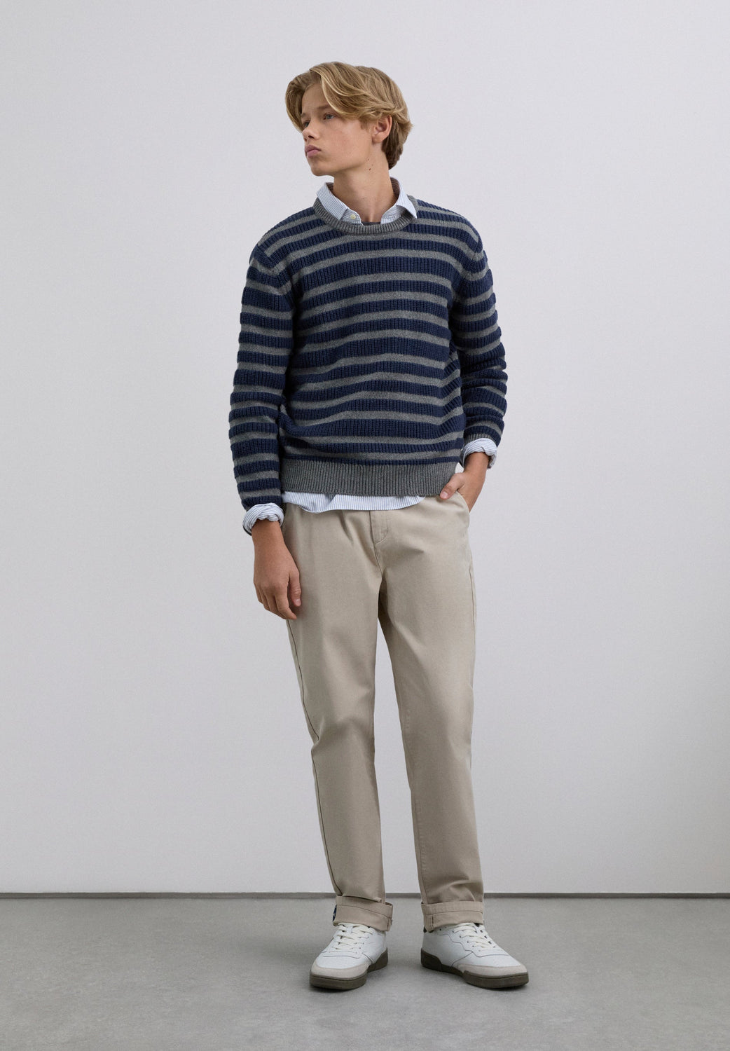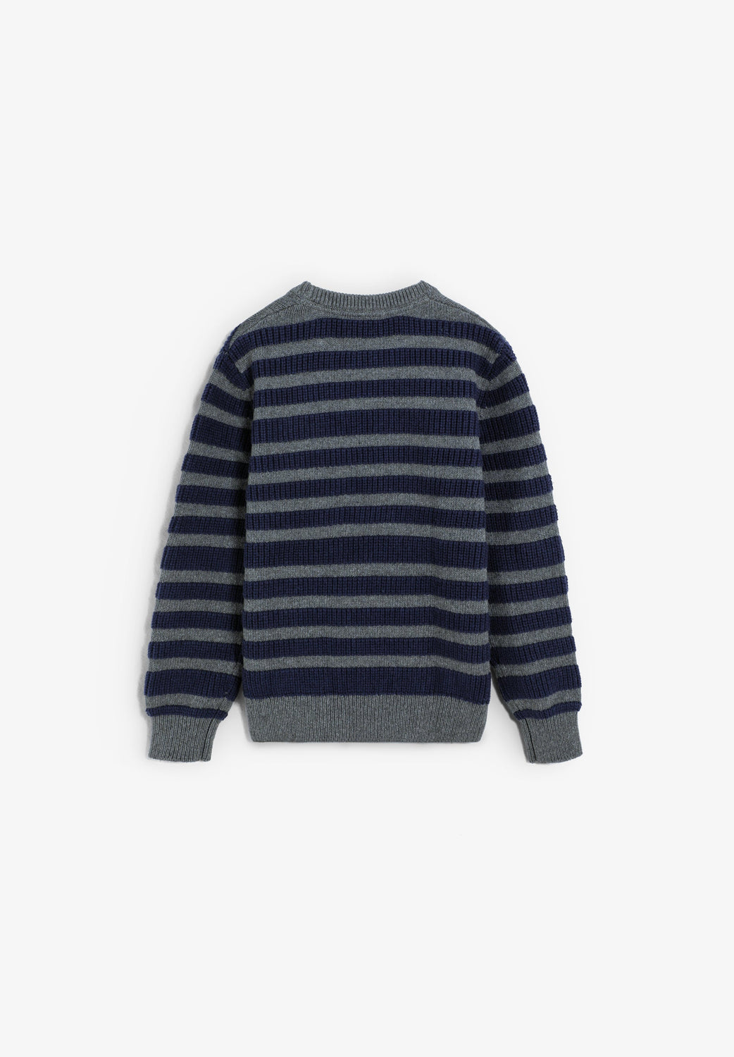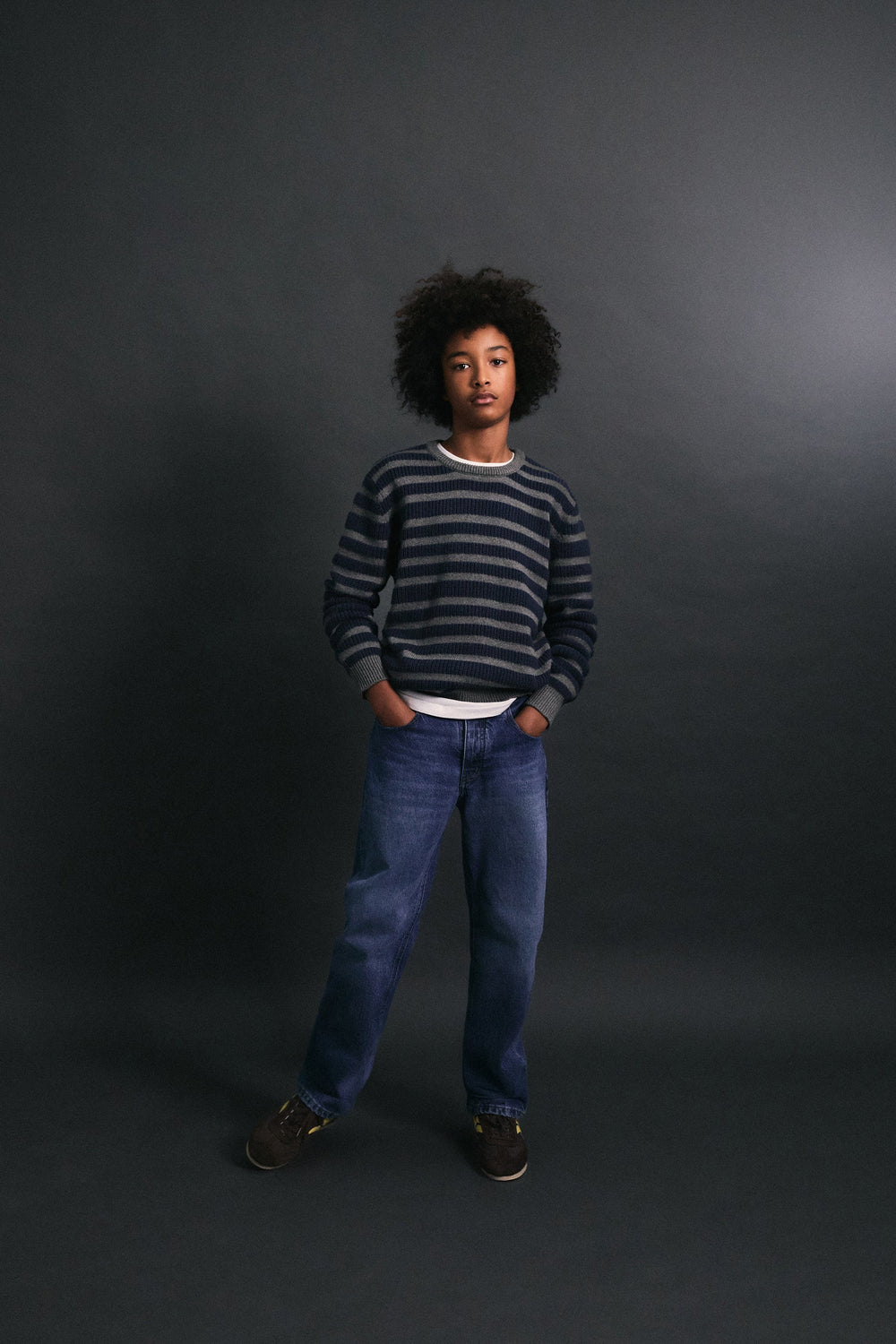Sweater confecionada em 100% algodão BCI. Padrão às riscas. Decote redondo. Manga comprida. Acabamentos em nervuras.