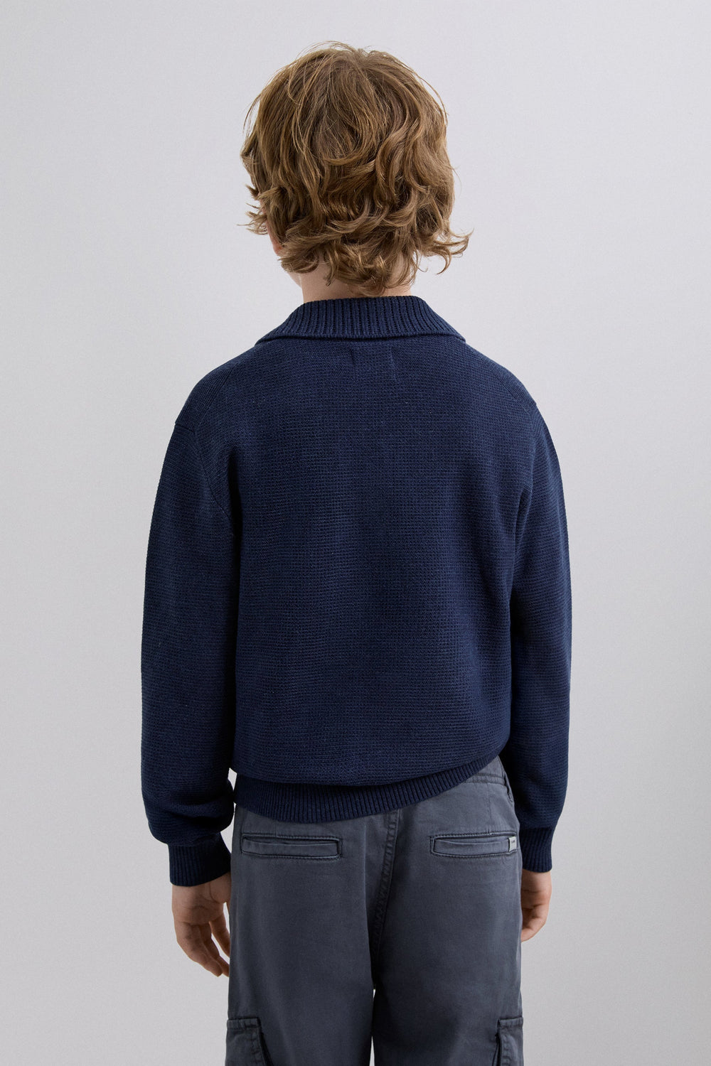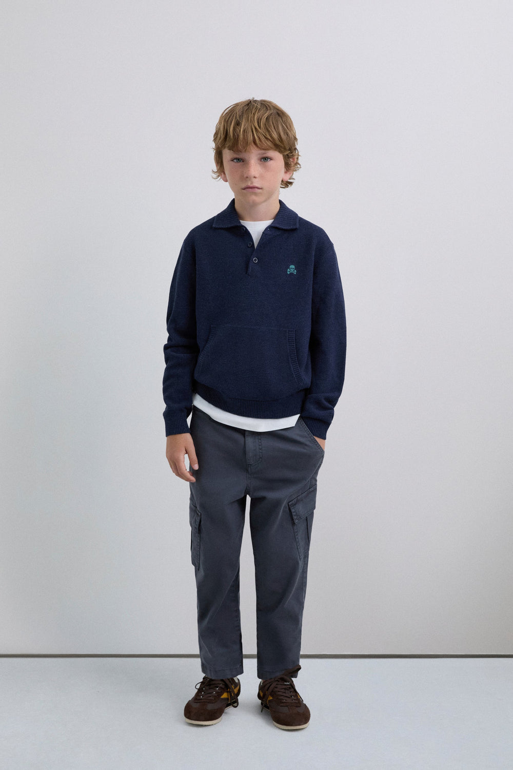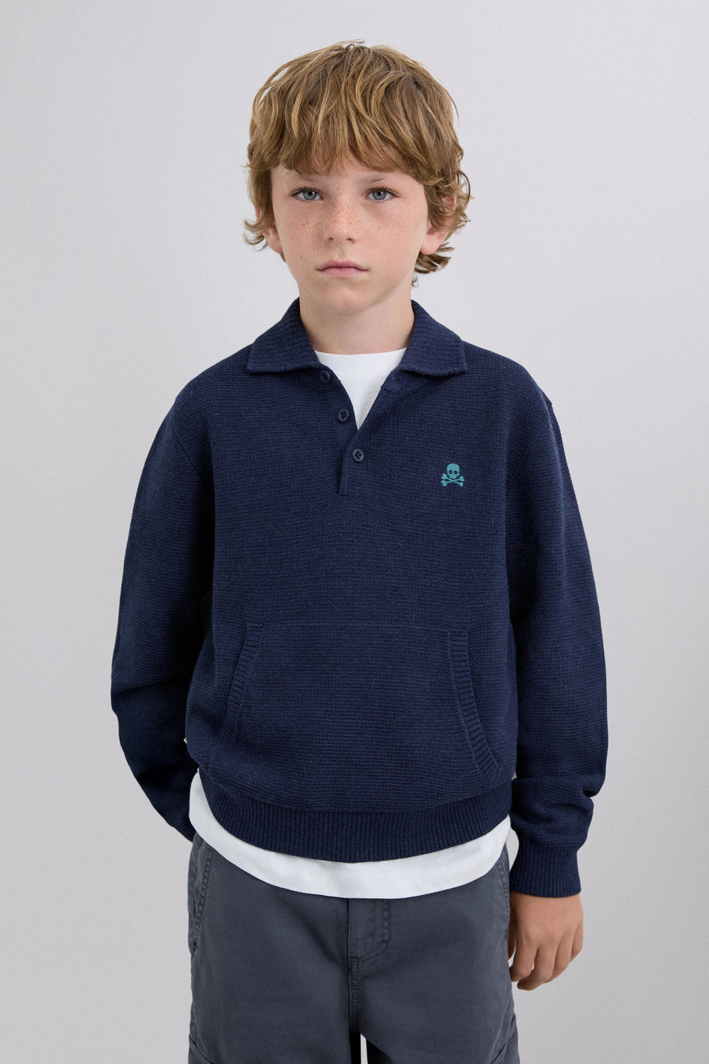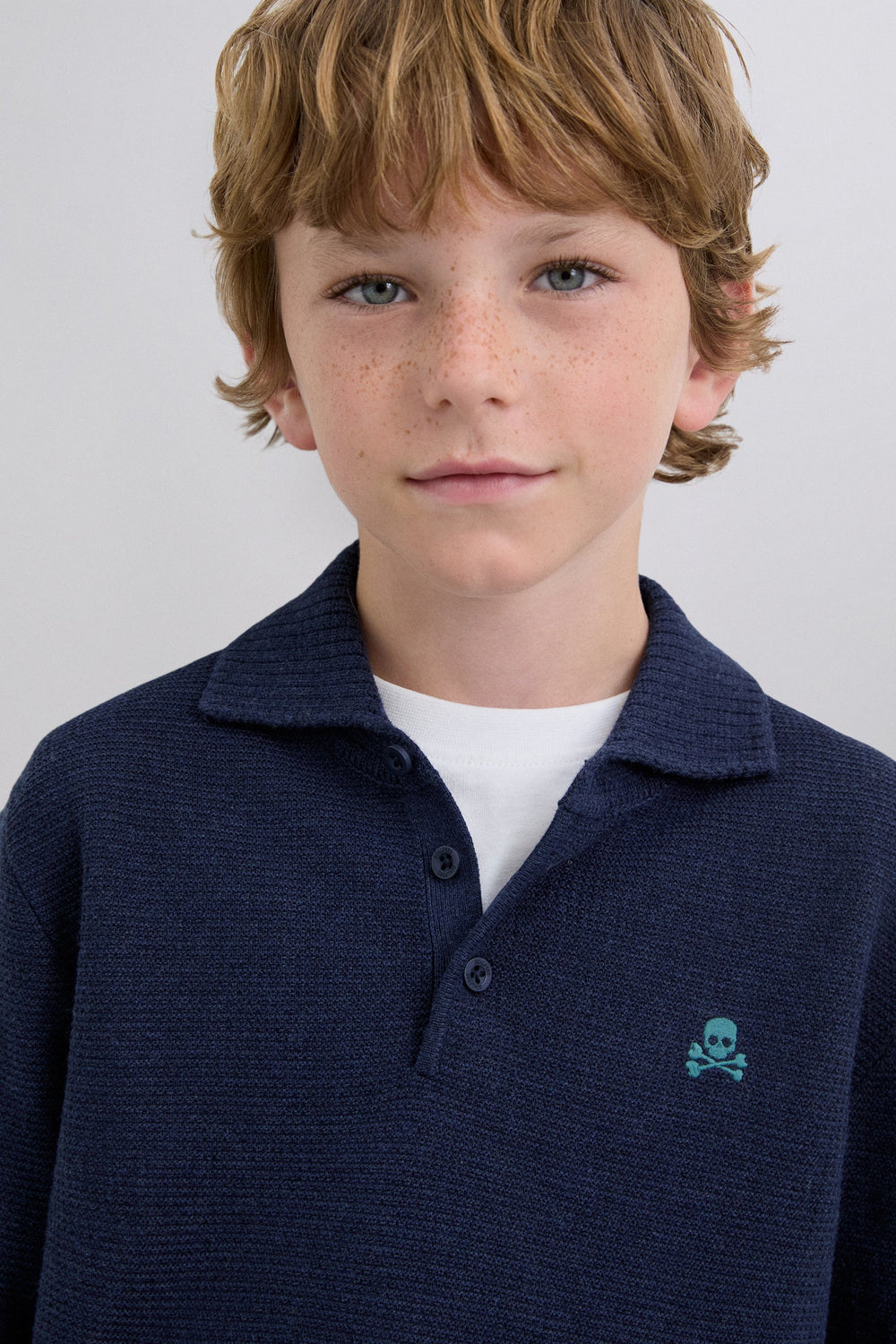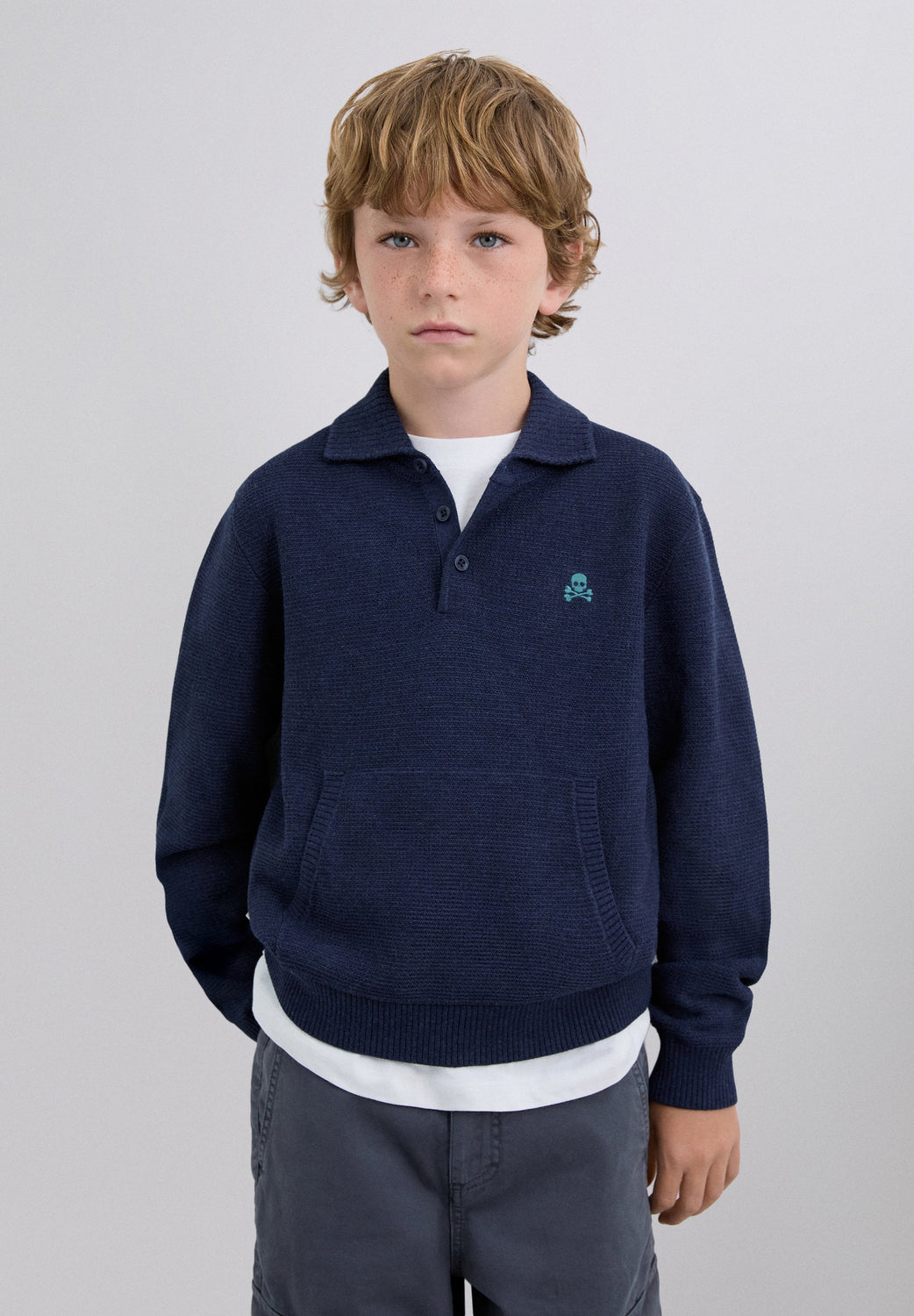 Sweater de malha. Gola de camisa polo. Manga comprida. Abotoadura na gola. Logótipo bordado em contraste.