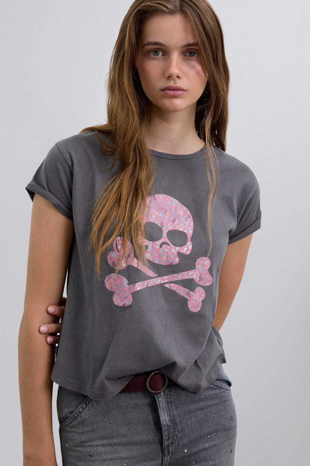T-shirt confecionada em 100% algodão BCI. Corte regular fit, decote redondo e manga curta. Pormenor de skull frontal em contraste.