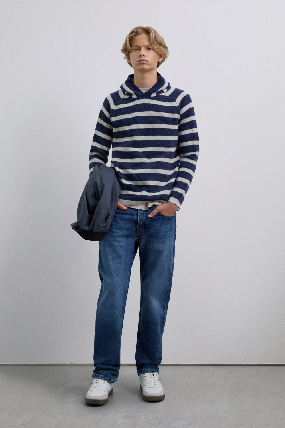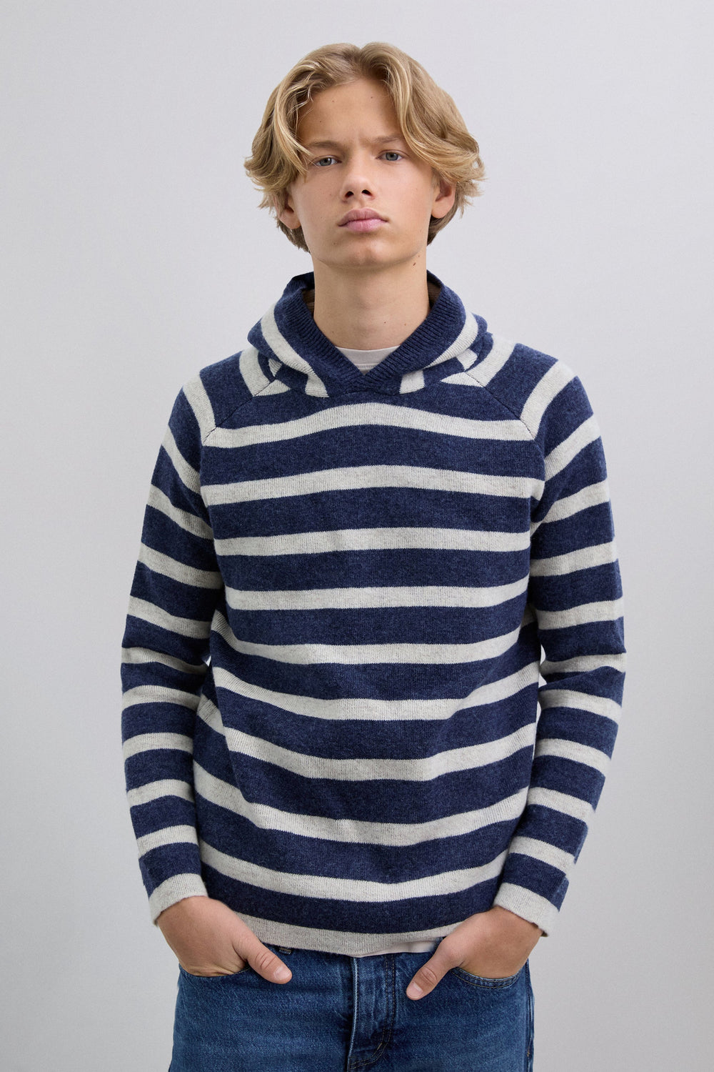 Sweater de malha com capuz. Padrão às riscas. Manga comprida. Skull bordada em contraste na cintura.