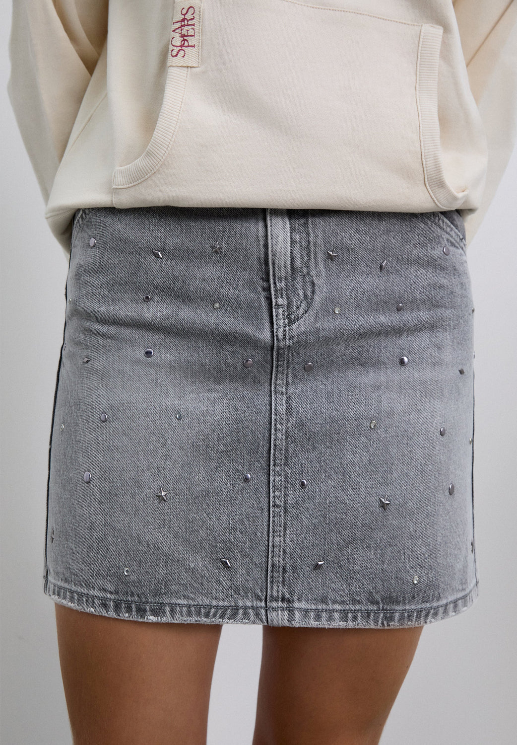 Minissaia denim confecionada em 100% algodão BCI. Pormenor de tachas. Fecho com botão e zip. Presilhas na cintura. Dois bolsos à frente e atrás.