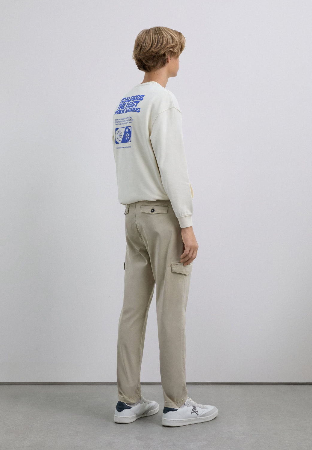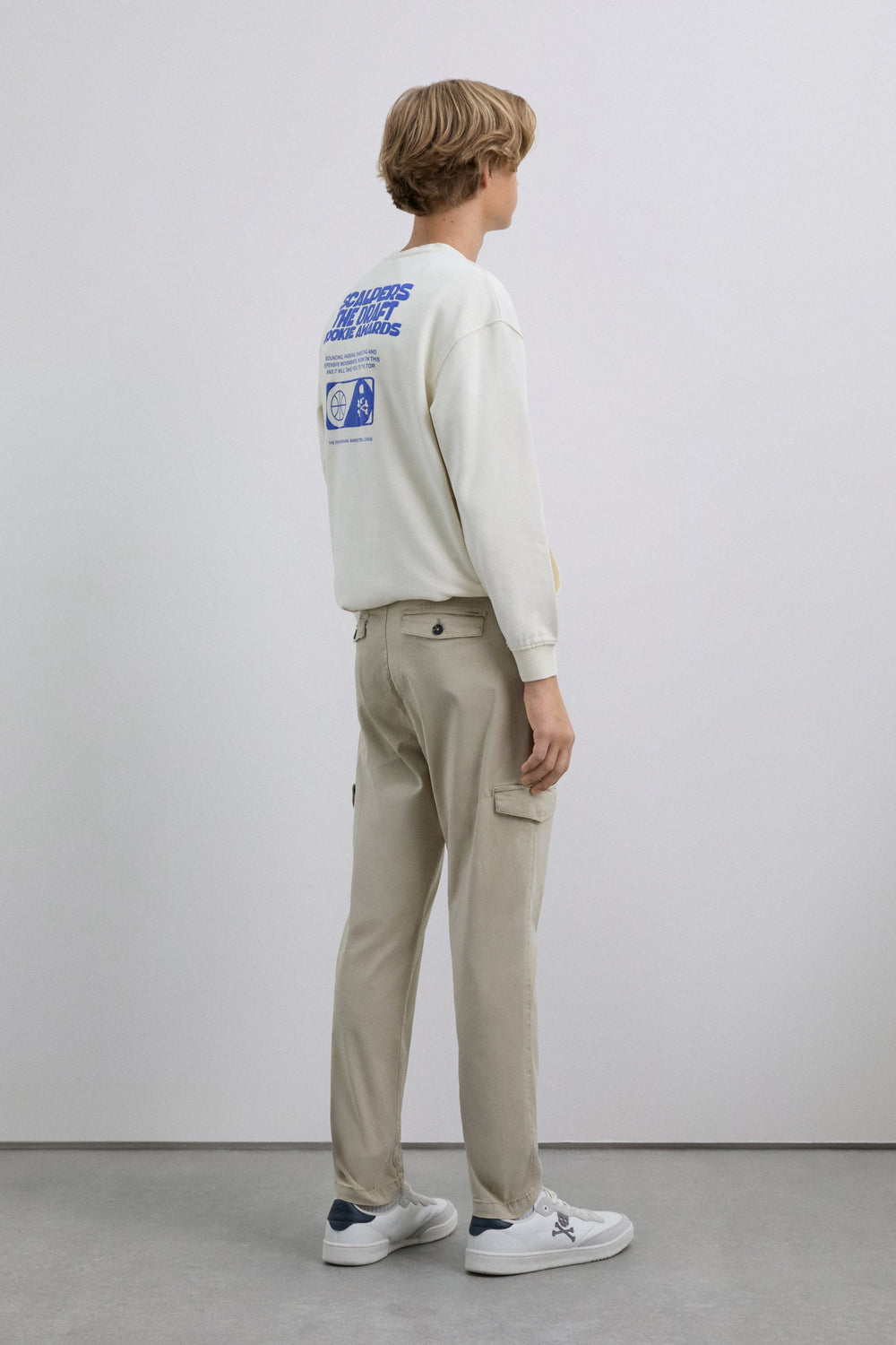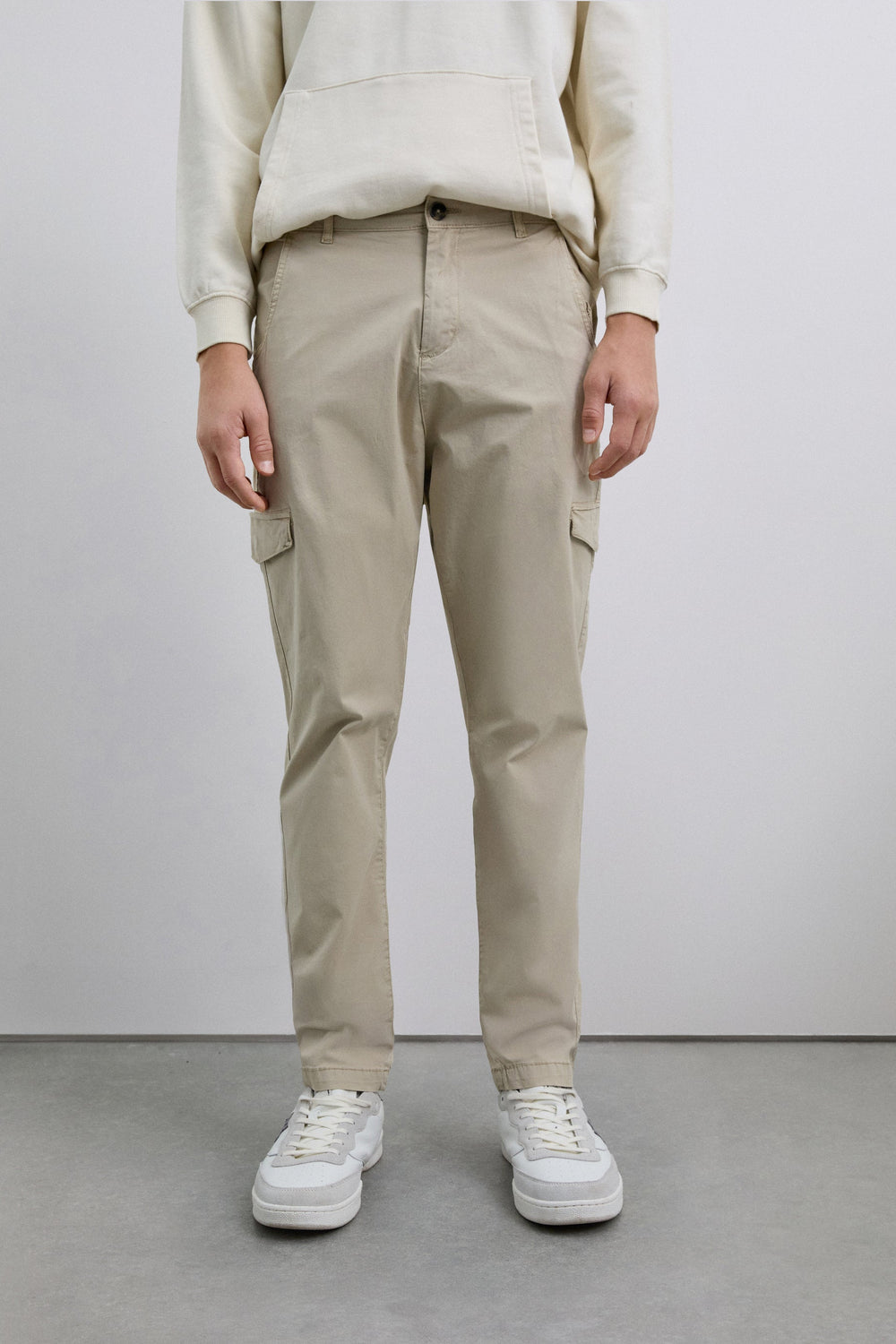 Calças cargo confecionadas em algodão BCI ligeiramente elástico. Regular fit. Fecho com botão e fecho de correr. Bolsos à frente e atrás. Presilhas na cintura e bolsos nas pernas com placket.