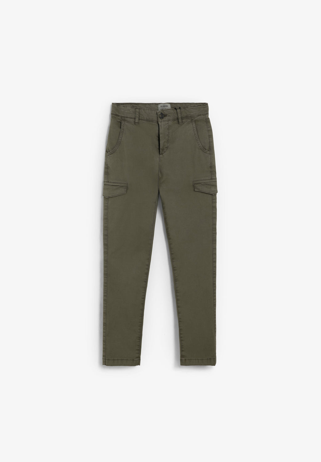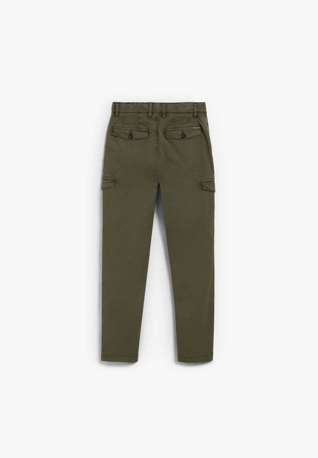 Calças cargo confecionadas em algodão BCI ligeiramente elástico. Regular fit, fecho com botão e zip e bolsos laterais. Presilhas na cintura e bolsos nas pernas com placket.