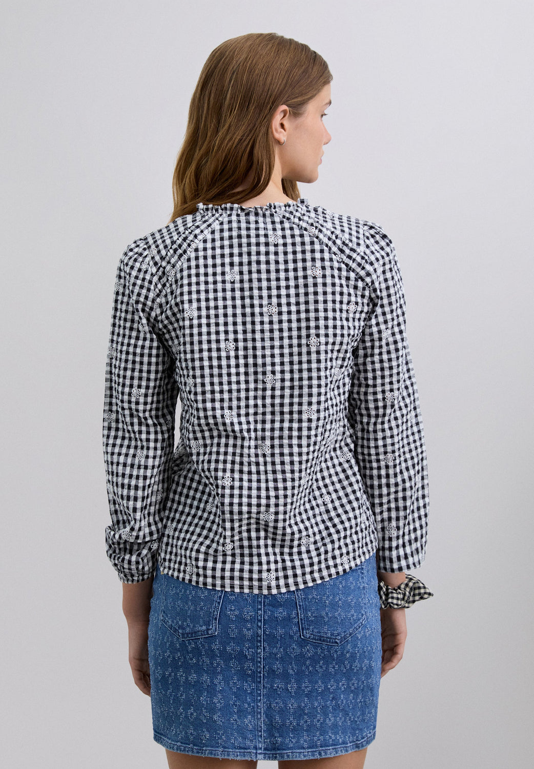 Camisa confecionada em tecido 100% algodão BCI. Manga comprida. Fecho ajustável com laço à frente e botões. Detalhes bordados.