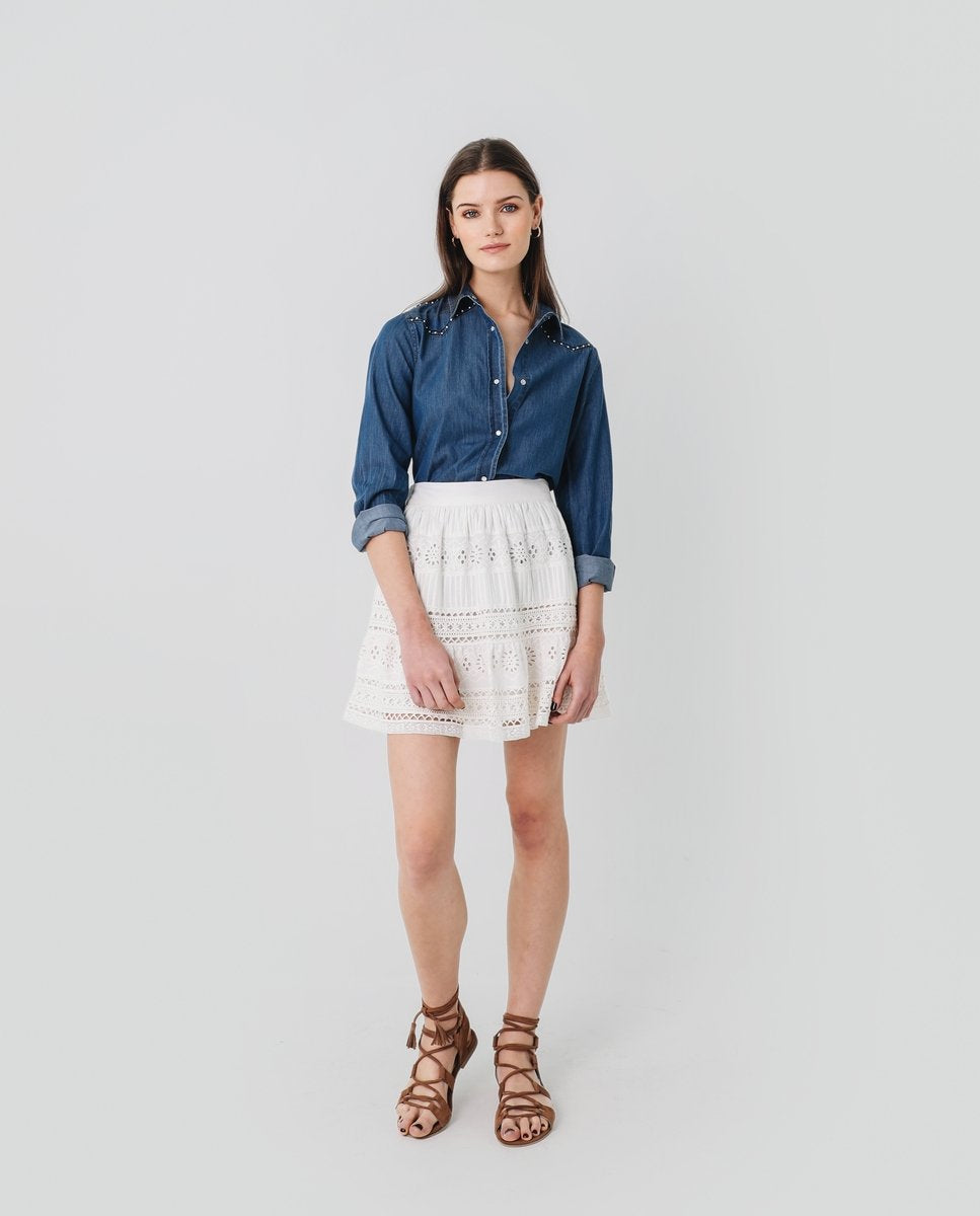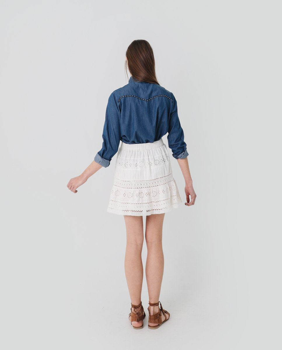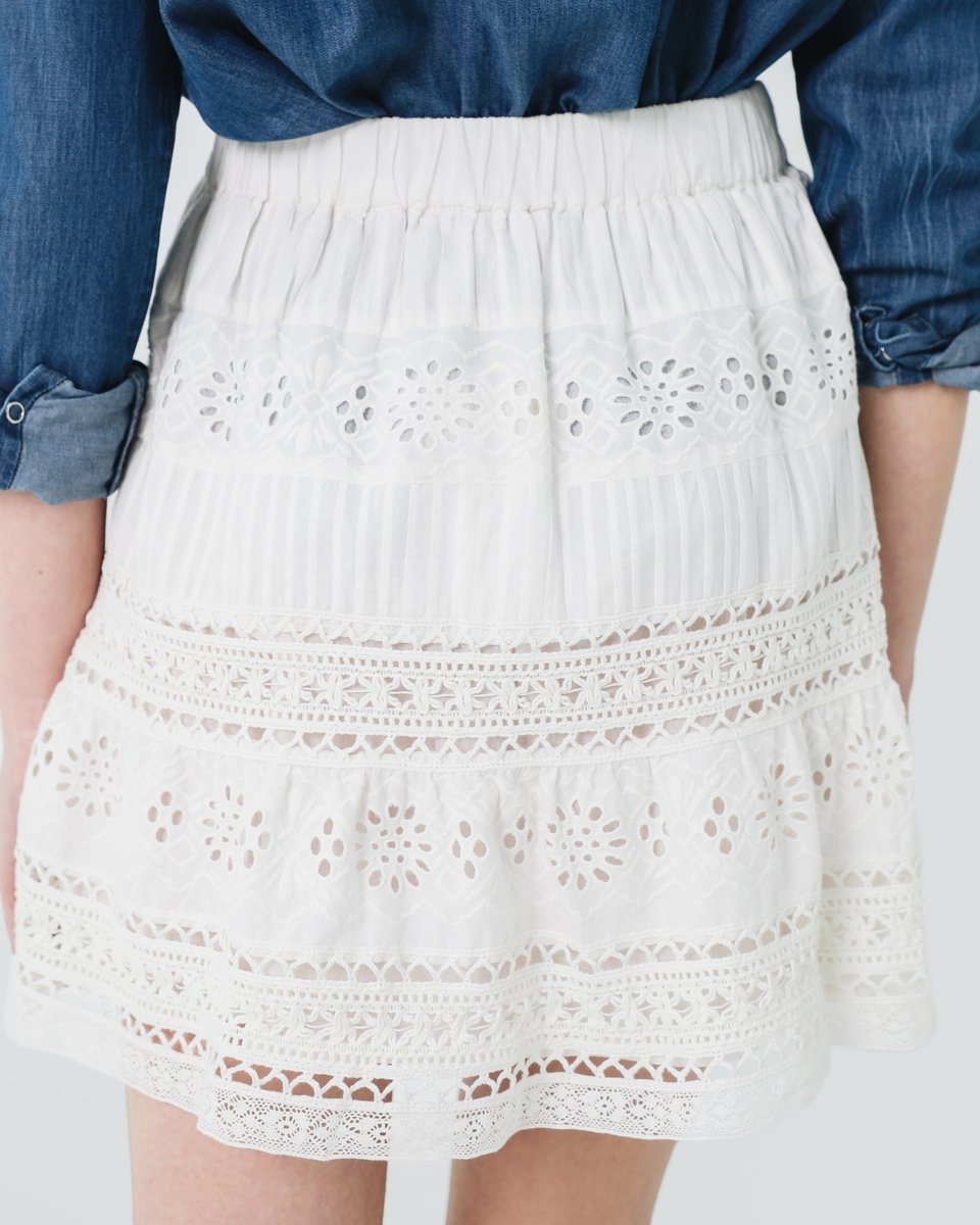 Falda mini con bordado inglés, confeccionada en tejido 100% algodón. Corte acampanado con cinturilla con elástico. Presenta como detalle el volante en el bajo.