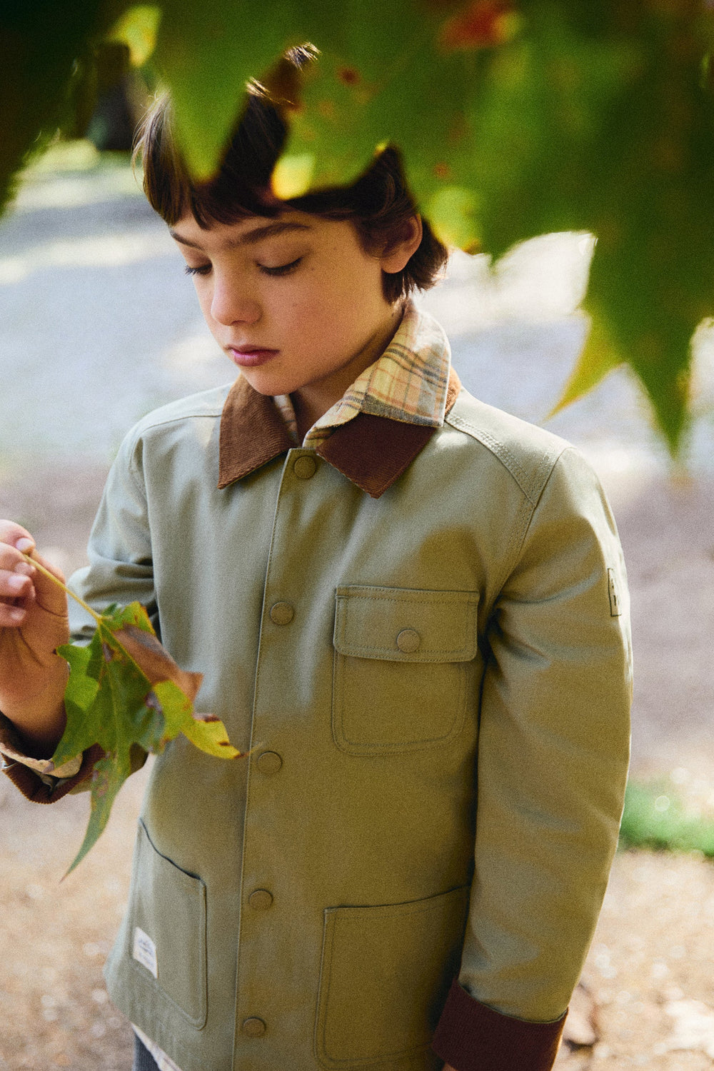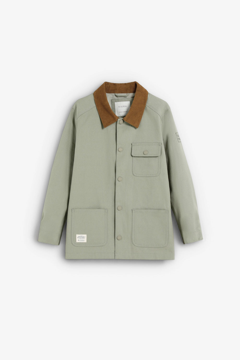 Casaco confecionado em 100% algodão BCI. Gola camiseiro em contraste. Manga comprida. Fecho com botão e zip. Bolsos frontais e no peito com fecho com botão. Pormenor de etiqueta com logótipo no bolso frontal.