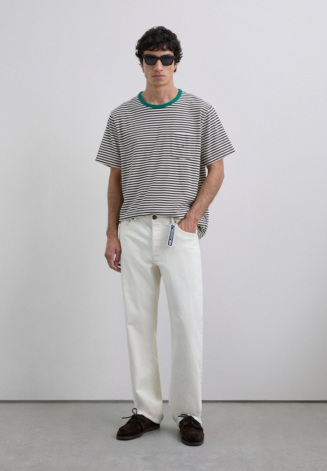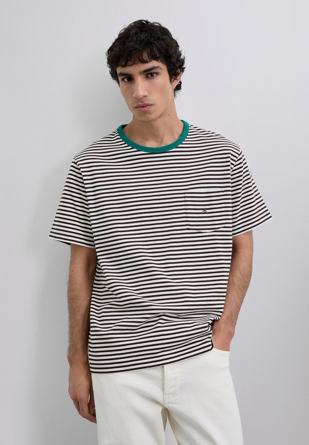 T-shirt confecionada em 100% algodão BCI. Padrão às riscas. Manga curta. Decote redondo em contraste. Pormenor de bolso no peito. Logótipo bordado.