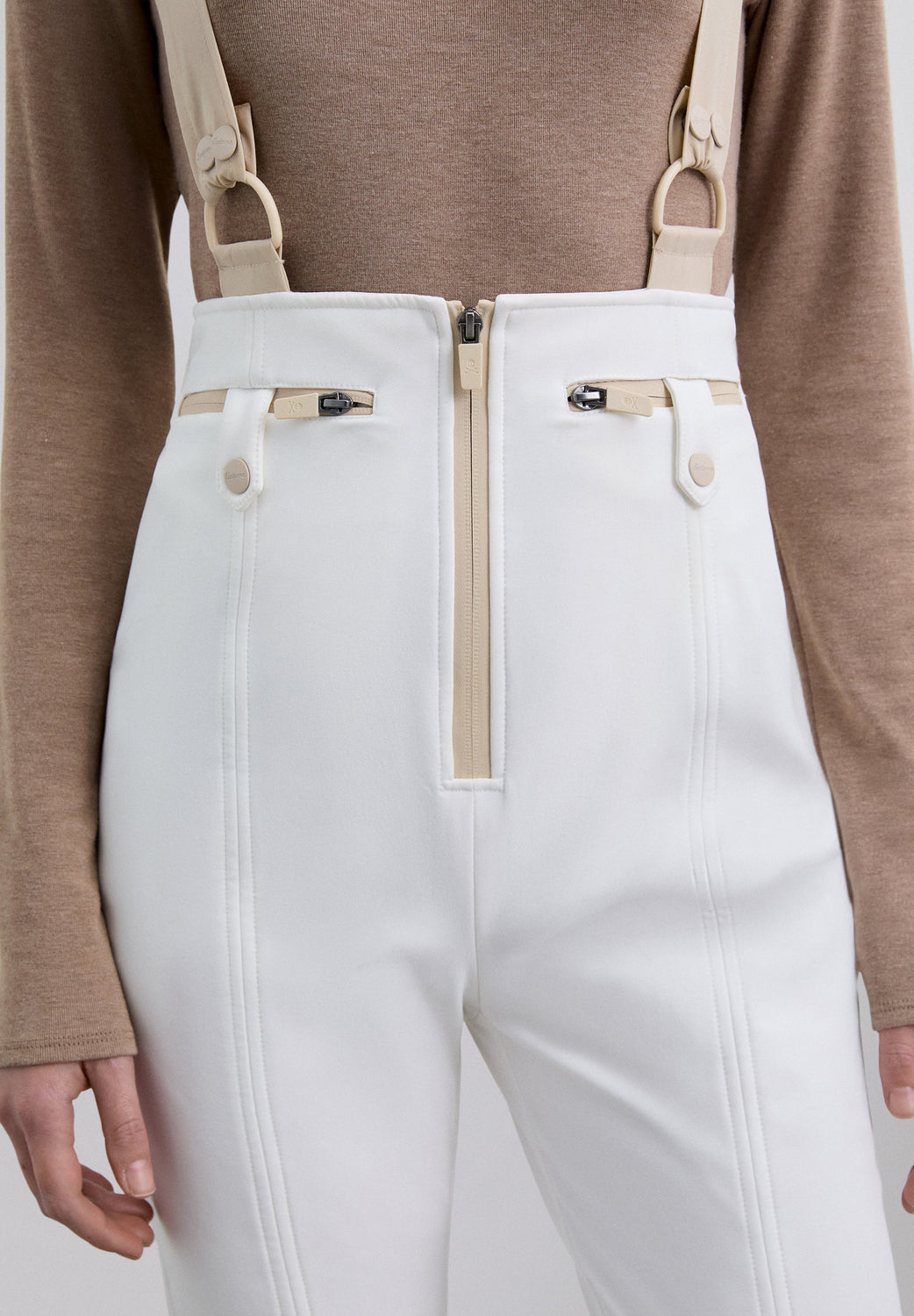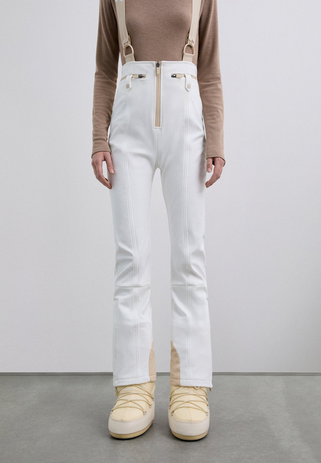 Calças de esqui com suspensórios confecionadas em tecido técnico, de cintura subida e com fecho de correr frontal centrado. Os suspensórios são amplos e ajustáveis, com pormenores de logótipo. Com bolsos à frente com fecho de correr e fecho de pressão. A bainha incorpora fechos de correr laterais e uma camada interior ajustada. Com pormenores em contraste.
